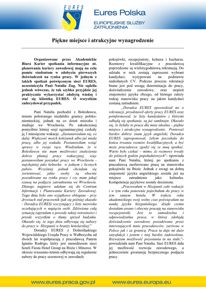 Piękne miejsce i atrakcyjne wynagrodzenie Organizowane przez Akademickie Biura Karier spotkania informacyjne nt. planowania kariery zawodowej mają na celu pomóc studentom w zdobyciu pierwszych doświadczeń na rynku pracy. W jednym z takich spotkań poświęconym sieci EURES, uczestniczyła Pani Natalia Zug. Nie sądziła jednak wówczas, że tak szybko przyjdzie jej praktycznie wykorzystać zdobytą wiedzę i stać się klientką EURES. O wszystkim zadecydował przypadek. Pani Natalia pochodzi z Bolesławca, miasta położonego niedaleko granicy polskoniemieckiej, jednak na co dzień mieszka i studiuje we Wrocławiu. Po zakończonej pomyślnie letniej sesji egzaminacyjnej czekały ją 3 miesięczne wakacje. „Zastanawiałam się, co dalej. Większość moich koleżanek albo już miała pracę, albo jej szukała. Postanowiłam wziąć sprawy w swoje ręce. Wiedziałam, że w Bolesławcu nie mam możliwości znalezienia dobrze płatnej pracy wakacyjnej, więc postanowiłam poszukać pracy we Wrocławiu najchętniej jako kelnerka w jednym z licznych pubów. Wcześniej jednak chciałam się zorientować, jakie osoby są obecnie poszukiwane na rynku pracy i czy mam jakąś szansę na podjęcie zatrudnienia we Wrocławiu. Dlatego najpierw udałam się do Centrum Informacji i Planowania Kariery Zawodowej. Tego dnia było ono wyjątkowo oblegane - przy drzwiach stał pracownik (jak się później okazało - Doradca EURES) wyczytujący z listy nazwiska oczekujących w napięciu osób. Zdziwiona całą sytuacją zapytałam o powody takiej ostrożności i przede wszystkim o tłumy sprzed budynku. Okazało się, że tego dnia odbywają się nabory do pracy w Hiszpanii w branży hotelarskiej.” Doradcy EURES z Dolnośląskiego Wojewódzkiego Urzędu Pracy w Wałbrzychu od dwóch lat współpracują z pracodawcą Panem Ignatio Rodrigo, który jest menedżerem sieci hoteli Fiesta Hotel Group na Ibizie i Minorce. W okresie wiosenno-letnim odbywają się regularnie nabory do pracy sezonowej w zawodach: pokojówki, recepcjonisty, kelnera i kucharza. Rozmowy kwalifikacyjne z pracodawcą poprzedzone są wielotygodniową rekrutacją. Do udziału w nich zostają zaproszeni wybrani kandydaci, wytypowani na podstawie nadesłanych CV. Podczas procesu rekrutacji brana jest pod uwagę determinacja do pracy, doświadczenie zawodowe, oraz stopień znajomości języka obcego, od którego zależy rodzaj stanowiska pracy na jakim kandydaci zostaną zatrudnieni. „Doradca EURES opowiedział mi o rekrutacji, przedstawił oferty pracy EURES oraz poinformował, że listy kandydatów z którymi odbędą się spotkania, są już zamknięte. Okazało się, że byłaby to praca dla mnie idealna – piękne miejsce i atrakcyjne wynagrodzenie. Ponieważ bardzo dobrze znam język angielski, Doradca EURES zaproponował, żebym poczekała do końca trwania rozmów kwalifikacyjnych, a być może pracodawca zgodzi się ze mną spotkać. Warto było czekać – mimo, że rozmowy trwały do późnych godzin popołudniowych”- opowiada nam Pani Natalia, której po spotkaniu z pracodawcą zaoferowano pracę na stanowisku pokojówki na Ibizie. Jednak z uwagi na dobrą znajomość języka angielskiego została już na miejscu zatrudniona jako kelnerka. Kompetencje językowe zostały docenione. „Pracowałam w Hiszpanii całe wakacje i w tym roku ponownie pojechałam do pracy w tym samym hotelu. W trakcie roku akademickiego swój wolny czas poświęcałam na naukę języka hiszpańskiego, dzięki czemu dostałam awans i obecnie pracuję na stanowisku recepcjonistki. Jest to samodzielna i odpowiedzialna praca, w której zdobędę doświadczenie zawodowe poszukiwane przez interesujących mnie pracodawców, zarówno w Polsce jak i za granicą. Praca ta daje mi dużo satysfakcji i jestem z niej bardzo zadowolona. Rozważam możliwość pozostania tu na stałe.”powiedziała nam Pani Natalia. Sieć EURES dała jej możliwość rozwoju zawodowego, a jednocześnie gwarancję bezpiecznego podjęcia pracy.