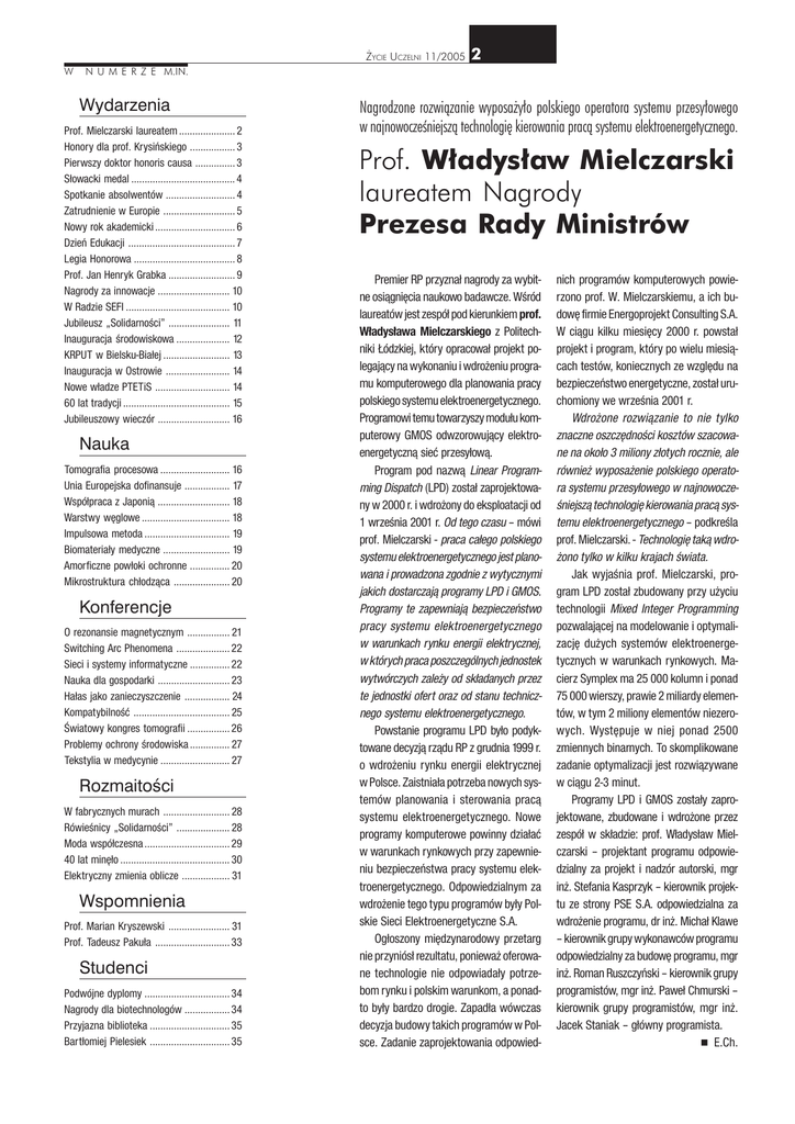 ŻYCIE UCZELNI 11/2005 W 2 N U M E R Z E M.IN. Wydarzenia Prof. Mielczarski laureatem ..................... 2 Honory dla prof. Krysiñskiego ................. 3 Pierwszy doktor honoris causa ............... 3 S³owacki medal ....................................... 4 Spotkanie absolwentów .......................... 4 Zatrudnienie w Europie ........................... 5 Nowy rok akademicki .............................. 6 Dzieñ Edukacji ........................................ 7 Legia Honorowa ...................................... 8 Prof. Jan Henryk Grabka ......................... 9 Nagrody za innowacje ........................... 10 W Radzie SEFI ....................................... 10 Jubileusz „Solidarnoœci” ....................... 11 Inauguracja œrodowiskowa .................... 12 KRPUT w Bielsku-Bia³ej ......................... 13 Inauguracja w Ostrowie ........................ 14 Nowe w³adze PTETiS ............................ 14 60 lat tradycji ........................................ 15 Jubileuszowy wieczór ........................... 16 Nauka Tomografia procesowa .......................... 16 Unia Europejska dofinansuje ................. 17 Wspó³praca z Japoni¹ ........................... 18 Warstwy wêglowe ................................. 18 Impulsowa metoda ................................ 19 Biomateria³y medyczne ......................... 19 Amorficzne pow³oki ochronne ............... 20 Mikrostruktura ch³odz¹ca ..................... 20 Konferencje O rezonansie magnetycznym ................ 21 Switching Arc Phenomena .................... 22 Sieci i systemy informatyczne ............... 22 Nauka dla gospodarki ........................... 23 Ha³as jako zanieczyszczenie ................. 24 Kompatybilnoœæ .................................... 25 Œwiatowy kongres tomografii ................ 26 Problemy ochrony œrodowiska ............... 27 Tekstylia w medycynie .......................... 27 Rozmaitości W fabrycznych murach ......................... 28 Rówieœnicy „Solidarnoœci” .................... 28 Moda wspó³czesna ................................ 29 40 lat minê³o ......................................... 30 Elektryczny zmienia oblicze .................. 31 Wspomnienia Prof. Marian Kryszewski ....................... 31 Prof. Tadeusz Paku³a ............................ 33 Studenci Podwójne dyplomy ................................ 34 Nagrody dla biotechnologów ................. 34 Przyjazna biblioteka .............................. 35 Bart³omiej Pielesiek .............................. 35 Nagrodzone rozwiązanie wyposażyło polskiego operatora systemu przesyłowego w najnowocześniejszą technologię kierowania pracą systemu elektroenergetycznego. Prof. Władysław Mielczarski laureatem Nagrody Prezesa Rady Ministrów Premier RP przyzna³ nagrody za wybitne osi¹gniêcia naukowo badawcze. Wœród laureatów jest zespó³ pod kierunkiem prof. W³adys³awa Mielczarskiego z Politechniki £ódzkiej, który opracowa³ projekt polegaj¹cy na wykonaniu i wdro¿eniu programu komputerowego dla planowania pracy polskiego systemu elektroenergetycznego. Programowi temu towarzyszy modu³u komputerowy GMOS odwzorowuj¹cy elektroenergetyczn¹ sieæ przesy³ow¹. Program pod nazw¹ Linear Programming Dispatch (LPD) zosta³ zaprojektowany w 2000 r. i wdro¿ony do eksploatacji od 1 wrzeœnia 2001 r. Od tego czasu – mówi prof. Mielczarski - praca ca³ego polskiego systemu elektroenergetycznego jest planowana i prowadzona zgodnie z wytycznymi jakich dostarczaj¹ programy LPD i GMOS. Programy te zapewniaj¹ bezpieczeñstwo pracy systemu elektroenergetycznego w warunkach rynku energii elektrycznej, w których praca poszczególnych jednostek wytwórczych zale¿y od sk³adanych przez te jednostki ofert oraz od stanu technicznego systemu elektroenergetycznego. Powstanie programu LPD by³o podyktowane decyzj¹ rz¹du RP z grudnia 1999 r. o wdro¿eniu rynku energii elektrycznej w Polsce. Zaistnia³a potrzeba nowych systemów planowania i sterowania prac¹ systemu elektroenergetycznego. Nowe programy komputerowe powinny dzia³aæ w warunkach rynkowych przy zapewnieniu bezpieczeñstwa pracy systemu elektroenergetycznego. Odpowiedzialnym za wdro¿enie tego typu programów by³y Polskie Sieci Elektroenergetyczne S.A. Og³oszony miêdzynarodowy przetarg nie przyniós³ rezultatu, poniewa¿ oferowane technologie nie odpowiada³y potrzebom rynku i polskim warunkom, a ponadto by³y bardzo drogie. Zapad³a wówczas decyzja budowy takich programów w Polsce. Zadanie zaprojektowania odpowied- nich programów komputerowych powierzono prof. W. Mielczarskiemu, a ich budowê firmie Energoprojekt Consulting S.A. W ci¹gu kilku miesiêcy 2000 r. powsta³ projekt i program, który po wielu miesi¹cach testów, koniecznych ze wzglêdu na bezpieczeñstwo energetyczne, zosta³ uruchomiony we wrzeœnia 2001 r. Wdro¿one rozwi¹zanie to nie tylko znaczne oszczêdnoœci kosztów szacowane na oko³o 3 miliony z³otych rocznie, ale równie¿ wyposa¿enie polskiego operatora systemu przesy³owego w najnowoczeœniejsz¹ technologiê kierowania prac¹ systemu elektroenergetycznego – podkreœla prof. Mielczarski. - Technologiê tak¹ wdro¿ono tylko w kilku krajach œwiata. Jak wyjaœnia prof. Mielczarski, program LPD zosta³ zbudowany przy u¿yciu technologii Mixed Integer Programming pozwalaj¹cej na modelowanie i optymalizacjê du¿ych systemów elektroenergetycznych w warunkach rynkowych. Macierz Symplex ma 25 000 kolumn i ponad 75 000 wierszy, prawie 2 miliardy elementów, w tym 2 miliony elementów niezerowych. Wystêpuje w niej ponad 2500 zmiennych binarnych. To skomplikowane zadanie optymalizacji jest rozwi¹zywane w ci¹gu 2-3 minut. Programy LPD i GMOS zosta³y zaprojektowane, zbudowane i wdro¿one przez zespó³ w sk³adzie: prof. W³adys³aw Mielczarski – projektant programu odpowiedzialny za projekt i nadzór autorski, mgr in¿. Stefania Kasprzyk – kierownik projektu z