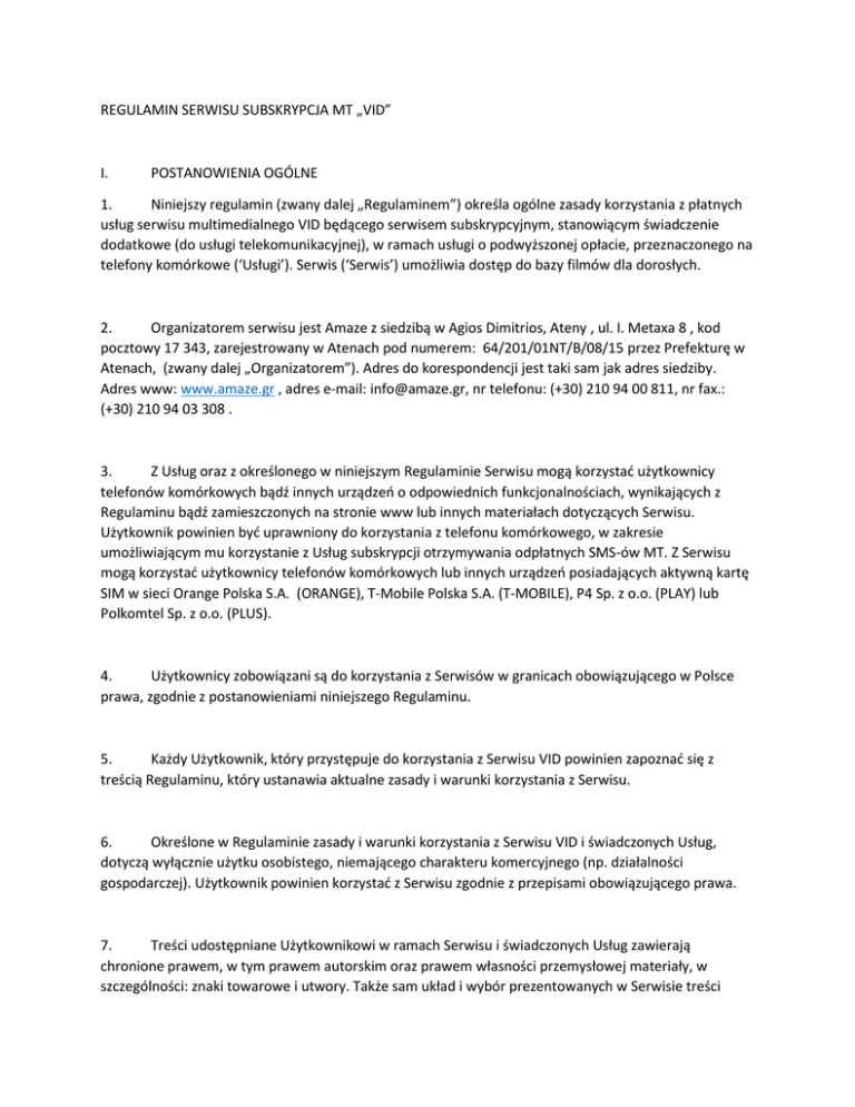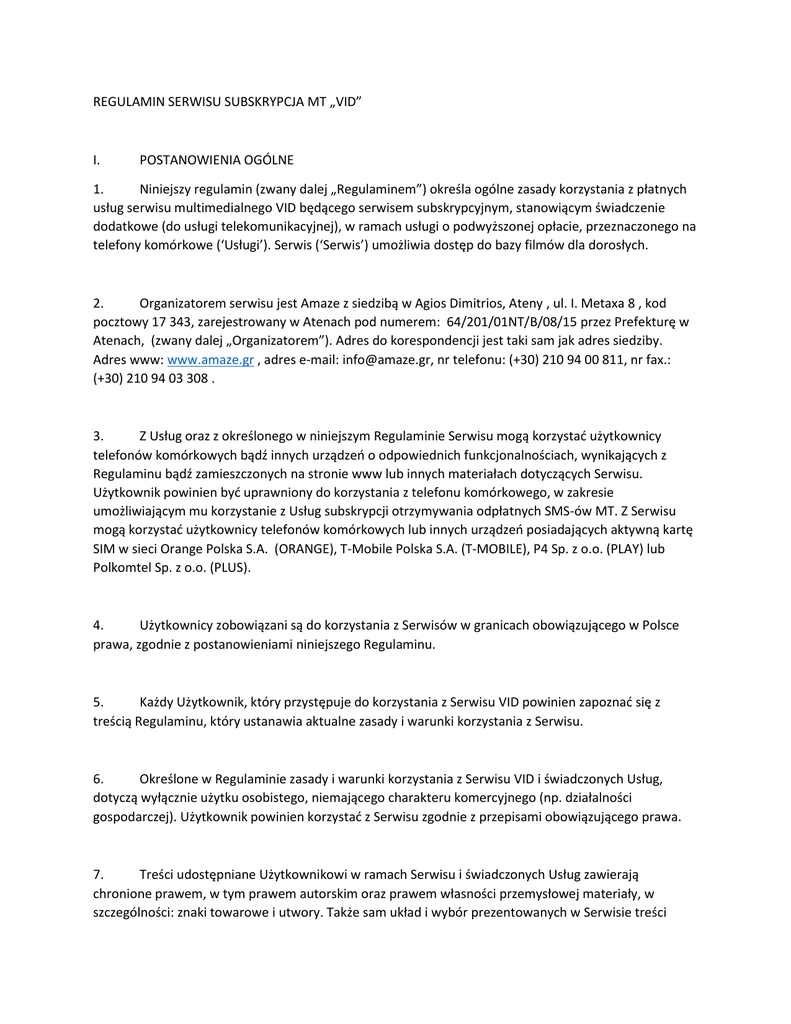 REGULAMIN SERWISU SUBSKRYPCJA MT „VID” I. POSTANOWIENIA OGÓLNE 1. Niniejszy regulamin (zwany dalej „Regulaminem”) określa ogólne zasady korzystania z płatnych usług serwisu multimedialnego VID będącego serwisem subskrypcyjnym, stanowiącym świadczenie dodatkowe (do usługi telekomunikacyjnej), w ramach usługi o podwyższonej opłacie, przeznaczonego na telefony komórkowe (‘Usługi’). Serwis (‘Serwis’) umożliwia dostęp do bazy filmów dla dorosłych. 2. Organizatorem serwisu jest Amaze z siedzibą w Agios Dimitrios, Ateny , ul. I. Metaxa 8 , kod pocztowy 17 343, zarejestrowany w Atenach pod numerem: 64/201/01NT/B/08/15 przez Prefekturę w Atenach, (zwany dalej „Organizatorem”). Adres do korespondencji jest taki sam jak adres siedziby. Adres www: www.amaze.gr , adres e-mail: [email protected], nr telefonu: (+30) 210 94 00 811, nr fax.: (+30) 210 94 03 308 . 3. Z Usług oraz z określonego w niniejszym Regulaminie Serwisu mogą korzystać użytkownicy telefonów komórkowych bądź innych urządzeń o odpowiednich funkcjonalnościach, wynikających z Regulaminu bądź zamieszczonych na stronie www lub innych materiałach dotyczących Serwisu. Użytkownik powinien być uprawniony do korzystania z telefonu komórkowego, w zakresie umożliwiającym mu korzystanie z Usług subskrypcji otrzymywania odpłatnych SMS-ów MT. Z Serwisu mogą korzystać użytkownicy telefonów komórkowych lub innych urządzeń posiadających aktywną kartę SIM w sieci Orange Polska S.A. (ORANGE), T-Mobile Polska S.A. (T-MOBILE), P4 Sp. z o.o. (PLAY) lub Polkomtel Sp. z o.o. (PLUS). 4. Użytkownicy zobowiązani są do korzystania z Serwisów w granicach obowiązującego w Polsce prawa, zgodnie z postanowieniami niniejszego Regulaminu. 5. Każdy Użytkownik, który przystępuje do korzystania z Serwisu VID powinien zapoznać się z treścią Regulaminu, który ustanawia aktualne zasady i warunki korzystania z Serwisu. 6. Określone w Regulaminie zasady i warunki korzystania z Serwisu VID i świadczonych Usług, dotyczą wyłącznie użytku osobistego, niemającego charakteru komercyjnego (np. działalności gospodarczej). Użytkownik powinien korzystać z Serwisu zgodnie z przepisami obowiązującego prawa. 7. Treści udostępniane Użytkownikowi w ramach Serwisu i świadczonych Usług zawierają chronione prawem, w tym prawem autorskim oraz prawem własności przemysłowej materiały, w szczególności: znaki towarowe i utwory. Także sam układ i wybór prezentowanych w Serwisie treści może stanowić samoistny przedmiot ochrony na gruncie prawa polskiego, w tym w szczególności na gruncie ustawy z dnia 4 lutego 1994 roku o prawie autorskim i prawach pokrewnych (Dz. U. z 2006 roku, Nr 90, poz. 631 ze zm.), ustawy z dnia 21 lipca 2001 roku o ochronie baz danych (Dz. U. Nr 128, poz. 1402 ze zm.) oraz ustawy z dnia 30 czerwca 2000 roku Prawo własności przemysłowej (Dz. U. z 2003 roku, Nr 119, poz. 1117 ze zm.). 8. Użytkownik jest uprawniony do wykorzystywania udostępnianych w ramach Serwisu treści, w szczególności Obiektów Multimedialnych wyłącznie w celach i zakresie określonym w ust. 6 powyżej oraz art. V ust. 2 niniejszego Regulaminu. W szczególności utwory (Obiekty Multimedialne) nie mogą być kopiowane, publikowane, wyświetlane, przesyłane lub rozpowszechniane w jakikolwiek sposób bez uzyskania odrębnej pisemnej zgody Amaze S.A., za wyjątkiem przypadków dozwolonego użytku przewidzianego prawem. 9. Ilekroć w Regulaminie użyte są niżej wymienione poniżej sformułowania, należy je rozumieć w następujący sposób: a. SMS/wiadomość SMS (Short Message Service) jest to krótka wiadomość tekstowa, składająca się z nie więcej niż 160 znaków (litery, cyfry, znaki szczególne), którą można przesłać na dowolny telefon komórkowy, zawierająca treść wpisaną przez nadawcę oraz umożliwiająca identyfikację numeru telefonu komórkowego jej nadawcy. b. SMS MT - (Short Message Service Mobile Terminated) jest to wiadomość SMS, która zostaje wysłana do Użytkownika w określonych częstotliwościach, w wykonaniu złożonego wcześniej przez Użytkownika zgodnie z niniejszym Regulaminem zamówienia, a Użytkownik ponosi koszt otrzymania każdej takiej wiadomości. c. Rejestracja – zamówienie (aktywacja) Usługi, poprzedzona uzyskaniem przez Użytkownika informacji o Serwisie i wyrażeniem odpowiednich zgód, w trybie opisanym w art. II poniżej, przy czym aktywacja Usługi następuje poprzez wpisanie na stronie WWW lub WAP promującej Serwis (dalej nazywaną ‘Stroną WWW lub WAP’) numeru telefonu Użytkownika (‘Numer MSISDN’) i potwierdzenie zamówienia poprzez wpisanie na Stronie WWW lub WAP kodu PIN otrzymanego na ten Numer MSISDN lub poprzez wysłanie SMSa na specjalny numer dostępowy, zgodnie z art. II ust. 1 Regulaminu. d. Serwis lub Serwis VID – serwis subskrypcyjny, w ramach którego, do momentu dezaktywacji Serwisu przez Użytkownika, świadczone są Usługi polegające na odpłatnym dostarczaniu Użytkownikowi SMS-ów MT w określonych częstotliwościach oraz na zapewnieniu Użytkownikom możliwości cyklicznego otrzymywania określonych treści, dostępów do serwisu czy Obiektów Multimedialnych, określonych w art. I ust. 1 Regulaminu. e. Obiekty Multimedialne - oznacza wszelkiego rodzaju treści cyfrowe o charakterze multimedialno-rozrywkowym, nie dostarczone na materialnym nośniku, w tym cyfrowe produkty, które mogą być dostępne w ramach Serwisów, w tym: tapety, grafiki, muzyka/Mp3, video itp. Obiekty Multimedialne zawierają chronione prawem, w tym prawem autorskim oraz prawem własności przemysłowej materiały, w szczególności: znaki towarowe i utwory. Postanowienia dotyczące Obiektów Multimedialnych stosuje się odpowiednio do innych treści, jeśli są dostępne w ramach Serwisu zgodnie z art. I ust. 1 Regulaminu, chyba ze z Regulaminu bądź ich charakterystyki wynika inaczej. Pobranie Obiektu Multim