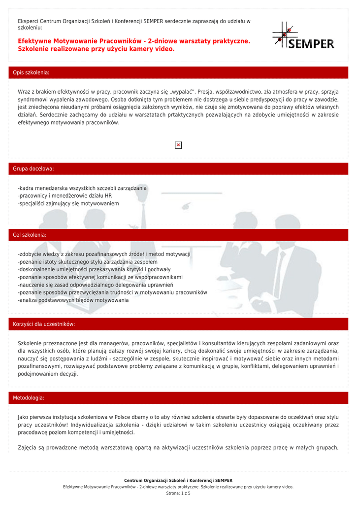 Eksperci Centrum Organizacji Szkoleń i Konferencji SEMPER serdecznie zapraszają do udziału w szkoleniu: Efektywne Motywowanie Pracowników - 2-dniowe warsztaty praktyczne. Szkolenie realizowane przy użyciu kamery video. Opis szkolenia: Wraz z brakiem efektywności w pracy, pracownik zaczyna się „wypalać”. Presja, współzawodnictwo, zła atmosfera w pracy, sprzyja syndromowi wypalenia zawodowego. Osoba dotknięta tym problemem nie dostrzega u siebie predyspozycji do pracy w zawodzie, jest zniechęcona nieudanymi próbami osiągnięcia założonych wyników, nie czuje się zmotywowana do poprawy efektów własnych działań. Serdecznie zachęcamy do udziału w warsztatach prtaktycznych pozwalających na zdobycie umiejętności w zakresie efektywnego motywowania pracowników. Grupa docelowa: -kadra menedżerska wszystkich szczebli zarządzania -pracownicy i menedżerowie działu HR -specjaliści zajmujący się motywowaniem Cel szkolenia: -zdobycie wiedzy z zakresu pozafinansowych źródeł i metod motywacji -poznanie istoty skutecznego stylu zarządzania zespołem -doskonalnenie umiejętności przekazywania krytyki i pochwały -poznanie sposobów efektywnej komunikacji ze współpracownikami -nauczenie się zasad odpowiedzialnego delegowania uprawnień -poznanie sposobów przezwyciężania trudności w motywowaniu pracowników -analiza podstawowych błędów motywowania Korzyści dla uczestników: Szkolenie przeznaczone jest dla managerów, pracowników, specjalistów i konsultantów kierujących zespołami zadaniowymi oraz dla wszystkich osób, które planują dalszy rozwój swojej kariery, chcą doskonalić swoje umiejętności w zakresie zarządzania, nauczyć się postępowania z ludźmi - szczególnie w zespole, skutecznie inspirować i motywować siebie oraz innych metodami pozafinansowymi, rozwiązywać podstawowe problemy związane z komunikacją w grupie, konfliktami, delegowaniem uprawnień i podejmowaniem decyzji. Metodologia: Jako pierwsza instytucja szkoleniowa w Polsce dbamy o to aby również szkolenia otwarte były dopasowane do oczekiwań oraz stylu pracy uczestników! Indywidualizacja szkolenia - dzięki udziałowi w takim szkoleniu uczestnicy osiągają oczekiwany przez pracodawcę poziom kompetencji i umiejętności. Zajęcia są prowadzone metodą warsztatową opartą na aktywizacji uczestników szkolenia poprzez pracę w małych grupach, Centrum Organizacji Szkoleń i Konferencji SEMPER Efektywne Motywowanie Pracowników - 2-dniowe warsztaty praktyczne. Szkolenie realizowane przy użyciu kamery video. Strona: 1 z 5 dyskusje na forum grupy oraz ćwiczenia, studia przypadków, scenki rodzajowe, pracę indywidualną, symulacje i mini- wykłady z omówieniem przykładów z życia i prezentacją multimedialną. Przedmiotem zajęć są realne trudności uwzględniające specyfikę danej branży oraz potrzeby i możliwości osób biorących udział w warsztatach. Uczestnicy uczą się poprzez doświadczenie – ćwiczą różne sytuacje, mają możliwość konsultacji indywidualnych. Nauka poprzez kreatywność, elastyczność i osobiste doświadczenia jest najskuteczniejszą formą zdobywania nowych umiejętności. Trener: Marek Naumiuk Specjalizacja trenerska: Trener, Coach, Menedżer szkolący. Specjalizuje się w programach z zakresu umiejętności handlowych, umiejętności menedżerskich oraz windykacji handlowych. Absolwent Akademii Trenerów Biznesu w Katowicach. Uzyskał tytuł Mistrz Praktyk NLP w szkole NLP Neuredukacja. Uczył się m.in. u Roberta Diltsa, Stephena Gilligana i Richarda Bolstada. Posiada 20-letnie doświadczenie zawodowe w pracy w działach handlowych, z czego 15 lat w Cadbury Wedel. Przez 6 lat, jako szef dystryktu, zarządzał ponad pięćdziesięcioosobowym zespołem sprzedażowym oraz był członkiem TOP 30 managerów w Polsce. czytaj więcej... Program szkolenia: 1.Motywacja – wprowadzenie. Czynniki wpływające na zaangażowanie: materialne i niematerialne. Motywacja jako funkcja kierowania ludźmi i zarządzania. Motywowanie a przywództwo. 2.Teorie motywacji i ich praktyczne zastosowanie. Podstawowe podejścia do motywacji: behawioralne, humanistyczne, poznawcze. Czynniki motywacyjne Herzberga. Zastosowanie teorii Maslowa. Teoria X i teoria Y McGregora. Teorie wzmocnienia pracy i potrzeba osiągnięć. Motywacja zewnętrzna i wewnętrzna. 3.Indywidualna motywacja pracownika. Jak motywować pracowników do pracy ? Umiejętność rozpoznawania potrzeb pracowników. Osobowość pracownika a motywatory. Motywacja finansowa i poza finansowa. Metody motywowania a poziom rozwoju zawodowego. 4.Wpływ automotywacji kierowników na podwładnych. Analiza własnej motywacji.Jak motywować samego siebie? Styl kierowania a motywacja. 5.Motywowanie zespołu. Rola lidera i style przewodzenia ludźmi. Współzawodnictwo w zespole. Rozwijanie sukcesu. Budowanie atmosfery zaangażowania i współpracy między pracownikami oraz lojalności pracowników. 6.Komunikacja motywująca. Motywacja płynąca z porozumiewania się. Wprowadzanie nowych koncepcji, model przyszłości. Centrum Organizacji Szkoleń i Konferencji SEMPER Efektywne Motywowanie Pracowników - 2-dniowe warsztaty praktyczne. Szkolenie realizowane przy użyciu kamery video. Strona: 2 z 5 Informacja zwrotna o pracy jako podstawa motywowania. Konstruktywna krytyka. Pozytywna informacja o pracy. Rozmowy rozwojowe i oceniające z pracownikami. Odwoływanie się do zasobów i mocnych stron. Przywoływanie sukcesów. Rozmowy korygujące zachowania i twórcze wykorzystanie błędów. Style oraz bariery komunikacji. 7.Skuteczne motywowanie pracowników przy użyciu narzędzi niematerialnych, zasady systemów motywacyjnych. Motywacja wewnętrzna a zewnętrzna wśród pracowników. Motywowanie w programie MBO. 8.Delegowanie i coaching jako narzędzia szefa w motywowaniu pracowników. 9. Błędy motywowania. Co zabija w nas motywację? 10. Podsumowanie warsztatów - dyskusja moderowana. Informac