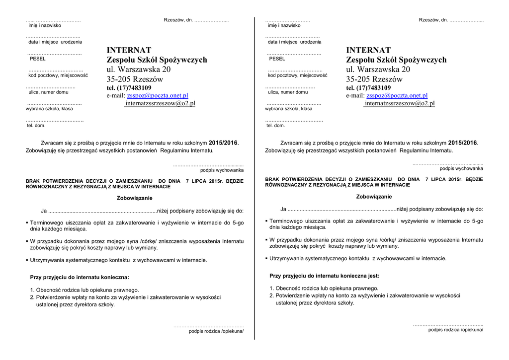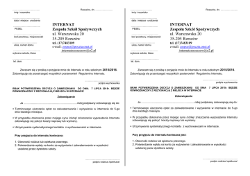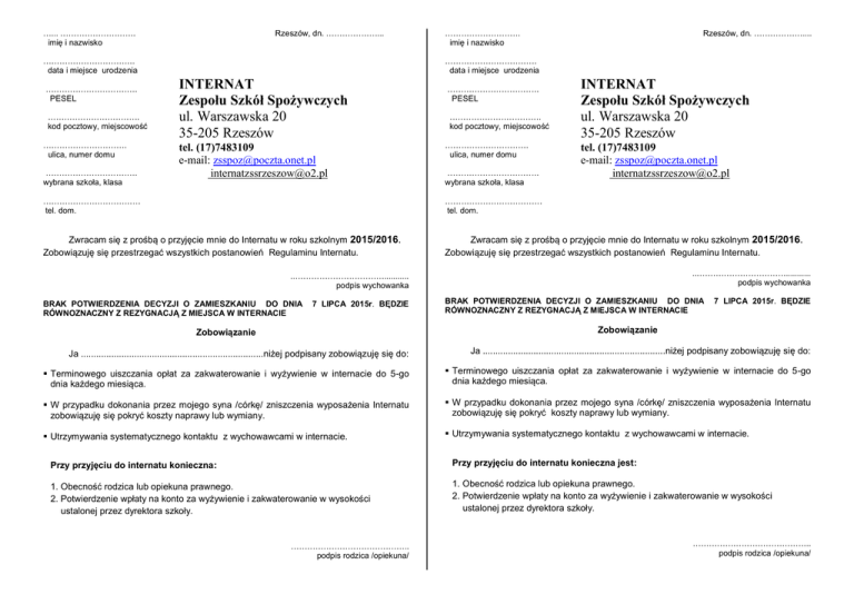 …... ………………………. imię i nazwisko Rzeszów, dn. ……………….... ……………………………. data i miejsce urodzenia ……………………………. PESEL ……………………………. kod pocztowy, miejscowość …………………………. ulica, numer domu ……………………………. wybrana szkoła, klasa ………………………. imię i nazwisko Rzeszów, dn. ……………….... ……………………………. data i miejsce urodzenia INTERNAT Zespołu Szkół Spożywczych ul. Warszawska 20 35-205 Rzeszów tel. (17)7483109 e-mail: [email protected] [email protected] ……………………………. PESEL ……………………………. kod pocztowy, miejscowość …………………………. ulica, numer domu ……………………………. wybrana szkoła, klasa INTERNAT Zespołu Szkół Spożywczych ul. Warszawska 20 35-205 Rzeszów tel. (17)7483109 e-mail: [email protected] [email protected] ……………………………… tel. dom. ……………………………… tel. dom. Zwracam się z prośbą o przyjęcie mnie do Internatu w roku szkolnym 2015/2016. Zobowiązuję się przestrzegać wszystkich postanowień Regulaminu Internatu. Zwracam się z prośbą o przyjęcie mnie do Internatu w roku szkolnym 2015/2016. Zobowiązuję się przestrzegać wszystkich postanowień Regulaminu Internatu. ..……………………………........... podpis wychowanka ..……………………………........... podpis wychowanka BRAK POTWIERDZENIA DECYZJI O ZAMIESZKANIU DO DNIA RÓWNOZNACZNY Z REZYGNACJĄ Z MIEJSCA W INTERNACIE 7 LIPCA 2015r. BĘDZIE BRAK POTWIERDZENIA DECYZJI O ZAMIESZKANIU DO DNIA RÓWNOZNACZNY Z REZYGNACJĄ Z MIEJSCA W INTERNACIE 7 LIPCA 2015r. BĘDZIE Zobowiązanie Zobowiązanie Ja ........................................................................niżej podpisany zobowiązuję się do: Ja ........................................................................niżej podpisany zobowiązuję się do: Terminowego uiszczania opłat za zakwaterowanie i wyżywienie w internacie do 5-go dnia każdego miesiąca. Terminowego uiszczania opłat za zakwaterowanie i wyżywienie w internacie do 5-go dnia każdego miesiąca. W przypadku dokonania przez mojego syna /córkę/ zniszczenia wyposażenia Internatu zobowiązuję się pokryć koszty naprawy lub wymiany. W przypadku dokonania przez mojego syna /córkę/ zniszczenia wyposażenia Internatu zobowiązuję się pokryć koszty naprawy lub wymiany. Utrzymywania systematycznego kontaktu z wychowawcami w internacie. Utrzymywania systematycznego kontaktu z wychowawcami w internacie. Przy przyjęciu do internatu konieczna: Przy przyjęciu do internatu konieczna jest: 1. Obecność rodzica lub opiekuna prawnego. 2. Potwierdzenie wpłaty na konto za wyżywienie i zakwaterowanie w wysokości ustalonej przez dyrektora szkoły. 1. Obecność rodzica lub opiekuna prawnego. 2. Potwierdzenie wpłaty na konto za wyżywienie i zakwaterowanie w wysokości ustalonej przez dyrektora szkoły. …………………………………….. podpis rodzica /opiekuna/ …………………………………….. podpis rodzica /opiekuna/