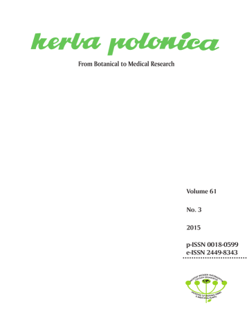 From Botanical to Medical Research From Botanical to Medical Research Volume 61 Volume 61 No. 3 No. 3 2015 2015 p-ISSN 0018-0599 ISSN 0018-0599 e-ISSN 2449-8343 ISSN 0018-0599 SCIENTIFIC BOARD Teresa Bobkiewicz-Kozłowska (Poznań, Poland) Waldemar Buchwald (Editor-in-Chief) (Poznań, Poland) Jaromir Budzianowski (Poznań, Poland) Ewa Capecka (Krakow, Poland) Lyle E. Craker (Amherst, USA) Bogusław Czerny (Poznań, Szczecin, Poland) Alexandru Dascaliuc (Chisinau, Moldova) Karol Wojciech Duczmal (Poznań, Poland) Włodzimierz Grajek (Poznań, Poland) Edmund Grześkowiak (Poznań, Poland) Jerzy Jambor (Klęka, Poland) Bogdan Kędzia (Poznań, Poland) Wanda Kisiel (Kraków, Poland) Anna Krajewska-Patan (Poznań, Poland) Eckhard Leistner (Bonn, Germany) Frank Marthe (Quedlinburg, Germany) Ákos Máthé (Mosonmagyaróvár, Hungary) Henry O. Meissner (Elanora-Gold Coast, Australia) Éva Németh (Budapest, Hungary) Przemysław Ł. Mikołajczak (Poznań, Poland) Johannes Novak (Vienna, Austria) Renata Ochocka (Gdańsk, Poland) Kazimierz Plocke (Warsaw, Poland) Ivar Roots (Berlin, Germany) Jan Jarosław Rybczyński (Warsaw, Poland) Katarzyna Seidler-Łożykowska (Poznań, Poland) Heinz Schilcher (Monachium, Germany) Ahmed El-Sayed Shalaby (Cairo, Egypt) Agnieszka Seremak-Mrozikiewicz (Poznań, Poland) Hartwig Schulz (Quedlinburg, Germany) Ryszard Słomski (Poznań, Poland) Grzegorz Spychalski (Poznań, Poland) Eva Szőke (Budapest, Hungary) Zenon Węglarz (Warsaw, Poland) Maria Władyka-Przybylak (Poznań, Poland) Halina Wysokińska (Łódź, Poland) Jordan Zjawiony (Jackson, USA) EDITORIAL COMMITTEE Waldemar Buchwald (Editor-in-Chief) Institute of Natural Fibres and Medicinal Plants, Kolejowa 2, 62-064 Plewiska, Poland tel. 48(61)665-95-50, fax 48(61)665-95-51, e-mail: [email protected] Anna Krajewska-Patan (Secretary of the Editorial Committee) Institute of Natural Fibres and Medicinal Plants, Kolejowa 2, 62-064 Plewiska, Poland tel. 48(61)665-95-50, fax 48(61)665-95-51, e-mail: [email protected] Artur Adamczak Tomasz M. Karpiński Department of Medical Microbiology Poznań University of Medical Sciences, Poznań, Poland Bogdan Kędzia Institute of Natural Fibres and Medicinal Plants, Poznań, Poland Przemysław Ł. Mikołajczak Department of Pharmacology Poznań University of Medical Sciences, Poznań, Poland Institute of Natural Fibres and Medicinal Plants, Poznań, Poland Agnieszka Seremak-Mrozikiewicz Division of Perinatology and Women’s Diseases Poznań University of Medical Sciences Poznań, Poland Institute of Natural Fibres and Medicinal Plants, Poznań, Poland Ryszard Słomski Department of Biochemistry and Biotechnology, Poznań University of Life Sciences Poznań, Poland Institute of Human Genetics of the Polish Academy of Sciences, Poznań, Poland Zenon Węglarz (Editor in Agricultural Sciences) Department of Vegetable and Medicinal Plants, Warsaw University of Life Sciences - SGGW Warsaw, Poland EDITORIAL OFFICE Contact person: Anna Krajewska-Patan Institute of Natural Fibres and Medicinal Plants, Kolejowa 2, 62-064 Plewiska, Poland tel. 48(61)665-95-50, fax 48(61)665-95-51 e-mail: [email protected] or [email protected] www.herbapolonica.pl is indexed/abstracted in AGRO database, CAB Abstracts, CABI databases, Celdes, CNPIEC, DOAJ, EBSCO Discovery Service, Global Health Database, Google Scholar, Herbalia, Index Copernicus, ProQuest International Pharmaceutical Abstracts, J-Gate, JournalTOCs, Medicinal and Aromatic Plants Abstracts, Naviga (Softweco), Polska Bibliografia Lekarska, Primo Central (ExLibris), ReadCube, Review of Aromatic and Medicinal Plants, Summon (Serials Solutions/ProQuest), TDOne (TDNet), WorldCat (OCLC). The on-line version is available on www.herbapolonica.pl and www.degruyter.com Institute of Natural Fibres and Medicinal Plants, Poznań, Poland PUBLISHED by the Institute of Natural Fibres and Medicinal Plants, Katarzyna Bączek Wojska Polskiego 71B, 60-630 Poznań (Poland) Department of Vegetable and Medicinal Plants, Warsaw University of Life Sciences - SGGW Warsaw, Poland Teresa Bobkiewicz-Kozłowska Department of Pharmacology Poznań University of Medical Sciences, Poznań, Poland Bogusław Czerny Institute of Natural Fibres and Medicinal Plants, Poznań, Poland Department of General Pharmacology and Pharmacoecnomics, Pomeranian Medical Academy Szczecin, Poland Andrzej Członkowski (Editor in Medical Sciences) EDITED by the Institute of Natural Fibres and Medicinal Plants Kolejowa 2, 62-064 Plewiska, Poland Tel. 48(61)665-95-50, fax 48(61)665-95-51, e-mail: [email protected], www.herbapolonica.pl www.iwnirz.pl The edition is supported by The Ministry of Science and Higher Education The on-line version is published before the version in the paper Department of Experimental and Clinical Pharmacology Medical University of Warsaw, Warsaw, Poland CONTACT PERSON Waldemar Buchwald (Editor-in-Chief) Anna Geszprych Print-run 200 copies Małgorzata Górska-Paukszta Copyright 2015 by the Institute of Natural Fibres and Medicinal Plants p-ISSN 0018-0599 e-ISSN 2449-8343 Department of Vegetables and Medicinal Plants, Warsaw University of Life Sciences - SGGW Warsaw, Poland Institute of Natural Fibres and Medicinal Plants, Poznań, Poland Printed in Poland by Esus Content EXPERIMENTAL PAPERS 7 ELŻBIETA BILIŃSKA, WALDEMAR BUCHWALD Biology of germination of medicinal plant seeds. Part XIXb. Diaspores of Inula helenium L. from Asteraceae family . . . . . . . . . . . . . . . . . . . . . . . . . . . . . . . . . . . 7 SHAMILA YADOLAHI ZADEH, ALI AKBAR RAMIN, BAHRAM BANINASAB Effect of gibberellic acid, stratification and salinity on seed germination of Echinacea purpurea cv. Magnus. . . . . . . . . . . . . . . . . . . . . . . . . . . . . . . . . . . . . . . 13 KATARZYNA BĄCZEK, MIROSŁAW ANGIELCZYK, JAROSŁAW L. PRZYBYŁ, OLGA KOSAKOWSKA, MARCIN EJDYS, ZENON WĘGLARZ Variability of southern sweet-grass (Hierochloë australis /Schrad./ Roem. & Schult.) wild growing populati