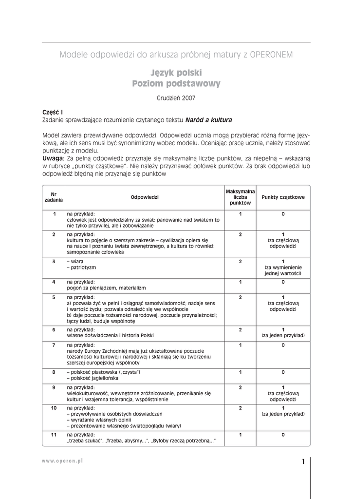 Modele odpowiedzi do arkusza próbnej matury z OPERONEM J´zyk polski Poziom podstawowy Grudzieƒ 2007 Cz´Êç I Zadanie sprawdzajàce rozumienie czytanego tekstu Naród a kultura Model zawiera przewidywane odpowiedzi. Odpowiedzi ucznia mogà przybieraç ró˝nà form´ j´zykowà, ale ich sens musi byç synonimiczny wobec modelu. Oceniajàc prac´ ucznia, nale˝y stosowaç punktacj´ z modelu. Uwaga: Za pe∏nà odpowiedê przyznaje si´ maksymalnà liczb´ punktów, za niepe∏nà – wskazanà w rubryce „punkty czàstkowe”. Nie nale˝y przyznawaç po∏ówek punktów. Za brak odpowiedzi lub odpowiedê b∏´dnà nie przyznaje si´ punktów Nr zadania Odpowiedzi Maksymalna liczba punktów Punkty czàstkowe 1 na przyk∏ad: cz∏owiek jest odpowiedzialny za Êwiat; panowanie nad Êwiatem to nie tylko przywilej, ale i zobowiàzanie 1 0 2 na przyk∏ad: kultura to poj´cie o szerszym zakresie – cywilizacja opiera si´ na nauce i poznaniu Êwiata zewn´trznego, a kultura to równie˝ samopoznanie cz∏owieka 2 1 (za cz´Êciowà odpowiedê) 3 – wiara – patriotyzm 2 1 (za wymienienie jednej wartoÊci) 4 na przyk∏ad: pogoƒ za pieniàdzem, materializm 1 0 5 na przyk∏ad: a) pozwala ˝yç w pe∏ni i osiàgnàç samoÊwiadomoÊç; nadaje sens i wartoÊç ˝yciu; pozwala odnaleêç si´ we wspólnocie b) daje poczucie to˝samoÊci narodowej, poczucie przynale˝noÊci; ∏àczy ludzi, buduje wspólnot´ 2 1 (za cz´Êciowà odpowiedê) 6 na przyk∏ad: w∏asne doÊwiadczenia i historia Polski 2 1 (za jeden przyk∏ad) 7 na przyk∏ad: narody Europy Zachodniej majà ju˝ ukszta∏towane poczucie to˝samoÊci kulturowej i narodowej i sk∏aniajà si´ ku tworzeniu szerszej europejskiej wspólnoty 1 0 8 – polskoÊç piastowska („czysta”) – polskoÊç jagielloƒska 1 0 9 na przyk∏ad: wielokulturowoÊç, wewn´trzne zró˝nicowanie, przenikanie si´ kultur i wzajemna tolerancja, wspó∏istnienie 2 1 (za cz´Êciowà odpowiedê) 10 na przyk∏ad: – przywo∏ywanie osobistych doÊwiadczeƒ – wyra˝anie w∏asnych opinii – prezentowanie w∏asnego Êwiatopoglàdu (wiary) 2 1 (za jeden przyk∏ad) 11 na przyk∏ad: „trzeba szukaç”, „Trzeba, abyÊmy...”, „By∏oby rzeczà potrzebnà...” 1 0 w w w. o p e r o n . p l 1 J´zyk polski. Poziom podstawowy Próbna Matura z OPERONEM i „Gazetà Wyborczà” Nr zadania Odpowiedzi Maksymalna liczba punktów Punkty czàstkowe 12 suwerennoÊç – niezale˝noÊç pluralizm – wieloÊç, ró˝norodnoÊç 1 0 13 na przyk∏ad: ˝al, smutek, ubolewanie wynikajàce z przeÊwiadczenia, ˝e wspó∏czeÊnie dominujà tendencje do postrzegania polskoÊci jako jednorodnoÊci etnicznej, wypierajàc bliskie autorowi jej pojmowanie jako wielokulturowoÊci 2 1 (za cz´Êciowà odpowiedê) Razem 20 Cz´Êç II Temat 1. Analizujàc podane fragmenty i odwo∏ujàc si´ do ca∏oÊci utworu, skonfrontuj obraz ch∏opów przedstawiony w dramacie z wyobra˝eniami inteligencji na temat mieszkaƒców wsi. I. Rozwini´cie tematu (0–25 pkt) 1. Prezentacja bohaterów scen (0–3 pkt) na przyk∏ad: a) Pan M∏ody – poeta, inteligent o˝eniony z ch∏opkà b) Pan M∏ody – ludoman c) Poeta – dekadent, znu˝ony ˝yciem d) Poeta – z dystansem odnoszàcy si´ do ludomanii e) Gospodarz – malarz, inteligent o˝eniony z ch∏opkà f) Gospodarz – mieszkaniec wsi g) Gospodarz – znajàcy ch∏opów – od dziesi´ciu lat sàsiadujàcy z nimi 2. Analiza I fragmentu (0–2 pkt) na przyk∏ad: a) Pan M∏ody widzi w ch∏opach witalnoÊç, energi´, zdrowie b) Pan M∏ody jest zauroczony urodà i barwnoÊcià wiejskiego ludu c) ch∏opi sà dla Pana M∏odego uosobieniem naturalnoÊci i autentycznoÊci d) ch∏opska kultura to dla Pana M∏odego o˝ywcze êród∏o si∏y dla znudzonej i bezsilnej inteligencji 3. Analiza II fragmentu (0–6 pkt) na przyk∏ad: a) wed∏ug Poety ch∏opi sà idealizowani b) Poeta uwa˝a, ˝e inteligencja jest zauroczona odmiennoÊcià ch∏opskiej kultury c) Poeta twierdzi, ˝e inteligencja tworzy obraz ch∏opów na w∏asne potrzeby d) Poeta uwa˝a, ˝e inteligencja poszukuje w ch∏opach wartoÊci e) Gospodarz widzi w ch∏opach spadkobierców piastowskich cnót (szlachetnoÊç) f) Gospodarz postrzega prac´ ch∏opów jako Êwi´tà (sakralizuje ich trud) g) ch∏opi, wed∏ug Gospodarza, sà pe∏ni godnoÊci i powagi h) wed∏ug Gospodarza wiara ch∏opów jest szczera (sà pobo˝ni) i) Gospodarz widzi w ch∏opach si∏´ i pot´g´ 4. Analiza III fragmentu (0–3 pkt) na przyk∏ad: a) inteligenci widzà gwa∏townoÊç i porywczoÊç ch∏opów b) ch∏opi mogà byç nieokie∏znani c) ch∏opi sà sk∏onni do okrucieƒstwa i przemocy d) ch∏opi mogà byç niebezpieczni dla inteligencji 5. Obraz ch∏opów w dramacie (0–7 pkt) Uwaga! Uczeƒ musi odwo∏ywaç si´ do konkretnych sytuacji, przyk∏adów z tekstu. www w.wow. p eorpoenr. op nl . p l 2 J´zyk polski. Poziom podstawowy Próbna Matura z OPERONEM i „Gazetà Wyborczà” na przyk∏ad: a) otwarci, poszukujàcy kontaktu z inteligencjà b) ciekawi Êwiata c) majàcy poczucie w∏asnej wartoÊci, dumni d) majàcy poczucie to˝samoÊci narodowej (gotowi do walki) e) Êwiadomi swojej historii f) przywiàzujàcy wag´ do tradycji g) przenikliwi, trafnie oceniajàcy postaw´ inteligencji h) rzeczowi, praktyczni, nieulegajàcy sentymentom i) brutalni, prostaccy j) k∏ótliwi, gwa∏towni, sk∏onni do bójek k) sk∏onni do pijaƒstwa l) chciwi, przyziemni, materialiÊci m) pró˝ni n) majàcy poczucie winy za rabacj´ Wnioski (0–4 pkt) Pe∏ny wniosek Obraz ch∏opów widziany przez inteligencj´ jest niepe∏ny i niejednoznaczny. Zestawienie wyobra˝eƒ inteligentów na temat ch∏opów z ich obrazem przedstawionym w dramacie obna˝a z jednej strony l´ki, zak∏amanie i ob∏ud´ inteligencji, a z drugiej powierzchownoÊç jej fascynacji ch∏opami oraz sk∏onnoÊç do ich idealizowania. Taka relacja jest Êwiadectwem g∏´bokich podz