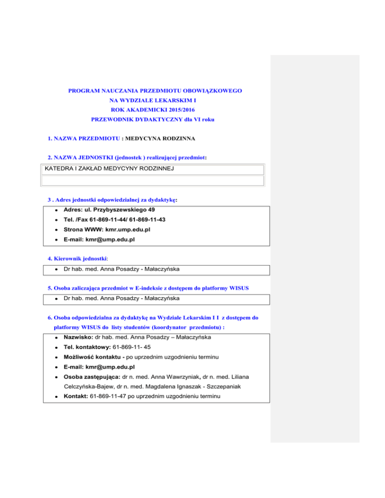 PROGRAM NAUCZANIA PRZEDMIOTU OBOWIĄZKOWEGO NA WYDZIALE LEKARSKIM I ROK AKADEMICKI 2015/2016 PRZEWODNIK DYDAKTYCZNY dla VI roku 1. NAZWA PRZEDMIOTU : MEDYCYNA RODZINNA 2. NAZWA JEDNOSTKI (jednostek ) realizującej przedmiot: KATEDRA I ZAKŁAD MEDYCYNY RODZINNEJ 3 . Adres jednostki odpowiedzialnej za dydaktykę: Adres: ul. Przybyszewskiego 49 Tel. /Fax 61-869-11-44/ 61-869-11-43 Strona WWW: kmr.ump.edu.pl E-mail: [email protected] 4. Kierownik jednostki: Dr hab. med. Anna Posadzy - Małaczyńska 5. Osoba zaliczająca przedmiot w E-indeksie z dostępem do platformy WISUS Dr hab. med. Anna Posadzy - Małaczyńska 6. Osoba odpowiedzialna za dydaktykę na Wydziale Lekarskim I I z dostępem do platformy WISUS do listy studentów (koordynator przedmiotu) : Nazwisko: dr hab. med. Anna Posadzy – Małaczyńska Tel. kontaktowy: 61-869-11- 45 Możliwość kontaktu - po uprzednim uzgodnieniu terminu E-mail: [email protected] Osoba zastępująca: dr n. med. Anna Wawrzyniak, dr n. med. Liliana Celczyńska-Bajew, dr n. med. Magdalena Ignaszak - Szczepaniak Kontakt: 61-869-11-47 po uprzednim uzgodnieniu terminu 7. Miejsce przedmiotu w programie studiów: Rok: VI Semestr: zimowy i letni 8. Liczba godzin ogółem : 94 liczba pkt. ECTS: 8 Jednostki uczestniczące w nauczaniu przedmiotu Katedra i Zakład Medycyny Rodzinnej Semestr zimowy/ letni liczba godzin W Ć Ćwiczenia S kategoria 50 D 17 Katedra i Klinika Medycyny Paliatywnej 13 - Razem: C 14 63 Jednostki uczestniczące w nauczaniu przedmiotu Katedra i Zakład Medycyny Rodzinnej 31 Semestr letni liczba godzin W Ć Ćwiczenia S kategoria 50 D 17 Katedra i Klinika Medycyny Paliatywnej 13 - Razem: C 14 63 31 9 . Cel nauczania przedmiotu Specyficzne problemy pediatryczne i wieku dorosłego. Specyficzne problemy geriatryczne. Profilaktyka i wczesne wykrywanie chorób cywilizacyjnych i nowotworowych. Patologia rodzinna i środowiskowa. Przemoc w rodzinie. Rozpoznawanie i terapia uzależnień w praktyce lekarza rodzinnego. Opieka nad przewlekle chorym. Medycyna paliatywna. Psychologiczne determinanty zdrowia i choroby. Zaburzenia psychosomatyczne. Relacje lekarz-pacjent - trudności we współpracy. (Zgodnie z treścią zawartą w Rozporządzeniu Ministra Nauki i Szkolnictwa Wyższego z dnia 12 lipca 2007 roku w sprawie standardów kształcenia dla poszczególnych kierunków oraz poziomów kształcenia, załącznik 54). Efekt kształcenia – umiejętności i kompetencje: Rozpoznawanie, selekcja, leczenie i rehabilitacja schorzeń ważnych pod kątem medycyny rodzinnej; organizowanie pacjentom opieki (opiekunów) na czas choroby; kontrolowanie objawów somatycznych i psychicznych chorych umierających; prowadzenie praktyki lekarza rodzinnego (aspekty organizacyjne, ekonomiczne i menadżerskie). Rozpoznawania psychologicznych problemów pacjenta; nawiązywania z pacjentem empatycznego kontaktu; dostosowywania się do własnych predyspozycji psychicznych i ograniczeń emocjonalnych w wykonywaniu zawodu lekarza; prowadzenia rozmowy i wywiadu z pacjentem według kryteriów psychologicznych; (Zgodnie z treścią zawartą w Rozporządzeniu Ministra Nauki i Szkolnictwa Wyższego z dnia 12 lipca 2007 roku w sprawie standardów kształcenia dla poszczególnych kierunków oraz poziomów kształcenia, załącznik 54) 10. SYLABUS Po odbyciu zajęć z medycyny rodzinnej student powinien znać: - kompetencje lekarza rodzinnego i specyfikę jego pracy, - podstawowe działania profilaktyczne w praktyce lekarza rodzinnego w zakresie: kalendarza szczepień obowiązkowych i zalecanych u dzieci i dorosłych, prewencji i wczesnego wykrywania wybranych jednostek onkologicznych; - zasady diagnozowania i postępowania terapeutycznego zgodne z kompetencjami lekarza rodzinnego na przykładzie chorób gorączkowych u dzieci, infekcji dróg oddechowych u dzieci i dorosłych, chorób układu kostno – stawowego, żylnej choroby zakrzepowo – zatorowej (w tym stosowania nowoczesnych doustnych antykoagulantów), przewlekłej niewydolności żylnej, prewencji pierwotnej i wtórnej chorób sercowo – naczyniowych, zasad rozpoznawania, wytycznych leczenia i indywidualizacji terapii nadciśnienia tętniczego, oceny ryzyka sercowo – naczyniowego i wytycznych leczenia hipolipemicznego i innych najczęściej występujących problemów internistycznych; zasady kierowania pacjentów na konsultacje specjalistyczne, - zasady opieki nad pacjentem w wieku podeszłym, - zastosowanie narzędzi przesiewowych i metod terapeutycznych, dotyczących uzależnienia od alkoholu, w ramach kompetencji lekarza rodzinnego, - podstawy rozpoznawania przemocy w rodzinie, - zasady komunikacji z pacjentem oraz przeprowadzania konsultacji lekarskich, - zasady prowadzenia dokumentacji medycznej (w tym druk ZUS ZLA, wniosek na leczenie uzdrowiskowe, wniosek o zaopatrzenie w środki i materiały ortopedyczne) . Umiejętności praktyczne zdobyte w trakcie zajęć z medycyny rodzinnej: - przeprowadzanie wywiadu lekarskiego i badania przedmiotowego u dorosłego i dziecka, w każdym wieku; - przeprowadzanie diagnostyki różnicowej w oparciu o omawiane przypadki kliniczne; - planowanie diagnostyki i terapii u pacjentów z praktyki lekarza rodzinnego, zgodnie z obowiązującymi rekomendacjami towarzystw naukowych; - interpretacja badań laboratoryjnych wraz z omówieniem przyczyn ich odchyleń; - kwalifikacja pacjenta do szczepień; - prawidłowe przeprowadzenie podstawowych procedur i zabiegów lekarskich , zgodnych z kompetencjami lekarza rodzinnego; - planowanie konsultacji specjalistycznych i ustalanie planu dalszej opieki razem z pielęgniarką środowiskowo - rodzinną; - monitorowanie stanu chorego przewlekle, w tym pacjenta wymagającego opieki domowej SYLABUS Nazwa przedmiotu/modułu Wydział Nazwa kierunku studiów Poziom kształcenia Forma studiów Język przedmiotu Rodzaj przedmiotu Rok studiów/semestr Medycyna rodzinna Wydział Lekarski I lekarski stacjonarne polski Obowiązkowy X I II III IV V VI X fakultaty