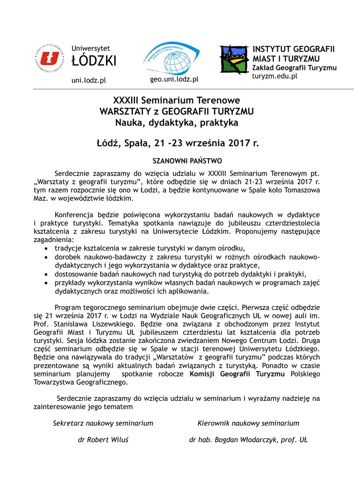 INSTYTUT GEOGRAFII MIAST I TURYZMU Uniwersytet ŁÓDZKI uni.lodz.pl geo.uni.lodz.pl Zakład Geografii Turyzmu turyzm.edu.pl XXXIII Seminarium Terenowe WARSZTATY z GEOGRAFII TURYZMU Nauka, dydaktyka, praktyka Łódź, Spała, 21 -23 września 2017 r. SZANOWNI PAŃSTWO Serdecznie zapraszamy do wzięcia udziału w XXXIII Seminarium Terenowym pt. „Warsztaty z geografii turyzmu”, które odbędzie się w dniach 21-23 września 2017 r. tym razem rozpocznie się ono w Łodzi, a będzie kontynuowane w Spale koło Tomaszowa Maz. w województwie łódzkim. Konferencja będzie poświęcona wykorzystaniu badań naukowych w dydaktyce i praktyce turystyki. Tematyka spotkania nawiązuje do jubileuszu czterdziestolecia kształcenia z zakresu turystyki na Uniwersytecie Łódzkim. Proponujemy następujące zagadnienia: tradycje kształcenia w zakresie turystyki w danym ośrodku, dorobek naukowo-badawczy z zakresu turystyki w rożnych ośrodkach naukowodydaktycznych i jego wykorzystania w dydaktyce oraz praktyce, dostosowanie badań naukowych nad turystyką do potrzeb dydaktyki i praktyki, przykłady wykorzystania wyników własnych badań naukowych w programach zajęć dydaktycznych oraz możliwości ich aplikowania. Program tegorocznego seminarium obejmuje dwie części. Pierwsza część odbędzie się 21 września 2017 r. w Łodzi na Wydziale Nauk Geograficznych UŁ w nowej auli im. Prof. Stanisława Liszewskiego. Będzie ona związana z obchodzonym przez Instytut Geografii Miast i Turyzmu UŁ jubileuszem czterdziestu lat kształcenia dla potrzeb turystyki. Sesja łódzka zostanie zakończona zwiedzaniem Nowego Centrum Łodzi. Druga część seminarium odbędzie się w Spale w stacji terenowej Uniwersytetu Łódzkiego. Będzie ona nawiązywała do tradycji „Warsztatów z geografii turyzmu” podczas których prezentowane są wyniki aktualnych badań związanych z turystyką. Ponadto w czasie seminarium planujemy spotkanie robocze Komisji Geografii Turyzmu Polskiego Towarzystwa Geograficznego. Serdecznie zapraszamy do wzięcia udziału w seminarium i wyrażamy nadzieję na zainteresowanie jego tematem Sekretarz naukowy seminarium Kierownik naukowy seminarium dr Robert Wiluś dr hab. Bogdan Włodarczyk, prof. UŁ iwersytet INSTYTUT GEOGRAFII MIAST I TURYZMU ŁÓDZKI uni.lodz.pl geo.uni.lodz.pl Zakład Geografii Turyzmu turyzm.edu.pl RAMOWY PROGRAM SEMINARIUM Czwartek, 21.09.2017 r., Łódź, Collegium Geographicum, ul. Kopcińskiego 31 9.00-11.00 – rejestracja uczestników seminarium 11.00-13.00 – I sesja 13.00-14.00 – Lunch 14.00-16.00 – II sesja 16.00-18.00 – Zwiedzanie Nowego Centrum Łodzi 18.00-20.00 – Kolacja 20.00 – wyjazd do Spały (możliwość zorganizowania wspólnego transportu autokarowego w zależności od liczby chętnych) Piątek, 22.09.2017 r., Spała, stacja terenowa UŁ, ul.Wojciechowskiego 4 8.00- 9.00 – Śniadanie 9.00-13.00 – Sesje warsztatowe/przerwa kawowa 13.00-14.00 – Obiad 14.00-18.00 – Sesje warsztatowe/przerwa kawowa 19.00 Kolacja połączona ze spotkaniem towarzyskim Sobota, 23.09.2017 r., 8.00- 9.00 – Śniadanie 9.00-13.00 - Sesje warsztatowe/Spotkanie robocze Komisji Geografii Turyzmu przy PTG 13.00-13.30 – Podsumowanie i zakończenie seminarium 13.30-14.30 – Obiad Program może ulec zmianie w zależności od liczby zgłoszonych wystąpień. iwersytet INSTYTUT GEOGRAFII MIAST I TURYZMU ŁÓDZKI uni.lodz.pl geo.uni.lodz.pl Zakład Geografii Turyzmu turyzm.edu.pl SPRAWY ORGANIZACYJNE 1. Ważne terminy: tytuły i abstrakty artykułów do 28 lutego 2017 r. (do 1000 znaków) gotowe artykuły do 15 kwietnia 2017 r. (wg załączonej instrukcji dotyczącej zasad publikowania w czasopiśmie TURYZM) tematy wystąpień do 30 czerwca 2017 r. (bez publikacji lub publikacja po warsztatach) 2. Miejsce seminarium: ŁÓDŹ – Collegium Geographicum, aula im. prof. Stanisława Liszewskiego, ul. Kopcińskiego 31 SPAŁA - woj. łódzkie, stacja terenowa Uniwersytetu Łódzkiego, ul. Wojciechowskiego 14 3. Koszty udziału w seminarium: 650 zł. - udział z wystąpieniem i publikacją w recenzowanym czasopiśmie TURYZM t. 27, z.1 (8pkt.) wydanym na warsztaty + transport z Łodzi do Spały pierwszego dnia seminarium, dwa noclegi w stacji terenowej UŁ w Spale, wyżywienie (śniadania, obiady, kolacje, przerwy kawowe) udział w spotkaniu towarzyskim. 700 zł. - udział z wystąpieniem, publikacja w kolejnym numerze recenzowanego czasopisma TURYZM (8 pkt.) + transport z Łodzi do Spały pierwszego dnia seminarium, dwa noclegi w stacji terenowej UŁ w Spale, wyżywienie (śniadania, obiady, kolacje, przerwy kawowe) udział w spotkaniu towarzyskim. 600 zł. - udział bez wystąpienia + transport z Łodzi do Spały pierwszego dnia seminarium, dwa noclegi w stacji terenowej UŁ w Spale, wyżywienie (śniadania, obiady, kolacje, przerwy kawowe) oraz udział w spotkaniu towarzyskim. Wpłaty wpisowego prosimy dokonywać na konto: PEKAO S.A. II/O Łódź nr. 88 1240 3028 1111 0010 29428031 z dopiskiem: „Warsztaty z geografii turyzmu” 4. Zgłoszenie udziału w XXXIII Seminarium terenowym „Warsztaty z geografii turyzmu” prosimy przesyłać na wypełnionej karcie zgłoszeniowej mailem lub tradycyjną pocztą na adres organizatorów. 5. Kontakt: Robert WILUŚ, sekretarz naukowy seminarium Instytut Geografii Miast i Turyzmu UŁ ul. Kopcińskiego 31, 90-142 Łódź tel. 42 6354555, 6354550 fax. 42 6354550 e-mail: [email protected] Kolejne komunikaty będą się pojawiały na stronie Instytutu – turyzm.edu.pl oraz będą rozsyłane pocztą e-mailową. Zasady składania artykułów do czasopisma TURYZM Maksymalna objętość artykułu nie może przekroczyć 15 stron maszynopisu znormalizowanego (28–30 wierszy na stronie) wraz z rysunkami, tabelami i bibliografią. Tekst nie może przekroczyć 30 000 znaków ze spacjami. Skład w edytorze Word (doc, docx lub rtf) – czcionka Times New Roman, 12 pkt, podwójna interlinia. Przesyłane artykuły winny zaczynać się kró