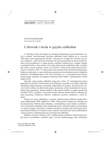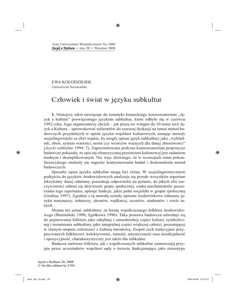 Acta Universitatis Wratislaviensis No 3060 Jêzyk a Kultura • tom 20 • Wrocław 2008 EWA KOŁODZIEJEK Uniwersytet Szczeciński Człowiek i świat w języku subkultur 1. Niniejszy tekst nawiązuje do tematyki karpackiego konwersatorium „Język a kultura” poświęconego językom subkultur, które odbyło się w czerwcu 1992 roku. Jego organizatorzy chcieli – jak piszą we wstępie do 10 tomu serii Język a Kultura – sprowokować referentów do szerszej dyskusji na temat metod badawczych przydatnych w opisie języka wspólnot kulturowych, uznając metody socjolingwistyki za zbyt wąskie, by mogły opisać język subkultury jako „wykładnik, zbiór, system wartości, norm czy wzorców ważnych dla danej zbiorowości” (Języki subkultur 1994: 7). Zaprezentowane podczas konwersatorium propozycje badawcze pokazały, że opis tej efemerycznej przestrzeni kulturowej jest zadaniem trudnym i skomplikowanym. Nic więc dziwnego, że w recenzjach tomu pokonferencyjnego znalazły się sugestie kontynuowania badań i doskonalenia metod badawczych. Sposoby opisu języka subkultur mogą być różne. W socjolingwistycznym podejściu do języków środowiskowych analizuje się przede wszystkim repertuar leksykalny danej odmiany, poszukuje odpowiedzi na pytanie, do jakich sfer rzeczywistości odnosi się aktywność grupy społecznej, szuka mechanizmów poszerzania tego repertuaru, opisuje funkcje, jakie pełni socjolekt w grupie społecznej (Grabias 1997). Zgodnie z tą metodą zostały opisane środowiskowe odmiany języka marynarzy, żołnierzy, aktorów, wędkarzy, uczniów, studentów i wiele innych. Można też uznać subkultury za formę współczesnego folkloru środowiskowego (Bartmiński 1990; Zgółkowa 1996). Taka postawa badawcza odwołuje się do pojmowania folkloru jako odrębnej i samodzielnej części kultury symbolicznej i rozumienia subkultury jako integralnej części większej całości, pozostającej w różnym stopniu zależności z kulturą narodową. Zespół cech tradycyjnie przypisywanych folklorowi: kolektywność, ustność, artystyczność oraz nieoficjalność i opozycyjność, charakterystyczny jest także dla subkultur. Badacza zarówno folkloru, jak i współczesnych subkultur zainteresują przyjęte przez uczestników wspólnot sądy o świecie funkcjonujące jako stereotypy Język a Kultura 20, 2008 © for this edition by CNS druk_JaK_20.indd 287 2008-06-06 10:15:25 288 EWA KOŁODZIEJEK werbalne (formuły) utrwalone w specyficznym dla grupy języku obejmującym obszary rzeczywistości ważne dla członków wspólnoty, a także inne przejawy wspólnotowości: gesty, zachowania etykietalne, praktyki magiczne, elementy kultury materialnej. Zarysowane w ten sposób pole badawcze zbliża folklorystykę do nowocześnie pojmowanej etnolingwistyki, która dąży do opisania, jak w języku wspólnoty konceptualizuje się rzeczywistość, jak użytkownicy tego języka postrzegają świat, jak go wartościują i jakie postawy wobec świata w nim utrwalają. Taka postawa ma oparcie w dziewiętnastowiecznym językoznawstwie niemieckim, w teoriach Johanna G. Herdera, Wilhelma von Humboldta czy Leo Weisgerbera, w ich myśli o aktywnej roli języka w poznawaniu świata, o języku jako akumulatorze doświadczeń społecznych kształtującym widzenie świata, a także w koncepcjach języka i kultury Edwarda Sapira i Benjamina Lee Whorfa, dla których język jest aspektem kultury, doskonałym systemem symbolicznym, narzędziem wszelkich odniesień i znaczeń dostępnych w danej kulturze zarówno w sferze komunikacji, jak i w formach myślenia. Językowy obraz świata, będący pewną strukturą pojęciową utrwaloną we właściwościach gramatycznych i semantycznych danego języka, za pomocą której mówiący ujmują świat (Grzegorczykowa 1990: 43 i n.), może być zarówno obrazem jednostkowym (Wojciechowska 2000), obrazem pewnej grupy wiekowej (Językowy obraz... 1995), jak i obrazem wspólnoty narodowej (Bartmiński 2001). Może być także obrazem wspólnoty subkulturowej. Moją propozycją opisu współczesnych subkultur jest książka Człowiek i świat w języku subkultur (2005) będąca językowym obrazem pięciu wspólnot: przestępczej, żołnierskiej, kibiców piłkarskich, hip-hopu i studentów (ich syntetyczny opis przedstawiam w niniejszym tekście). Postawa badawcza, jaką przyjęłam, rekonstruując utrwaloną w języku wizję człowieka i świata, jest zbieżna z antropologicznymi zasadami oglądu kultury i języka polegającymi na zachowaniu obiektywizmu opisu zjawisk, nienarzucaniu im własnej skali wartości i własnego systemu pojęciowego. Takie założenie było niezbędne, gdyż należało znaleźć sposoby analizy subkultur różnorodnych jakościowo znajdujących się często na różnych biegunach społecznej skali wartości: z jednej strony dla budzącej negatywne oceny grypsery więziennej, subkultury stadionów piłkarskich i żołnierskiej „fali”, z drugiej zaś dla symbiotycznej wobec normy ogólnospołecznej subkultury hip-hopu i dla słabo wyróżniającej się subkultury studentów. Wspólną płaszczyzną stał się język, który jest podstawowym składnikiem i generatorem subkultury, konceptualizuje rzeczywistość zgodnie z przyjętymi przez grupę normami, kreuje tę rzeczywistość, przenosi uznawane przez społeczność wartości. W języku grupy utrwalona jest struktura społeczna, system ról społecznych, stereotypy i autostereotypy grupowe, rytuały i zachowania przesądne. Różnorodność opisywanej materii językowo-kulturowej miała wpływ na wybór zastosowanych metod badawczych. Nie rezygnowałam z żadnej możliwości metodologicznej, rozpatrywałam zachowania grup subkulturowych szeroko, Język a Kultura 20, 2008 © for this edition by CNS druk_JaK_20.indd 288 2008-06-06 10:15:25 Człowiek i świat w języku subkultur 289 z kilku perspektyw jednocześnie, podporządkowując wybór metod i narzędzi opisu specyfice 