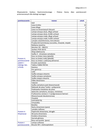 Załącznik nr 3 Wyposażenie Szałasu Gastronomicznego przeznaczonych dla obsługi wyciągu) pomieszczenie Poziom II, pomieszczenie jadalni i obsługi, bar, schody Poziom II Ekspozycja Poziom I pomieszczenie - Polana Sosny nazwa Stół Ława krótka Ława długa Ława na drewnianych klocach Lampa wisząca duża, długi uchwyt Lampa wisząca duża, krótki uchwyt Lampa wisząca mała, długi uchwyt Lampa wisząca mała, krótki uchwyt Lampka oświetleniowa, kierunkowa Przybornik kominkowy (szczotka, chwytak, stojak) Reklama świetlna Monitor HS – BM151 Zasilacz PCB 10/15 Okap elektryczny Szafka 3 - drzwiowa zamykana Kosz na śmieci duży (plastik) Kosz na śmieci mały (plastik) Kosz na śmieci z pokrywą (drewno) Krzesło wyścielane Tablica FARM FRITAS Gaśnica Koc gaśniczy Lada Szafka wisząca otwarta Szafka wisząca zamykana Szafka stojąca otwarta Półka drewniana Taboret Szafka zamykana pod zlewozmywak Nalewak do piwa Tyskie + połączenia Podstawka metalowa do piwa Apteczka zamykana, wisząca, metalowa Frytkownica zestaw (+ 3 podgrzewacze bemar) Zlewozmywak dwukomorowy Chodnik Grill (0/0279) Umywalka Butelka Narty drewniane (para) Lampka naftowa Pojemniki drewniane, okrągłe Skrzynia drewniana Kredens drewniany Garnek gliniany Buty narciarskie (para) Lampa sufitowa Muszla WC z dolnospłukiem (bez pomieszczeń sztuk 7 10 2 2 4 3 2 1 10 1 3 1 1 1 1 2 1 1 3 2 4 1 1 2 1 1 3 2 1 1 1 1 1 1 2 1 1 7 2 5 4 2 1 2 1 5 1 1 gosp., WC Poziom I WC Na zewnątrz Kosz na śmieci (plastik) Szczotka WC Pojemnik na papier toaletowy Pojemnik na ręczniki papierowe Szafa stojąca zamykana Umywalka Wywietrznik ścienny, elektryczny Grzejnik ścienny elektryczny SIEMENS Podgrzewacz wody Pojemnik plastikowy, czerwony Szafka stojąca, metalowa Podkładka podłogowa, drewniana Szafka metalowa, zamykana UPS Lupus Switch D-Link 8 portowy Switch Allied TELESYN Konwerter VDSL 2 PLANET VC201 Konwerter RS Zasilacz PCB 10/15 Przedłużacz 5 gniazdkowy Grzejnik ścienny elektryczny SIEMENS Gaśnica Umywalka Kosz na śmieci Pisuar Pojemnik na ręczniki papierowe Lustro Dozownik na mydło Wieszak drewniany Muszla WC z dolnospłukiem Pojemnik na papier toaletowy Wieszak na papier toaletowy Lampa sufitowa Szczotka WC Mop + wiaderko Wentylator ścienny elektryczny Wycieraczka gumowa Lampa sufitowa Lampa oświetleniowa Drabina drewniana Stojak na narty drewniany Ława drewniana Stół (konstrukcja metalowa) Ławka (konstrukcja metalowa) Reklama świetlna Tyskie 1 1 1 1 1 1 1 2 2 1 1 1 1 1 1 1 2 3 6 1 2 1 3 2 1 2 3 2 2 3 2 1 6 3 1 2 1 1 3 1 1 1 2 4 1 2