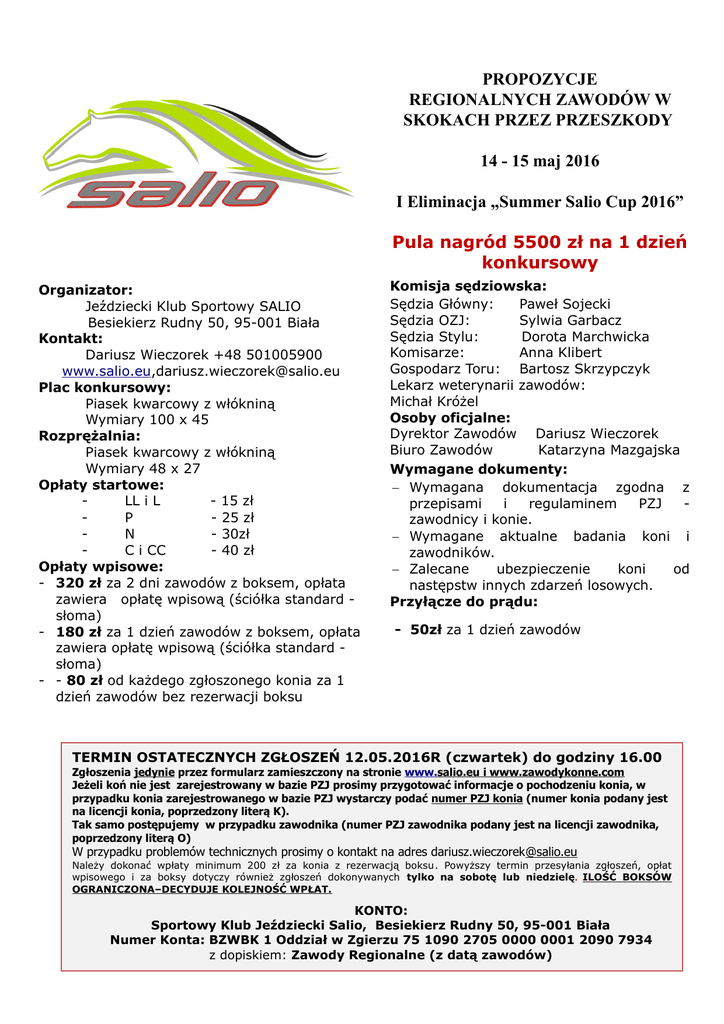 PROPOZYCJE REGIONALNYCH ZAWODÓW W SKOKACH PRZEZ PRZESZKODY 14 - 15 maj 2016 I Eliminacja „Summer Salio Cup 2016” Pula nagród 5500 zł na 1 dzień konkursowy Organizator: Jeździecki Klub Sportowy SALIO Besiekierz Rudny 50, 95-001 Biała Kontakt: Dariusz Wieczorek +48 501005900 www.salio.eu,[email protected] Plac konkursowy: Piasek kwarcowy z włókniną Wymiary 100 x 45 Rozprężalnia: Piasek kwarcowy z włókniną Wymiary 48 x 27 Opłaty startowe: LL i L - 15 zł P - 25 zł N - 30zł C i CC - 40 zł Opłaty wpisowe: - 320 zł za 2 dni zawodów z boksem, opłata zawiera opłatę wpisową (ściółka standard słoma) - 180 zł za 1 dzień zawodów z boksem, opłata zawiera opłatę wpisową (ściółka standard słoma) - - 80 zł od każdego zgłoszonego konia za 1 dzień zawodów bez rezerwacji boksu Komisja sędziowska: Sędzia Główny: Paweł Sojecki Sędzia OZJ: Sylwia Garbacz Sędzia Stylu: Dorota Marchwicka Komisarze: Anna Klibert Gospodarz Toru: Bartosz Skrzypczyk Lekarz weterynarii zawodów: Michał Króżel Osoby oficjalne: Dyrektor Zawodów Dariusz Wieczorek Biuro Zawodów Katarzyna Mazgajska Wymagane dokumenty: Wymagana dokumentacja zgodna z przepisami i regulaminem PZJ zawodnicy i konie. Wymagane aktualne badania koni i zawodników. Zalecane ubezpieczenie koni od następstw innych zdarzeń losowych. Przyłącze do prądu: - 50zł za 1 dzień zawodów TERMIN OSTATECZNYCH ZGŁOSZEŃ 12.05.2016R (czwartek) do godziny 16.00 Zgłoszenia jedynie przez formularz zamieszczony na stronie www.salio.eu i www.zawodykonne.com Jeżeli koń nie jest zarejestrowany w bazie PZJ prosimy przygotować informacje o pochodzeniu konia, w przypadku konia zarejestrowanego w bazie PZJ wystarczy podać numer PZJ konia (numer konia podany jest na licencji konia, poprzedzony literą K). Tak samo postępujemy w przypadku zawodnika (numer PZJ zawodnika podany jest na licencji zawodnika, poprzedzony literą O) W przypadku problemów technicznych prosimy o kontakt na adres [email protected] Należy dokonać wpłaty minimum 200 zł za konia z rezerwacją boksu. Powyższy termin przesyłania zgłoszeń, opłat wpisowego i za boksy dotyczy również zgłoszeń dokonywanych tylko na sobotę lub niedzielę. ILOŚĆ BOKSÓW OGRANICZONA–DECYDUJE KOLEJNOŚĆ WPŁAT. KONTO: Sportowy Klub Jeździecki Salio, Besiekierz Rudny 50, 95-001 Biała Numer Konta: BZWBK 1 Oddział w Zgierzu 75 1090 2705 0000 0001 2090 7934 z dopiskiem: Zawody Regionalne (z datą zawodów) PROGRAM ZAWODÓW: Sobota (14.05.2016) godz 09.00 Konkurs Konkurs Konkurs Konkurs Konkurs Konkurs Konkurs Konkurs nr 1 nr 2 nr 3 nr 4 nr 5 nr 6 nr 7 nr 8 50cm 70cm LL L L P N C zwykły „Towarzyski” zwykły „Towarzyski” dokładności „Towarzyski” (100) szkoleniowy (100) zwykły (110) zwykły (120) dwufazowy (130) dwufazowy Art. Art. Art. Art. 238.2.1 238.2.1 274.5.3 274.5.3 Niedziela (15.05.2016) godz 09.00 Konkurs Konkurs Konkurs Konkurs Konkurs Konkurs Konkurs Konkurs Konkurs nr 9 nr 10 nr 11 nr 12 nr 13 nr 14 nr 15 nr 16 nr 17 50cm 70cm LL L L P N C CC zwykły „Towarzyski” zwykły „Towarzyski” dokładności „Towarzyski” (100) licencyjny (100) zwykły (110) zwykły (120) zwykły (130) zwykły (140) zwykły z rozgrywką GRAND PRIX o Nagrodę New Holland Art. Art. Art. Art. Art. 238.2.1 238.2.1 238.2.1 238.2.1 238.2.2 NAGRODY: KONKUR S L PULA I II III IV Nagrody Nagrody Nagrody Nagrody Nagrody rzeczowe rzeczowe rzeczowe rzeczowe rzeczowe V VI VII VIII Nagrody rzeczowe Nagrody rzeczowe Nagrody rzeczowe Nagrody rzeczowe P 950 300 200 150 100 75 50 50 25 N 1300 500 300 250 50 50 50 50 50 C 2000 750 400 300 250 150 50 50 50 CC 2500 850 500 400 300 250 100 50 50 SPRAWY ORGANIZACYJNE 1. Opłaty wpisowe oraz za boksy nie będą podlegać zwrotowi w wypadku rezygnacji ze startów w zawodach - niezależnie od przyczyny, zgłoszonej od czwartku po godzinie 16-tej. W przypadku braku wpłaty na koncie w odpowiednim terminie - opłaty wpisowe opłacane na miejscu będą liczone podwójnie, opłaty za boks (tylko w przypadku posiadania wolnych boksów), również będą liczone podwójnie. W przypadku nie przestrzegania ww. warunków organizator może odmówić udziału w zawodach. 2. Organizator nie ponosi odpowiedzialności za kradzieże, wypadki i inne szkody mogące wyniknąć w trakcie transportu i uczestnictwa w zawodach. 3. W stajniach mogą przebywać tylko osoby biorące udział w zawodach (jeździec, trener, luzak, właściciel konia) oraz konie mające wykupione boksy. 4. Za Każdą zmianę na liście startowej po jej wydrukowaniu będzie pobierana opłata w wysokości 30zł (nie dotyczy skreśleń) 5. Listy startowe będą opublikowane na stronie internetowej www.salio.eu od piątku - godz. 20.00. 6. Noclegi: Hotel Salio Rezerwacja 501005900, [email protected] - pokój 2 – osobowy 200 zł/doba Hotel 500 Stryków, ul. Warszawska - Smolice 1b, 95-010 Stryków – ok. 11 km Dział Marketingu i Rezerwacji Grupowych Tel. (48) 42 719 99 50-52 [email protected] [email protected] [email protected] Pokój 1 – osobowy od 165 zł/dobę Pokój 2 – osobowy od 190 zl/dobę Gminny Ośrodek Szkoleniowo – Wypoczynkowy w Dzierżąznej, Dzierżązna 4, 95-001 Biała – ok. 7km tel. 42 717-84-66, fax 42 717-80-18, e-mail:[email protected], [email protected], Magdalena Grzelewska - tel. 515-280-188 Pokoje w Dworku 1) Apartament (1 szt.) - 150 zł za dobę 2) Pokoje jednoosobowe (2 szt.) - 95 zł za dobę 3) Pokoje czteroosobowe (2 szt.) -165 zł za dobę 4)Pokoje pięcioosobowe (2 szt.) - 165 zł za dobę Domki kempingowe 1) Domki trzyosobowe - 75 zł za dobę (10 domków) 2) Domki pięcioosobowe - 100 zł za dobę (2 domki) Domki pięcioosobowe o podwyższonym standardzie - 125 zł za dobę (8 domków) PROPOZYCJE ZATWIERDZONE PRZEZ OZJ W ŁODZI 11.04.2016 UPRZEJMIE PROSIMY O : PARKOWANIE JEDYNIE W WYZNACZONYCH MIEJSCACH PARKINGOWYCH DLA KONIOWOZÓW, PRZYCZEP I SAMOCHODÓW NIE PALENIE NA ROZPRĘŻALNI I W STAJNIACH TRZYMANIE PSÓW NA SMYCZY Kod