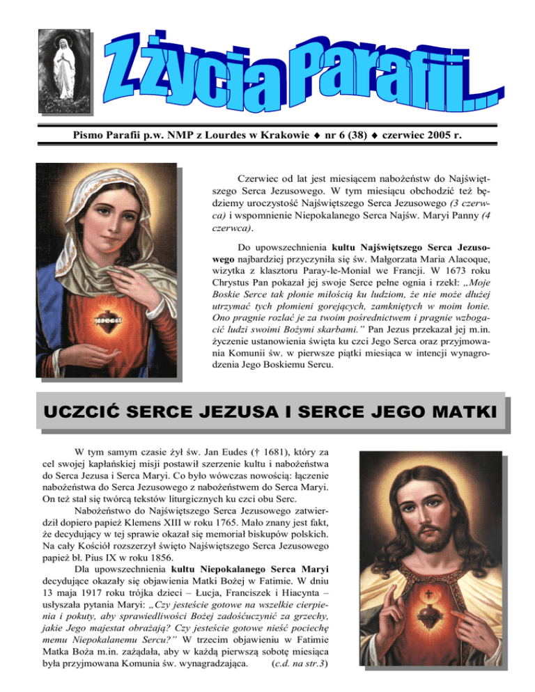 Pismo Parafii p.w. NMP z Lourdes w Krakowie  nr 6 (38)  czerwiec 2005 r. Czerwiec od lat jest miesiącem nabożeństw do Najświętszego Serca Jezusowego. W tym miesiącu obchodzić też będziemy uroczystość Najświętszego Serca Jezusowego (3 czerwca) i wspomnienie Niepokalanego Serca Najśw. Maryi Panny (4 czerwca). Do upowszechnienia kultu Najświętszego Serca Jezusowego najbardziej przyczyniła się św. Małgorzata Maria Alacoque, wizytka z klasztoru Paray-le-Monial we Francji. W 1673 roku Chrystus Pan pokazał jej swoje Serce pełne ognia i rzekł: „Moje Boskie Serce tak płonie miłością ku ludziom, że nie może dłużej utrzymać tych płomieni gorejących, zamkniętych w moim łonie. Ono pragnie rozlać je za twoim pośrednictwem i pragnie wzbogacić ludzi swoimi Bożymi skarbami.” Pan Jezus przekazał jej m.in. życzenie ustanowienia święta ku czci Jego Serca oraz przyjmowania Komunii św. w pierwsze piątki miesiąca w intencji wynagrodzenia Jego Boskiemu Sercu. UCZCIĆ SERCE JEZUSA I SERCE JEGO MATKI W tym samym czasie żył św. Jan Eudes († 1681), który za cel swojej kapłańskiej misji postawił szerzenie kultu i nabożeństwa do Serca Jezusa i Serca Maryi. Co było wówczas nowością: łączenie nabożeństwa do Serca Jezusowego z nabożeństwem do Serca Maryi. On też stał się twórcą tekstów liturgicznych ku czci obu Serc. Nabożeństwo do Najświętszego Serca Jezusowego zatwierdził dopiero papież Klemens XIII w roku 1765. Mało znany jest fakt, że decydujący w tej sprawie okazał się memoriał biskupów polskich. Na cały Kościół rozszerzył święto Najświętszego Serca Jezusowego papież bł. Pius IX w roku 1856. Dla upowszechnienia kultu Niepokalanego Serca Maryi decydujące okazały się objawienia Matki Bożej w Fatimie. W dniu 13 maja 1917 roku trójka dzieci – Łucja, Franciszek i Hiacynta – usłyszała pytania Maryi: „Czy jesteście gotowe na wszelkie cierpienia i pokuty, aby sprawiedliwości Bożej zadośćuczynić za grzechy, jakie Jego majestat obrażają? Czy jesteście gotowe nieść pociechę memu Niepokalanemu Sercu?” W trzecim objawieniu w Fatimie Matka Boża m.in. zażądała, aby w każdą pierwszą sobotę miesiąca była przyjmowana Komunia św. wynagradzająca. (c.d. na str.3) 2 Z życia Parafii… p.w. Najświętszej Maryi Panny z Lourdes w Krakowie — nr 6 (38) 2005 r. NABOŻEŃSTWO PIERWSZYCH SOBÓT MIESIĄCA Matka Najświętsza ogłosiła w Fatimie, że pragnie zaprowadzić na świecie nabożeństwo do swego Niepokalanego Serca, którego zasadniczą treścią i równocześnie wyjątkowym środkiem ratunku dla ludzkości ma być poświęcenie się ludzi Jej Sercu. Zapowiedziała, że jej Niepokalane Serce zwycięży. Zwycięstwo to związała z dwoma warunkami przekazanymi Łucji: poświęcenie Rosji Jej Niepokalanemu Sercu oraz praktykowanie nabożeństwa pięciu pierwszych sobót miesiąca. Pierwsza prośba Maryi została w sposób wiążący spełniona 25 marca 1984 roku przez papieża Jana Pawła II, w duchowej łączności ze wszystkimi biskupami świata. Rosja i świat zostały poświęcone Niepokalanemu Sercu Maryi. Ten fatimski akt poświęcenia zaowocował wielkimi łaskami, przede wszystkim rozpadem Związku Sowieckiego. Drugą prośbę, o ustanowienie nabożeństwa pięciu pierwszych sobót miesiąca z Komunią wynagradzającą, Matka Boża przedstawiała Łucji wielokrotnie, po raz pierwszy w dniu 13 czerwca 1917 roku. W dniu 10 grudnia 1925 roku Najświętsza Panna wraz z Dzieciątkiem Jezus pokazała Łucji Serce otoczone cierniową koroną. Dzieciątko Jezus napominało Ją tymi słowami: „Zlituj się nas Sercem Twej Najświętszej Matki, okolonym cierniami, które niewdzięczni ludzie wbijają w każdej chwili, a nie ma nikogo, kto by przez akt zadośćuczynienia te ciernie powyjmował.” Najświętsza Panna dodała: „Córko moja, spójrz na Serce moje otoczone cierniami, które niewdzięczni ludzie przez bluźnierstwa i niewdzięczność w każdej chwili wbijają. Przynajmniej ty pociesz mnie i przekaż, że tym wszystkim, którzy w ciągu pięciu miesięcy, w pierwsze soboty, wyspowiadają się, przyjmą Komunię św., odmówią cząstkę różańca i będą mi towarzyszyć przez kwadrans, rozważając 15 tajemnic różańcowych, w intencji zadośćuczynienia Mnie, w godzinę śmierci obiecuję przyjść z pomocą, ze wszystkimi łaskami potrzebnymi do zbawienia.” Dnia 15 lutego 1926 roku Dzieciątko Jezus powtórnie objawiło się s. Łucji wyjaśniając, że choć zalecana jest spowiedź w pierwszą sobotę miesiąca, nie jest to jednak warunkiem ważności nabożeństwa. W nocy z 29 na 30 maja 1930 roku Pan Jezus przemówił duchowo do s. Łucji i dał jej odpowiedź na pytanie, które Mu postawiła: „Dlaczego pięć sobót, a nie dziewięć albo siedem, dla uczczenia cierpień Matki Bożej?” Jezus mówił: „Moja córko, powód jest bardzo prosty: jest pięć rodzajów zniewag i bluźnierstw przeciwko Niepokalanemu Sercu Maryi.  Bluźnierstwa przeciwko Niepokalanemu Poczęciu.  Bluźnierstwa przeciw dziewictwu Matki Bożej.  Bluźnierstwa przeciw Jej Boskiemu Macierzyństwu, przy równoczesnym sprzeciwie uznania Jej za Matkę rodzaju ludzkiego.  Czyny tych, którzy usiłują publicznie wpoić w serca dzieci obojętność, pogardę, a nawet nienawiść do tej Matki Niepokalanej.  Czyny tych, którzy profanują wizerunki Najświętszej Panny.” Zgodnie z powyższym orędziem – nabożeństwo pięciu pierwszych sobót miesiąca obejmuje:  Spowiedź w intencji wynagrodzenia za jedną z pięciu zniewag wobec Niepokalanego Serca Maryi, o których mówił Jezus, lub za każdym razem wynagrodzenie za zniewagi w ogólności. Można wzbudzić taką intencję podczas przygotowywania się do spowiedzi lub w trakcie otrzymywania rozgrzeszenia.  Komunię świętą w pierwszą sobotę miesiąca. Po przyjęciu Komunii św. należy wzbudzić intencję wynagradzającą. Można odmówić t