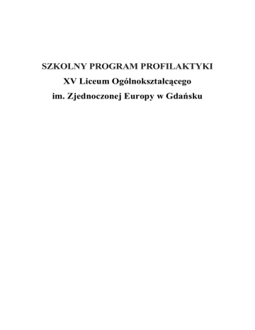 SZKOLNY PROGRAM PROFILAKTYKI XV Liceum Ogólnokształcącego im. Zjednoczonej Europy w Gdańsku Program realizowany jest w oparciu o następujące podstawy prawne dla działań profilaktycznych w szkołach: 1. Ustawa z dnia 7 września 1991 r. o systemie oświaty z późniejszymi zmianami. 2. Ustawa z dnia 19 sierpnia 1994 r. o ochronie zdrowia psychicznego (Dz. U. z dnia 20 października 1994 r.) oraz ustawa o zmianie ustawy z dnia 3 grudnia 2010 r. o ochronie zdrowia psychicznego (Dz. U. z dnia 10 stycznia 2011 r.) 3. Ustawa z dnia 26 października 1982 r. o wychowaniu w trzeźwości i przeciwdziałaniu alkoholizmowi (Dz. U. Nr 35, poz. 230 ) nowelizacja z dnia 12 września 1996 r. (Dz. U. Nr 127, poz. 593) z późniejszymi zmianami (Dz. U. Nr 70. poz. 473 z dnia 1 lipca 2011 r.) 4. Ustawa z dnia 29 lipca 2005 r - Ustawa o przeciwdziałaniu narkomanii (Dz. U. Nr 179, poz.145) oraz ustawa o zmianie ustawy o przeciwdziałaniu narkomanii z dnia 15 kwietnia 2011 r. (Dz. U. Nr 105, poz. 614 z dnia 24 maja 2011 r.) 5. Ustawa z dnia 9 listopada 1995 r. o ochronie zdrowia przed następstwami używania tytoniu i wyrobów tytoniowych oraz ustawa o zmianie ustawy o ochronie zdrowia przed następstwami używania tytoniu i wyrobów tytoniowych z dnia 8 kwietnia 2010 r. oraz ustawy Państwowej Inspekcji Sanitarnej ( Dz. U. Nr 81, poz .529 z dnia 8 kwietnia 2010 r.) 6. Rozporządzenie Ministra Edukacji Narodowej i Sportu z dnia 31 stycznia 2003 r. (Dz. U. 2003/26/2260) w sprawie szczegółowych form działalności wychowawczej i zapobiegawczej wśród dzieci i młodzieży zagrożonej uzależnieniem. 7. Konstytucja Rzeczpospolitej Polskiej. 8. Powszechna Deklaracja Praw Człowieka. 9. Konwencja o Prawach Dziecka (Dz. U. 1991/120/526, 2000/2/11) 10. Rządowy program na lata 2008-2013 „Bezpieczna i przyjazna szkoła” 2 Wstęp: Założeniem Szkolnego Programu Profilaktyki jest wspomaganie wychowawczej roli rodziny z uwzględnieniem prawa do przekonań religijnych, światopoglądowych oraz wolności sumienia. Szkoła ma obowiązek zapewnić uczniom powszechny dostęp do nauki i wychowania, ochronę przed przemocą, a także kierować się dobrem uczniów, troską o jego zdrowie, postawę moralną i obywatelską z zachowaniem poszanowania godności osobistej. Szkolny Program Profilaktyki jest spójny z Programem Wychowawczym Szkoły, Szkolnym Zestawem Programów Nauczania, Wewnątrzszkolnym Systemem Oceniania . Program jest przygotowany dla wszystkich uczniów naszej szkoły w ramach godzin wychowawczych, wychowania do życia w rodzinie i innych przedmiotów, na których mogą być realizowane założenia programowe. Realizatorami programu są wszyscy nauczyciele, wychowawcy, pedagog i psycholog szkolny, pielęgniarka szkolna, katecheci oraz zapraszani specjaliści do spraw profilaktyki. Program proponuje kształcenie dojrzałej postawy ucznia wobec samego siebie, jak i wobec otaczającej go rzeczywistości. Został tak opracowany, aby zapobiegał zagrożeniom współczesnej młodzieży i pomagał pracować nad problemami istniejącymi wśród naszych uczniów. Problemy zostały wyłonione dzięki ankietom i pracy wychowawczej na terenie szkoły. Na podstawie wyników obserwacji, rozmów, wywiadów i ankiet, ustalono listę priorytetów w zakresie działań profilaktycznych w pracy z uczniami i rodzicami. Program obejmuje cztery obszary oddziaływań: promocja zdrowia, profilaktyka uzależnień, doskonalenie komunikacji interpersonalnej, przeciwdziałanie negatywnym zachowaniom młodzieży; Warunkiem skutecznej profilaktyki jest skoordynowanie działań we wszystkich obszarach funkcjonowania. Zadania z poszczególnych obszarów będą realizowane w ramach godzin do dyspozycji wychowawcy, zajęć z określonych przedmiotów oraz różnych form działalności pozalekcyjnej szkoły. Przewidziane zostało uczestnictwo uczniów w warsztatach, spektaklach, akcjach, festynach i jarmarkach, zgodnie z tematyką programu. Sprawdzianem przydatności programu będzie jego ewaluacja. Wnioski z niej posłużą modyfikacji i doskonaleniu programu pod względem konstrukcji, tematyki oraz form realizacji. Program profilaktyki w XV LO jest wynikiem diagnozy, w której uwzględniono potrzeby rozwojowe uczniów, wynikające ze specyfiki środowiska szkoły oraz szeroko pojęty kontekst przemian społeczno-ekonomicznych w kraju. 3 Diagnoza środowiska szkolnego – identyfikacja problemów: Podstawą do opracowania Szkolnego Programu Profilaktyki są informacje zebrane od nauczycieli, rodziców i uczniów za pomocą: - obserwacji zachowań i problemów młodzieży na terenie szkoły oraz w sytuacjach pozalekcyjnych, - analizy problemów edukacyjnych i wychowawczych zgłaszanych do pedagoga i psychologa szkolnego oraz wychowawców (analiza dokumentacji, rozmowa), - analizy problemów zdrowotnych rejestrowanych i dostrzeganych przez pielęgniarkę szkolną (rozmowa), - analizy problemów zgłaszanych przez rodziców (konsultacje indywidualne, zebrania klasowe) Cele programu: 1. Stworzenie jednolitego i kompleksowego oddziaływania profilaktycznego na uczniów (rodzice - nauczyciele – pracownicy administracji i obsługi szkoły - pracownicy instytucji gdańskich, działających na rzecz młodzieży); 2. Wspieranie wychowania i nauczania wszędzie tam, gdzie pojawia się zagrożenie dla rozwoju młodzieży, a także w przypadku uczniów o szczególnych uzdolnieniach i pasjach; 3. Koncentrowanie się na tworzeniu warunków, w których młodzież ma dostęp do przyjaznych i bezpiecznych grup rówieśniczych, np. poprzez biwaki, wycieczki, zabawy, zajęcia pozalekcyjne itp.; 4. Wspieranie rodziców w ich funkcjach wychowawczych i edukacyjnych poprzez różne formy doskonalenia umiejętności rodziców w pracy profilaktycznej; 5. Uświadamianie uczniów, rodziców i nauczycieli o konieczności działań profilaktycznych, które mają wpływu na przyszłe decyzje i życie młodych ludzi. 4 Harmonogram działań w zdiagnozowanych 