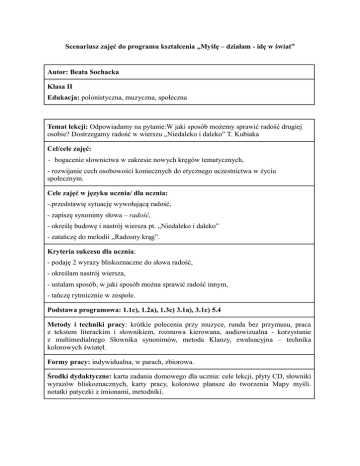 Scenariusz zajęć do programu kształcenia „Myślę – działam - idę w świat” Autor: Beata Sochacka Klasa II Edukacja: polonistyczna, muzyczna, społeczna Temat lekcji: Odpowiadamy na pytanie:W jaki sposób możemy sprawić radość drugiej osobie? Dostrzegamy radość w wierszu „Niedaleko i daleko” T. Kubiaka Cel/cele zajęć: - bogacenie słownictwa w zakresie nowych kręgów tematycznych, - rozwijanie cech osobowości koniecznych do etycznego uczestnictwa w życiu społecznym. Cele zajęć w języku ucznia/ dla ucznia: -.przedstawię sytuację wywołującą radość, - zapiszę synonimy słowa – radość, - określę budowę i nastrój wiersza pt. „Niedaleko i daleko” - zatańczę do melodii „Radosny krąg”. Kryteria sukcesu dla ucznia: - podaję 2 wyrazy bliskoznaczne do słowa radość, - określam nastrój wiersza, - ustalam sposób, w jaki sposób można sprawić radość innym, - tańczę rytmicznie w zespole. Podstawa programowa: 1.1c), 1.2a), 1.3c) 3.1a), 3.1c) 5.4 Metody i techniki pracy: krótkie polecenia przy muzyce, runda bez przymusu, praca z tekstem literackim i słownikiem, rozmowa kierowana, audiowizualna - korzystanie z multimedialnego Słownika synonimów, metoda Klanzy, ewaluacyjna – technika kolorowych świateł. Formy pracy: indywidualna, w parach, zbiorowa. Środki dydaktyczne: karta zadania domowego dla ucznia: cele lekcji, płyty CD, słowniki wyrazów bliskoznacznych, karty pracy, kolorowe plansze do tworzenia Mapy myśli. notatki patyczki z imionami, metodniki. Przebieg zajęć „Drogowskazy” -wskazówki Centra Aktywnej Edukacji i uwagi o realizacji Organizacja pracy: • Tydzień przed lekcją uczniowie otrzymują zadanie do wykonania – załącznik nr1 • Nauczyciel laminuje karty z koniczynkami, przygotowując je na lekcję. 1. Powitanie piosenką „Przyjaciel wie” – płyta CD 2. Zapisanie tematu lekcji - jako pytania kluczowego 3. Omówienie celów lekcji i nacobezu - wklejenie do zeszytu. 4. Zabawa ruchowa „Spotkania” • Jesteśmy w wesołym miasteczku, spacerujemy przy dźwiękach artystyczno ruchowe polonistyczno komunikacyjne artystyczno – ruchowe grzechotki i uśmiechamy się do siebie, gdy dźwięk cichnie, spotkamy znajomych – witamy się z jak największa liczbą dzieci, w sposób, który usłyszymy: - skłaniamy głowę „Dzień dobry” , - przybijamy piątkę, - ściskamy się, - machamy do siebie „Hallo!” 5. Sprawdzenie zadania domowego- zał. nr 1 • uczeń dokonuje samooceny, • nauczyciel otrzymuje zestawienie ilościowe wykonania zadania przez klasę, notuje znakiem + lub 1 p. w Karcie zadań domowych. 6. Prezentowanie sytuacji wywołujących radość - na podstawie zadania domowego – runda bez przymusu; 7. Praca ze Słownikiem wyrazów bliskoznacznych - wyszukiwanie synonimów słowa radość • wybór uczniów do czytania techniką patyczków, kryterium I • zapisywanie na karcie pracy zał. nr 2 – ćw. 1, 2 8. Korzystanie z multimedialnego Słownika synonimów polonistyczno komunikacyjne • praca w parach, uczniowie zapisują wybrane synonimy, kryterium I • SYNONIMY SŁOWA RADOŚĆ: frajda, wesołość, przyjemność, euforia, sielanka, idylla, dobry nastrój, pogoda ducha 9. Tworzenie Mapy myśli •na tablicy magnetycznej powstaje notatka graficzna – techniką słońce 10. Czytanie wiersza „Niedaleko i daleko” Tadeusza Kubiaka, 11. Określanie budowy i kompozycji wiersza zał. nr 2 – ćw. 3 kryterium II 12. Odpowiedź na pytanie kluczowe - Burza mózgów – zapisywanie pomysłów na sprawienie radości drugiej osobie - kryterium III 13. Taniec „Radosny krąg” kryterium IV • Swobodne słuchanie melodii. • Wprawki taneczne na hasło (podaje nauczyciel): podskoki po obwodzie koła, w kierunku do środka i na zewnątrz, wokół partnera, który klęka na jedno kolano, z przytupem wokół siebie… • Powtórzenie ruchów, rytmicznie do melodii. 14. Ewaluacja zajęć – korzystając z metodników uczniowie oceniają lekcję - technika kolorowych świateł. 15. Pożegnanie – nauczyciel wręcza każdemu uczniowi zalaminowaną zakładkę do książki, podkreślając, że chce sprawić w ten sposób radość. Zał. nr 1a Karta zadania domowego Informacje ogólne: - zadanie do wykonania podane uczniom tydzień przed lekcją ___________________________________________________ Temat zadania: „Radość jest w nas” Termin wykonania: ……………. Treść zadania: ⇒Spraw radość wybranej osobie. ⇒Zapisz odpowiedzi na pytania: 1.Komu i w jaki sposób sprawiłeś/ sprawiłaś radość? 2.Jak zareagowała wybrana przez Ciebie osoba? Dla chętnych! 3.Co czułeś/czułaś sprawiając radość innym? Nacobezu: 1)Dostrzegam wartości pozytywne: dobroć, przyjaźń, bezinteresowność, miłość. 2)Tworzę krótką wypowiedź pisemną - notatkę na temat wykonanego zadania. Zał. nr 2 Karta pracy Temat: Jak możemy sprawiać radość innym? (pytanie kluczowe) Ćwiczenie 1 Zapisz wyrazy bliskoznaczne słowa - radość ………………………………………………………………………………………………… Ćwiczenie 2 Podaj nazwę słownika z jakiego korzystałeś/korzystałaś szukając synonimów. ………………………………………………………………………………………………… ………………………………………………………………………………………………… Ćwiczenie 3 Wysłuchałeś/ wysłuchałaś wiersza pt. „Niedaleko i daleko” Tadeusza Kubiaka, Dokonaj analizy - określ budowę i kompozycję wiersza. 1.Kim jest osoba mówiąca w wierszu (podmiot liryczny) ? ………………………………………………………………………………………………… 2.Kto jest adresatem lirycznym w wierszu ………………………………………………………………………………………………… 3. Jaka jest budowa wiersza? Skreśl błędne określeni