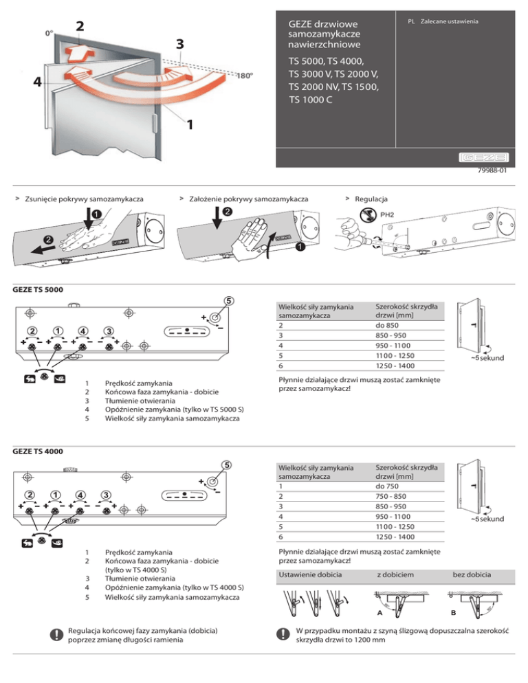 0° PL Zalecane ustawienia GEZE drzwiowe samozamykacze nawierzchniowe 2 3 180° 4 TS 5000, TS 4000, TS 3000 V, TS 2000 V, TS 2000 NV, TS 1500, TS 1000 C 1 79988-01 > Zsuniêcie pokrywy samozamykacza > Za³o¿enie pokrywy samozamykacza > Regulacja 2 1 PH2 ° 90 2 1 GEZE TS 5000 Wielkoœæ si³y zamykania samozamykacza 2 3 4 5 6 1 2 3 4 5 Prêdkoœæ zamykania Koñcowa faza zamykania - dobicie T³umienie otwierania OpóŸnienie zamykania (tylko w TS 5000 S) Wielkoœæ si³y zamykania samozamykacza Szerokoœæ skrzyd³a drzwi [mm] do 850 850 - 950 950 - 1100 1100 - 1250 1250 - 1400 sekund P³ynnie dzia³aj¹ce drzwi musz¹ zostaæ zamkniête przez samozamykacz! GEZE TS 4000 Wielkoœæ si³y zamykania samozamykacza 1 2 3 4 5 6 1 2 3 4 5 Prêdkoœæ zamykania Koñcowa faza zamykania - dobicie (tylko w TS 4000 S) T³umienie otwierania OpóŸnienie zamykania (tylko w TS 4000 S) Wielkoœæ si³y zamykania samozamykacza Regulacja koñcowej fazy zamykania (dobicia) poprzez zmianê d³ugoœci ramienia Szerokoœæ skrzyd³a drzwi [mm] do 750 750 - 850 850 - 950 950 - 1100 1100 - 1250 1250 - 1400 sekund P³ynnie dzia³aj¹ce drzwi musz¹ zostaæ zamkniête przez samozamykacz! Ustawienie dobicia z dobiciem bez dobicia W przypadku monta¿u z szyn¹ œlizgow¹ dopuszczalna szerokoœæ skrzyd³a drzwi to 1200 mm GEZE GmbH Tel.: 0049 7152 203-0 Fax: 0049 7152 203-310 P.O.Box 1363 71229 Leonberg Germany www.geze.com 79988-01 GEZE TS 3000 V / GEZE TS 3000 EN3 Wielkoœæ si³y zamykania samozamykacza Do oporu 2,5 obrotu 5 obrotów Do oporu + Szerokoœæ skrzyd³a drzwi [mm] do 750 750 - 850 850 - 950 950 - 1100 sekund P³ynnie dzia³aj¹ce drzwi musz¹ zostaæ zamkniête Prêdkoœæ zamykania przez samozamykacz! Koñcowa faza zamykania - dobicie T³umienie otwierania (tylko w TS 3000 VBC) Wielkoœæ si³y zamykania samozamykacza (brak regulacji w TS 3000 EN3 - sta³a wielkoœæ 3 - dla szerokoœci skrzyd³a drzwi do 950 mm) 1 2 3 5 GEZE TS 2000 V 52 44 5 2 44 2 1 1 Prêdkoœæ zamykania Wielkoœæ si³y zamykania samozamykacza 2 Wielkoœæ 2 Szerokoœæ skrzyd³a drzwi [mm] 750 - 850 4 Wielkoœæ 4 850 - 1100 5 Wielkoœæ 5 1100 - 1250 P³ynnie dzia³aj¹ce drzwi musz¹ zostaæ zamkniête przez samozamykacz! Ustawienie dobicia z dobiciem sekund bez dobicia Ustawienie wielkoœci si³y zamykania poprzez zmianê po³o¿enia samozamykacza Regulacja koñcowej fazy zamykania (dobicia) poprzez zmianê d³ugoœci ramienia GEZE TS 2000 V BC 52 44 2 5 2 44 2 1 1 2 Prêdkoœæ zamykania Koñcowa faza zamykania - dobicie Ustawienie wielkoœci si³y zamykania poprzez zmianê po³o¿enia samozamykacza Wielkoœæ si³y zamykania samozamykacza 2 Wielkoœæ 2 Szerokoœæ skrzyd³a drzwi [mm] 750 - 850 4 Wielkoœæ 4 850 - 1100 5 Wielkoœæ 5 1100 - 1250 P³ynnie dzia³aj¹ce drzwi musz¹ zostaæ zamkniête przez samozamykacz! sekund W przypadku monta¿u z szyn¹ œlizgow¹ dopuszczalna szerokoœæ skrzyd³a drzwi to 1000 mm GEZE TS 2000 NV Wielkoœæ si³y zamykania samozamykacza Do oporu 4 obroty Do oporu + 1 2 3 5 Prêdkoœæ zamykania Koñcowa faza zamykania - dobicie T³umienie otwierania (tylko w TS 2000 NV BC) Wielkoœæ si³y zamykania samozamykacza Szerokoœæ skrzyd³a drzwi [mm] do 850 850 - 950 do 1100 P³ynnie dzia³aj¹ce drzwi musz¹ zostaæ zamkniête przez samozamykacz! sekund GEZE GmbH Tel.: 0049 7152 203-0 Fax: 0049 7152 203-310 P.O.Box 1363 71229 Leonberg Germany www.geze.com 79988-01 GEZE TS 1500 Wielkoœæ si³y zamykania samozamykacza 2 Szerokoœæ skrzyd³a drzwi [mm] 850 - 950 90 ° 1 A 950 - 1100 sekund ° Prêdkoœæ zamykania Koñcowa faza zamykania - dobicie 90 1 2 B P³ynnie dzia³aj¹ce drzwi musz¹ zostaæ zamkniête przez samozamykacz! W przypadku monta¿u z szyn¹ œlizgow¹ dopuszczalna szerokoœæ skrzyd³a drzwi to 750 mm Ustawienia wielkoœci si³y zamykania samozamykacza poprzez obrócenie w trakcie monta¿u stopki ramienia GEZE TS 1000 C Wielkoœci si³y zamykania samozamykacza 2 Szerokoœæ skrzyd³a drzwi [mm] do 750 90 ° 1 A 1 2 Prêdkoœæ zamykania Koñcowa faza zamykania - dobicie 750 - 950 ° 90 B Ustawienia wielkoœci si³y zamykania samozamykacza poprzez obrócenie w trakcie monta¿u stopki ramienia P³ynnie dzia³aj¹ce drzwi musz¹ zostaæ zamkniête przez samozamykacz! Wskazówki monta¿owe: - Monta¿ winien byæ wykonany przez osobê wykwalifikowan¹ - Monta¿ nale¿y wykonaæ zgodnie z do³¹czon¹ instrukcj¹, szablonem monta¿owym, rysunkami, powy¿szymi wytycznymi - Je¿eli to konieczne, drzwi nale¿y doposa¿yæ w dodatkowy odbój ograniczaj¹cy k¹t otwarcia drzwi - Mo¿liwy k¹t otwarcia drzwi jest œciœle uzale¿niony od ich typu oraz parametrów geometrycznych - W³aœciwe dzia³anie samozamykacza jest zale¿ne od sposobu monta¿u i wielkoœci drzwi - Si³a zamykania samozamykacza na drzwiach przeciwpo¿arowych i dymoszczelnych powinna byæ nastawiona na wartoœæ nie mniejsz¹ ni¿ 3 - Na drzwiach przeciwpo¿arowych i dymoszczelnych nie nale¿y stosowaæ mechanicznych blokad otwarcia Zakres okresowej konserwacji: - Sprawdzenie, czy nie nast¹pi³y wycieki oleju z korpusu samozamykacza - Sprawdzenie momentu dokrêcania i ewentualnego doci¹gniêcia œrub mocuj¹cych korpus samozamykacza, szynê b¹dŸ ramiê oraz œruby ³¹cz¹cej korpus z szyn¹ lub ramieniem - Sprawdzenie zu¿ycia elementów œlizgowych (kostka, szyna) i ewentualna wymiana (nie dotyczy samozamykaczy z ramieniem no¿ycowym) - Sprawdzenie stanu przegubu ramienia i blokady otwarcia - Wyregulowanie parametrów samozamykacza zwi¹zanych z prêdkoœci¹ oraz si³¹ zamykania - Nasmarowanie przegubu ramienia (nie dotyczy samozamykaczy szynowych) - Sprawdzenie i wyregulowanie mechanizmu kolejnoœci zamykania (dotyczy wersji do drzwi dwuskrzyd³owych z mechaniczn¹ regulacj¹ kolejnoœci zamykania) - Sprawdzenie po³¹czeñ elektrycznych, sprawdzenie stanu okablowania, przycisków zwalniaj¹cych w blokadach elektromagnetycznych (dotyczy wersji z elektromechaniczn¹ blokad¹ po³o¿enia otwarcia) sekund