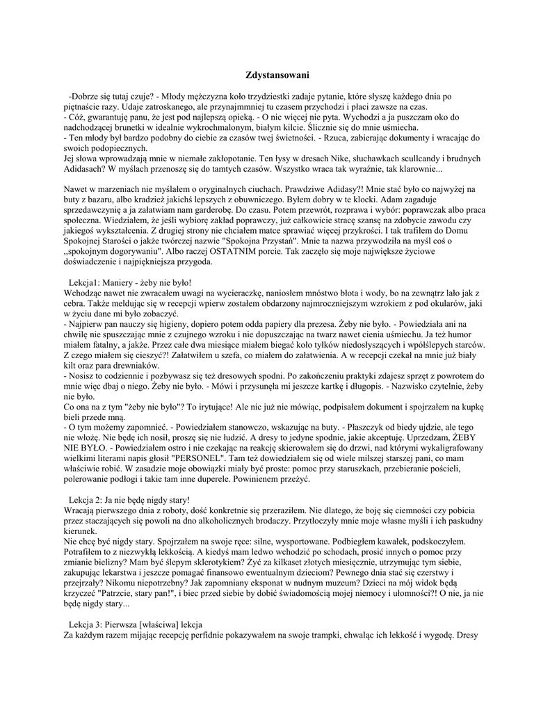 Zdystansowani -Dobrze się tutaj czuje? - Młody mężczyzna koło trzydziestki zadaje pytanie, które słyszę każdego dnia po piętnaście razy. Udaje zatroskanego, ale przynajmmniej tu czasem przychodzi i płaci zawsze na czas. - Cóż, gwarantuję panu, że jest pod najlepszą opieką. - O nic więcej nie pyta. Wychodzi a ja puszczam oko do nadchodzącej brunetki w idealnie wykrochmalonym, białym kilcie. Ślicznie się do mnie uśmiecha. - Ten młody był bardzo podobny do ciebie za czasów twej świetności. - Rzuca, zabierając dokumenty i wracając do swoich podopiecznych. Jej słowa wprowadzają mnie w niemałe zakłopotanie. Ten łysy w dresach Nike, słuchawkach scullcandy i brudnych Adidasach? W myślach przenoszę się do tamtych czasów. Wszystko wraca tak wyraźnie, tak klarownie... Nawet w marzeniach nie myślałem o oryginalnych ciuchach. Prawdziwe Adidasy?! Mnie stać było co najwyżej na buty z bazaru, albo kradzież jakichś lepszych z obuwniczego. Byłem dobry w te klocki. Adam zagaduje sprzedawczynię a ja załatwiam nam garderobę. Do czasu. Potem przewrót, rozprawa i wybór: poprawczak albo praca społeczna. Wiedziałem, że jeśli wybiorę zakład poprawczy, już całkowicie stracę szansę na zdobycie zawodu czy jakiegoś wykształcenia. Z drugiej strony nie chciałem matce sprawiać więcej przykrości. I tak trafiłem do Domu Spokojnej Starości o jakże twórczej nazwie "Spokojna Przystań". Mnie ta nazwa przywodziła na myśl coś o ,,spokojnym dogorywaniu". Albo raczej OSTATNIM porcie. Tak zaczęło się moje największe życiowe doświadczenie i najpiękniejsza przygoda. Lekcja1: Maniery - żeby nie było! Wchodząc nawet nie zwracałem uwagi na wycieraczkę, naniosłem mnóstwo błota i wody, bo na zewnątrz lało jak z cebra. Także meldując się w recepcji wpierw zostałem obdarzony najmroczniejszym wzrokiem z pod okularów, jaki w życiu dane mi było zobaczyć. - Najpierw pan nauczy się higieny, dopiero potem odda papiery dla prezesa. Żeby nie było. - Powiedziała ani na chwilę nie spuszczając mnie z czujnego wzroku i nie dopuszczając na twarz nawet cienia uśmiechu. Ja też humor miałem fatalny, a jakże. Przez całe dwa miesiące miałem biegać koło tyłków niedosłyszących i wpółślepych starców. Z czego miałem się cieszyć?! Załatwiłem u szefa, co miałem do załatwienia. A w recepcji czekał na mnie już biały kilt oraz para drewniaków. - Nosisz to codziennie i pozbywasz się też dresowych spodni. Po zakończeniu praktyki zdajesz sprzęt z powrotem do mnie więc dbaj o niego. Żeby nie było. - Mówi i przysunęła mi jeszcze kartkę i długopis. - Nazwisko czytelnie, żeby nie było. Co ona na z tym "żeby nie było"? To irytujące! Ale nic już nie mówiąc, podpisałem dokument i spojrzałem na kupkę bieli przede mną. - O tym możemy zapomnieć. - Powiedziałem stanowczo, wskazując na buty. - Płaszczyk od biedy ujdzie, ale tego nie włożę. Nie będę ich nosił, proszę się nie łudzić. A dresy to jedyne spodnie, jakie akceptuję. Uprzedzam, ŻEBY NIE BYŁO. - Powiedziałem ostro i nie czekając na reakcję skierowałem się do drzwi, nad którymi wykaligrafowany wielkimi literami napis głosił "PERSONEL". Tam też dowiedziałem się od wiele milszej starszej pani, co mam właściwie robić. W zasadzie moje obowiązki miały być proste: pomoc przy staruszkach, przebieranie pościeli, polerowanie podłogi i takie tam inne duperele. Powinienem przeżyć. Lekcja 2: Ja nie będę nigdy stary! Wracają pierwszego dnia z roboty, dość konkretnie się przeraziłem. Nie dlatego, że boję się ciemności czy pobicia przez staczających się powoli na dno alkoholicznych brodaczy. Przytłoczyły mnie moje własne myśli i ich paskudny kierunek. Nie chcę być nigdy stary. Spojrzałem na swoje ręce: silne, wysportowane. Podbiegłem kawałek, podskoczyłem. Potrafiłem to z niezwykłą lekkością. A kiedyś mam ledwo wchodzić po schodach, prosić innych o pomoc przy zmianie bielizny? Mam być ślepym sklerotykiem? Żyć za kilkaset złotych miesięcznie, utrzymując tym siebie, zakupując lekarstwa i jeszcze pomagać finansowo ewentualnym dzieciom? Pewnego dnia stać się czerstwy i przejrzały? Nikomu niepotrzebny? Jak zapomniany eksponat w nudnym muzeum? Dzieci na mój widok będą krzyczeć "Patrzcie, stary pan!", i biec przed siebie by dobić świadomością mojej niemocy i ułomności?! O nie, ja nie będę nigdy stary... Lekcja 3: Pierwsza [właściwa] lekcja Za każdym razem mijając recepcję perfidnie pokazywałem na swoje trampki, chwaląc ich lekkość i wygodę. Dresy też raczej średnio komponowały się z białym uniformem, ale postanowiłem, że tanio skóry nie sprzedam, nie dam sobą pomiatać, nie będzie mi banda wapniaków dyktować warunków. To jednak nie więzienie. Po tygodniu dopiero pozwolono mi na pierwszy kontakt z pacjentami. Choć nienawidziłem tej roboty, byłem lekko podekscytowany, gdy kazano mi iść na świetlicę pełną podopiecznych ośrodka, coś tam zanieść. Tak jak się można było spodziewać, ujrzałem kilkanaście siwych osób, siedzących niemal w totalnej ciszy. Jedni odbywali zapewne niezwykle fascynującą partyjkę spowolnionych szachów, inni grali w Chińczyka przy pomocy lupy, jeszcze inni czytali. Najbardziej rzucała się w oczy trójka hazardowiczów. Dwóch mężczyzn i kobieta grali w pokera na dwie karty w absolutnym skupieniu wyliczając nieaktualne pieniądze, bony towarowe, karnety i bilety koncertowe. - Pink Floyd?! Uwielbiam ich! - Powiedziałem na tyle głośno, by zwrócić na siebie uwagę całej świetlicy. Zawstydzony podniosłem palec do ust, przepraszająco wzruszając ramionami i cichutko podszedłem do grających. Od razu przysunąłem sobie krzesło do ich stolika i usiadłem na nim okrakiem, opierając łokcie na oparciu. Naprawdę znacie Floydów? Nie jesteście na nich zbyt...zamierzchli? - Spytałem autentycznie zainteresowany, przenosz