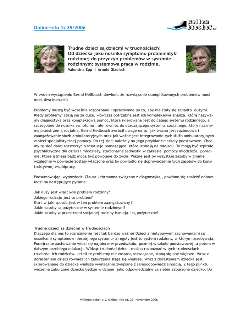-- Online-Info Nr.29/2006 Trudne dzieci są dziećmi w trudnościach! Od dziecka jako nośnika symptomu problematyki rodzinnej do przyczyn problemów w systemie rodzinnym: systemowa praca w rodzinie. Valentina Epp i Arnold Gladisch W swoim wystąpieniu Bernd Hellbusch dowiódł, że rozwiązanie skomplikowanych problemów musi mieć dwa kierunki: Problemy muszą być wcześnie rozpoznane i opracowane po to, aby nie stały się zanadto dużymi. Kiedy problemy stają się za duże, wówczas potrzebna jest ich kompleksowa analiza, którą nazywamy diagnostyką oraz kompleksowa pomoc, która skierowana jest do całego systemu rodzinnego, a szczególnie do nośnika symptomu , ale również do otaczającego systemu socjalnego, który nazwiemy przestrzenią socjalną. Bernd Hellbusch zwrócił uwagę na to, jak ważna jest rozbudowa i zaangażowanie służb ambulatoryjnych oraz jak ważne jest integrowanie tych służb ambulatoryjnych w sieci specjalistycznej pomocy. Do tej sieci należały na jego przykładzie szkoły podstawowe. Chcemy tę sieć dalej rozszerzyć o insytucje pomagające, które istnieją na miejscu. To mogą być szpitale psychiatryczne dla dzieci i młodzieży, stacjonarne jednostki w zakresie pomocy młodzieży, poradnie, które istnieją bądź mogą być powołane do życia. Ważne jest by wszystkie zasoby w gminie względnie w powiecie zostały włączone oraz by powiodło się doprowadzenie tych zasobów do konstruktywnej współpracy. Podsumowując wypowiedzi Clausa Lehrmanna związane z diagnostyką , powinno się znaleźć odpowiedzi na następujące pytania: Jak duży jest właściwie problem rodzinny? Jakiego rodzaju jest to problem? Kto i w jaki sposób jest w ten problem zaangażowany ? Jakie zasoby są pożyteczne w systemie rodzinnym? Jakie zasoby w przestrzeni socjalnej rodziny istnieją i są pożyteczne? Trudne dzieci są dziećmi w trudnościach Dlaczego dla nas to rozróżnienie jest tak bardzo ważne? Dzieci z nietypowymi zachowaniami są nośnikami symptomów niespójnego systemu- z reguły jest to system rodzinny, w którym przebywają. Podejrzane zachowanie widzi się najpierw w przedszkolu, później w szkole podstawowej, a potem w dalszym przebiegu edukacji. Widząc trudności dzieci, można rozpoznać w tych trudnościach trudności ich rodziców. Jeżeli te problemy nie zostaną rozwiązane, staną się one większe. Wraz z dorasteniem dzieci również ich zaburzenia stają się większe. Wraz z dorasteniem dziecka jest skierowanane do dziecka większe wymaganie związane z samoodpowiedzialnością. Z tego punktu widzenia zaburzone dziecko będzie widziane jako odpowiedzialne za siebie zaburzone dziecko. Do Wellenbrecher e.V. Online-Info Nr. 29, November 2006 -- niego będzie adresowane oczekiwanie, aby zaprzestać swojego nietypowego zachowania albo „zakasowanie“ odpowiednich konsekwencji. W ten sposób dochodzi do tego, że tradycyjnym rozwiązaniem dla dzieci i młodzieży z kompleksową problematyką zachowania w wielu krajach jest umieszczenie w zastępujących rodzinę ośrodkach. Skoro rodzina nie mogła tego dziecka wychować i go uzdolnić do odpowiedniego zachowania, to trzeba ją zastąpić profesjonalnym systemem- tradycyjnie w naszym kraju były to instytucje wychowawcze, później uzupełnione przez rodziny zastępcze. Kiedy przedstawiamy to tak ogólnie, wiemy bardzo dobrze o przypadkach, gdzie nic innego nie pozostaje aniżeli chronienie dziecka. Są przypadki, gdzie na podstawie absolutnego wypadnięcia rodziców jako wychowujących w rezultacie problematyki uzależnieniowej czy w rezultacie nadużyć względem dziecka, czy maltretowania dziecka, czy w przypadku pobytu rodziców w więzieniu bądź śmierci rodziców państwo musi zrealizować prawo dziecka, bądź młodego człowieka do wychowania. W większości przypadków dzieci i młodzież sygnalizują swoją symptomatyką trudności swoich rodziców, które są rozwiązywalne i według nas również muszą one być rozwiązywane w systemie rodzinnym. Spójrzmy dla potwierdzenia tej hipotezy jeszcze raz na to, jakie konsekwencje ma zazwyczaj usunięcie dziecka z systemu rodzinnego: •Często nie zostaje osiągnięty pożądany cel, dziecko zachowuje się nietypowo. •Po usunięciu największego „przeszkadzającego, rozrabiającego“ kolejne dziecko zachowuje się nietypowo. •W nowym kontekście wychowawczym dzieci umieszczone w instytucji opiekuńczo- wychowawczej często powtarzają problematykę swoich rodziców ze względu na lojalność względem swoich rodziców i swojej rodziny. Często wiele nastolatków nie pije alkoholu, pomimo, że mają rodziców chorych na chorobę alkoholową. W momencie umieszczenia w instytucji opiekuńczo-wychowawczej, zaczynają picie i pokazują w ten sposób swoją przynależność do systemu rodzinnego. •Patrząc w odniesieniu na sukces na skuteczność umieszczenia w instytucji opiekuńczo- wychowawczej oraz na koszty, za szybkie i niekonieczne umieszczenie w instytucji opiekuńczo- wychowawczej jest za drogie. Iść nowymi drogami Nikt nie wpada na pomysł wymiany silnika, gdy nagle zepsuje się samochód. Czy istnieją inne rozwiązania aniżeli umieszczenie w instytucji opiekuńczo- wychowawczej, w momencie kiedy rodzice wypadają ze swojej zdolności wychowawczej albo zawiodą? Badania i rozpoznania w różnych krajach ( USA, Holandia, Skandynawia, Szwajcaria, Niemcy itd.) dowodzą skuteczną i korzystną pod względem kosztów alternatywę: ambulatoryjną systemową pracę rodzinną. Jej celem jest rozpoznanie błędów w systemie rodzinnym oraz nie zastąpienie, a uzupełnienie rodziny w tym czego jej brakuje. Wraz z tą formą pomocy uzupełniającej rodzinę zostanie umożliwiony i zapewniony rozwój dziecka. Jednak kiedy należy przedsięwziąć kroki zastępujące, a kiedy uzupełniające rodzinę? Kiedy instytucje o tym decydujące mają pewność, że konieczne jest jedno albo drugie rozwiązanie? W tym miejscu mo