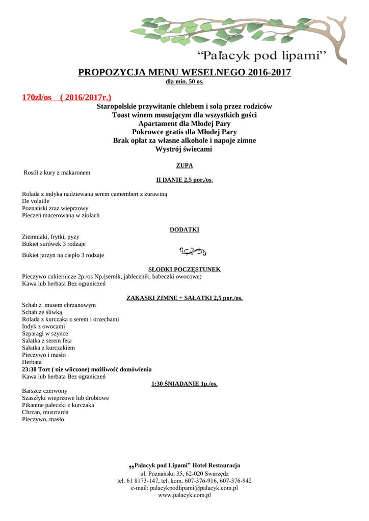 PROPOZYCJA MENU WESELNEGO 2016-2017 dla min. 50 os. 170zł/os ( 2016/2017r.) Staropolskie przywitanie chlebem i solą przez rodziców Toast winem musującym dla wszystkich gości Apartament dla Młodej Pary Pokrowce gratis dla Młodej Pary Brak opłat za własne alkohole i napoje zimne Wystrój świecami ZUPA Rosół z kury z makaronem II DANIE 2,5 por./os. Rolada z indyka nadziewana serem camembert z żurawiną De volaille Poznański zraz wieprzowy Pieczeń macerowana w ziołach DODATKI Ziemniaki, frytki, pyzy Bukiet surówek 3 rodzaje Bukiet jarzyn na ciepło 3 rodzaje SŁODKI POCZĘSTUNEK Pieczywo cukiernicze 2p./os Np.(sernik, jabłecznik, babeczki owocowe) Kawa lub herbata Bez ograniczeń ZAKĄSKI ZIMNE + SAŁATKI 2,5 por./os. Schab z musem chrzanowym Schab ze śliwką Rolada z kurczaka z serem i orzechami Indyk z owocami Szparagi w szynce Sałatka z serem feta Sałatka z kurczakiem Pieczywo i masło Herbata 23:30 Tort ( nie wliczone) możliwość domówienia Kawa lub herbata Bez ograniczeń 1:30 ŚNIADANIE 1p./os. Barszcz czerwony Szaszłyki wieprzowe lub drobiowe Pikantne pałeczki z kurczaka Chrzan, musztarda Pieczywo, masło „Pałacyk pod Lipami” Hotel Restauracja ul. Poznańska 35, 62-020 Swarzędz tel. 61 8173-147, tel. kom. 607-376-916, 607-376-942 e-mail: [email protected] www.palacyk.com.pl Cena: 195 zł/os. (2016/2017r.) Staropolskie przywitanie chlebem i solą przez rodziców Toast winem musującym dla wszystkich gości Apartament dla Młodej Pary Brak opłat za własne alkohole i napoje zimne Wystrój świecami i kwiatami Pokrowce na krzesła dla wszystkich w prezencie ZUPA Rosół z kury z makaronem II DANIE 3por./os. Rolada z piersi indyka ze szpinakiem, pomarańczami i rodzynkami Polędwiczki wieprzowe w sosie kurkowym Poznański zraz wieprzowy z sosem Kotlet de volaille Wieprzowina nadziewana musem z sera feta i dodatkiem kolorowego pieprzu Filety z kurczaka nadziewane serem i szynką DODATKI Ziemniaki, frytki, pyzy Bukiet surówek 3 rodzaje Bukiet jarzyn gotowanych 3 rodzaje SŁODKI POCZĘSTUNEK Deser Lodowy Pieczywo cukiernicze 2p/os. Np.(sernik, jabłecznik, babeczki owocowe) Owoce sezonowe 200g na osobę Kawa lub herbata bez ograniczeń ZAKĄSKI ZIMNE + SAŁATKI 3 por./os. (zalecane 5 smaków) Polędwiczki wieprzowe w trzech smakach (pieprz kolorowy, koperek, zioła) Schab marynowany w otoczce z majeranku Schab z musem chrzanowym Rolada z polędwiczki wieprzowej z suszonym włoskim pomidorem i serem Rolada z kurczaka z serem i orzechami Indyk z owocami lub z nadzieniem grzybowym Szparagi w szynce Pstrąg w galarecie Sos tatarski Sałatka z fetą Sałatka z grillowanym kurczakiem i vinegrettem Pieczywo i masło 23:30 Tort weselny 100 gram na osobę (smak do ustalenia) Kawa lub herbata Bez ograniczeń 1:30 ŚNIADANIE 1,5 p./os. Barszcz czerwony Strogonoff z kurczaka Golonka gotowana z kapustą Łopatka marynowana pieczona w całości na kapuście Chrzan, musztarda, pieczywo, masło „Pałacyk pod Lipami” Hotel Restauracja ul. Poznańska 35, 62-020 Swarzędz tel. 61 8173-147, tel. kom. 607-376-916, 607-376-942 e-mail: [email protected] www.palacyk.com.pl Cena: 250 zł/os. (2016/2017r.) Staropolskie przywitanie chlebem i solą przez rodziców Toast winem musującym dla wszystkich gości Apartament dla Młodej Pary Pokoje dla rodziców gratis Brak opłat za własne alkohole i napoje zimne Wystrój świecami i kwiatami Pokrowce na krzesła dla wszystkich w prezencie ZAKĄSKA Wędzony pstrąg z musem z czerwonej cebuli ZUPA Rosół z kury z makaronem lub zupa borowikowa ( do ustalenia) II DANIE 3,5 por./os. Rolada z kurczaka z dodatkiem szpinaku sera Gorgonzola i suszonym pomidorem na słońcu Pieczone udko kacze z brzoskwinią i żurawiną Polędwiczki wieprzowe z kurkami w śmietanie Soczyste polędwiczki wieprzowe z wykwintnym sosem wiśniowym Polędwica wołowa na sposób angielski Poznański zraz wołowy Pieczony filet z łososia w migdałach Dorsz z sosem serowo - pieczarkowym DODATKI Ziemniaki gotowane i pieczone, frytki, pyzy Bukiet surówek 3 rodzaje Bukiet jarzyn 3 rodzaje SŁODKI POCZĘSTUNEK Lody waniliowe z ciepłymi malinami Pieczywo cukiernicze 2p/os. (smaki do ustalenia) Owoce sezonowe 200g na osobę Kawa lub herbata bez ograniczeń ZAKĄSKI ZIMNE + SAŁATKI 3,5 por./os. (zalecane max 6 smaków) Polędwiczki wieprzowe w trzech smakach (pieprz kolorowy, koperek, zioła) Schab marynowany w otoczce z majeranku Schab ze śliwką Schab z musem chrzanowym Rolada z polędwiczki wieprzowej z suszonym włoskim pomidorem i serem Rolada z kurczaka z serem i orzechami Indyk z owocami lub nadzieniem grzybowym Wiejska wędzona szynka na ananasie Łosoś w galarecie Sosy; tatarski, cumberland, czosnkowy Sałatka grecka Sałatka cezar Pomidory z mozarellą Sałatka Szefa kuchni Pieczywo i masło Barszcz czerwony Szynka pieczona w całości z kapustą zasmażaną porcjowana przez kucharza 23:30 Kawa, herbata bez ograniczeń Tort weselny 100 gram na osobę (smak do ustalenia) 1:30 ŚNIADANIE 1p./os. pierś indyka pieczona w sosie śmietankowym z suszonymi owocami szaszłyki wieprzowe z boczkiem i papryką żurek „Pałacyk pod Lipami” Hotel Restauracja ul. Poznańska 35, 62-020 Swarzędz tel. 61 8173-147, tel. kom. 607-376-916, 607-376-942 e-mail: [email protected] www.palacyk.com.pl DODATKOWO MOŻNA ZAMÓWIĆ: Ślub w parku z wystrojem (Dla wesel organizowanych w Pałacyku pod Lipami super niższa cena) ( ubrane krzesła dla Młodej Pary, ikebana , 50 krzeseł, 2 ikebany na wejście,czerwony dywan,namiot , dekoracja z godłem) 2600zł Wystrój kościoła (ubranie krzeseł, ikebana na ołtarz, świece na wejściu, przybranie ławek) 1000zł Wystrój sali w obiekcie - Pakiet mini (1x ikebana, 5 wazonów z kwiatami) Wystrój sali w obiekcie - Pakiet złoty (1x ikebana, 5 wazonów z kwiatami, bramka, wejście do Sali, pokrowce dla 50os., świece w ogrodzie, fontanna w świecach, pochodnie 500 zł Atrakcje kulinarne: a)Stragan własnych wyrobów: ryby, szynki, kieł