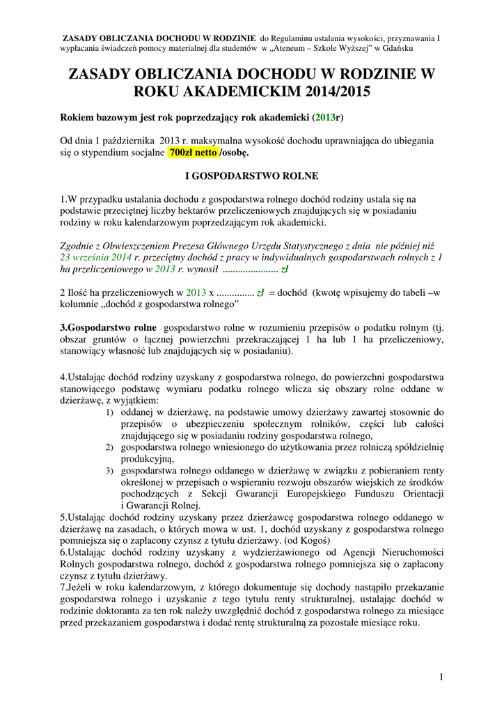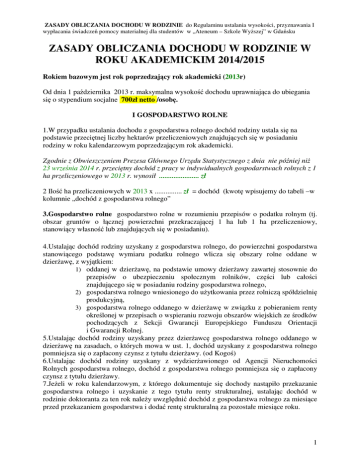 ZASADY OBLICZANIA DOCHODU W RODZINIE do Regulaminu ustalania wysokości, przyznawania I wypłacania świadczeń pomocy materialnej dla studentów w „Ateneum – Szkole Wyższej” w Gdańsku ZASADY OBLICZANIA DOCHODU W RODZINIE W ROKU AKADEMICKIM 2014/2015 Rokiem bazowym jest rok poprzedzający rok akademicki (2013r) Od dnia 1 października 2013 r. maksymalna wysokość dochodu uprawniająca do ubiegania się o stypendium socjalne 700zł netto /osobę. I GOSPODARSTWO ROLNE 1.W przypadku ustalania dochodu z gospodarstwa rolnego dochód rodziny ustala się na podstawie przeciętnej liczby hektarów przeliczeniowych znajdujących się w posiadaniu rodziny w roku kalendarzowym poprzedzającym rok akademicki. Zgodnie z Obwieszczeniem Prezesa Głównego Urzędu Statystycznego z dnia nie później niż 23 września 2014 r. przeciętny dochód z pracy w indywidualnych gospodarstwach rolnych z 1 ha przeliczeniowego w 2013 r. wynosił ...................... zł 2 Ilość ha przeliczeniowych w 2013 x ............... zł = dochód (kwotę wpisujemy do tabeli –w kolumnie „dochód z gospodarstwa rolnego” 3.Gospodarstwo rolne gospodarstwo rolne w rozumieniu przepisów o podatku rolnym (tj. obszar gruntów o łącznej powierzchni przekraczającej 1 ha lub 1 ha przeliczeniowy, stanowiący własność lub znajdujących się w posiadaniu). 4.Ustalając dochód rodziny uzyskany z gospodarstwa rolnego, do powierzchni gospodarstwa stanowiącego podstawę wymiaru podatku rolnego wlicza się obszary rolne oddane w dzierżawę, z wyjątkiem: 1) oddanej w dzierżawę, na podstawie umowy dzierżawy zawartej stosownie do przepisów o ubezpieczeniu społecznym rolników, części lub całości znajdującego się w posiadaniu rodziny gospodarstwa rolnego, 2) gospodarstwa rolnego wniesionego do użytkowania przez rolniczą spółdzielnię produkcyjną, 3) gospodarstwa rolnego oddanego w dzierżawę w związku z pobieraniem renty określonej w przepisach o wspieraniu rozwoju obszarów wiejskich ze środków pochodzących z Sekcji Gwarancji Europejskiego Funduszu Orientacji i Gwarancji Rolnej. 5.Ustalając dochód rodziny uzyskany przez dzierżawcę gospodarstwa rolnego oddanego w dzierżawę na zasadach, o których mowa w ust. 1, dochód uzyskany z gospodarstwa rolnego pomniejsza się o zapłacony czynsz z tytułu dzierżawy. (od Kogoś) 6.Ustalając dochód rodziny uzyskany z wydzierżawionego od Agencji Nieruchomości Rolnych gospodarstwa rolnego, dochód z gospodarstwa rolnego pomniejsza się o zapłacony czynsz z tytułu dzierżawy. 7.Jeżeli w roku kalendarzowym, z którego dokumentuje się dochody nastąpiło przekazanie gospodarstwa rolnego i uzyskanie z tego tytułu renty strukturalnej, ustalając dochód w rodzinie doktoranta za ten rok należy uwzględnić dochód z gospodarstwa rolnego za miesiące przed przekazaniem gospodarstwa i dodać rentę strukturalną za pozostałe miesiące roku. 1 ZASADY OBLICZANIA DOCHODU W RODZINIE do Regulaminu ustalania wysokości, przyznawania I wypłacania świadczeń pomocy materialnej dla studentów w „Ateneum – Szkole Wyższej” w Gdańsku II OBLICZANIE DOCHODU NETTO DOCHÓD RODZINY - suma dochodów osiągniętych w roku kalendarzowym poprzedzającym okres zasiłkowy (2013r.) podzielona przez liczbę miesięcy, w których dochód ten był osiągany. Dochód członka rodziny – oznacza przeciętny miesięczny dochód członka rodziny osiągnięty w roku kalendarzowym poprzedzającym okres zasiłkowy. Dochód to po odliczeniu kwot alimentów świadczonych na rzecz innych osób : A)Przychody podlegające opodatkowaniu na zasadach określonych w art.27,30b,30c i 30e ustawy z dnia 26 lipca 1991r. o podatku dochodowym od osób fizycznych (Dz.u. z 2010r. Nr 51,poz.307 z późn. zm.), pomniejszone o -koszty uzyskania przychodu -należny podatek dochodowy od osób fizycznych -składki na ubezpieczenie społeczne -składki na ubezpieczenie zdrowotne B)deklarowany w oświadczeniu dochód z działalności podlegającej opodatkowaniu na podstawie przepisów o zryczałtowanym podatku dochodowym od niektórych przychodów osiąganych przez osoby fizyczne, pomniejszony o należny zryczałtowany podatek dochodowy i składki na ubezpieczenie społeczne i zdrowotne. C) inne dochody niepodlegające opodatkowaniu na podstawie przepisów o podatku dochodowym od osób fizycznych (pouczenie we wniosku) III. ZMIANA W DOCHODACH 1. W przypadku utraty dochodu w 2013 roku lub po tym roku nie uwzględnia się dochodu utraconego. (przyjmujemy, że wynosi zero) Przez dochód utracony rozumie się: − uzyskanie prawa do urlopu wychowawczego; − utratę prawa do zasiłku dla bezrobotnych lub stypendium dla bezrobotnych; − utratę zatrudnienia lub innej pracy zarobkowej (nie dotyczy: dzieło); umowy o − utratę zasiłku przedemerytalnego lub świadczenia przedemerytalnego, nauczycielskiego świadczenia kompensacyjnego, emerytury lub renty z wyjątkiem rent przyznawanych rolnikom w związku z przekazaniem lub dzierżawą gospodarstwa rolnego, utratą zasiłku przedemerytalnego lub świadectwa przedemerytalnego; − wyrejestrowaniem pozarolniczej działalności gospodarczej lub zawieszenie jej wykonywania. - utratę zasiłku chorobowego, świadczenia rehabilitacyjnego lub zasiłku macierzyńskiego, przysługujących po utracie zatrudnienia lub innej pracy zarobkowej; - utratę zasądzonych świadczeń alimentacyjnych w związku ze śmiercią osoby zobowiązanej do tych świadczeń 2 ZASADY OBLICZANIA DOCHODU W RODZINIE do Regulaminu ustalania wysokości, przyznawania I wypłacania świadczeń pomocy materialnej dla studentów w „Ateneum – Szkole Wyższej” w Gdańsku 2. W przypadku uzyskania dochodu w 2013r. dochód dzieli się przez liczbę miesięcy, w którym ten dochód został osiągnięty, jeżeli dochód ten uzyskiwany jest w dniu przyznawania stypendium. w związku z: − zakończeniem urlopu wychowawczego, − uzyskaniem prawa do zasiłku dla bezrobotnych lub stypendium dla b