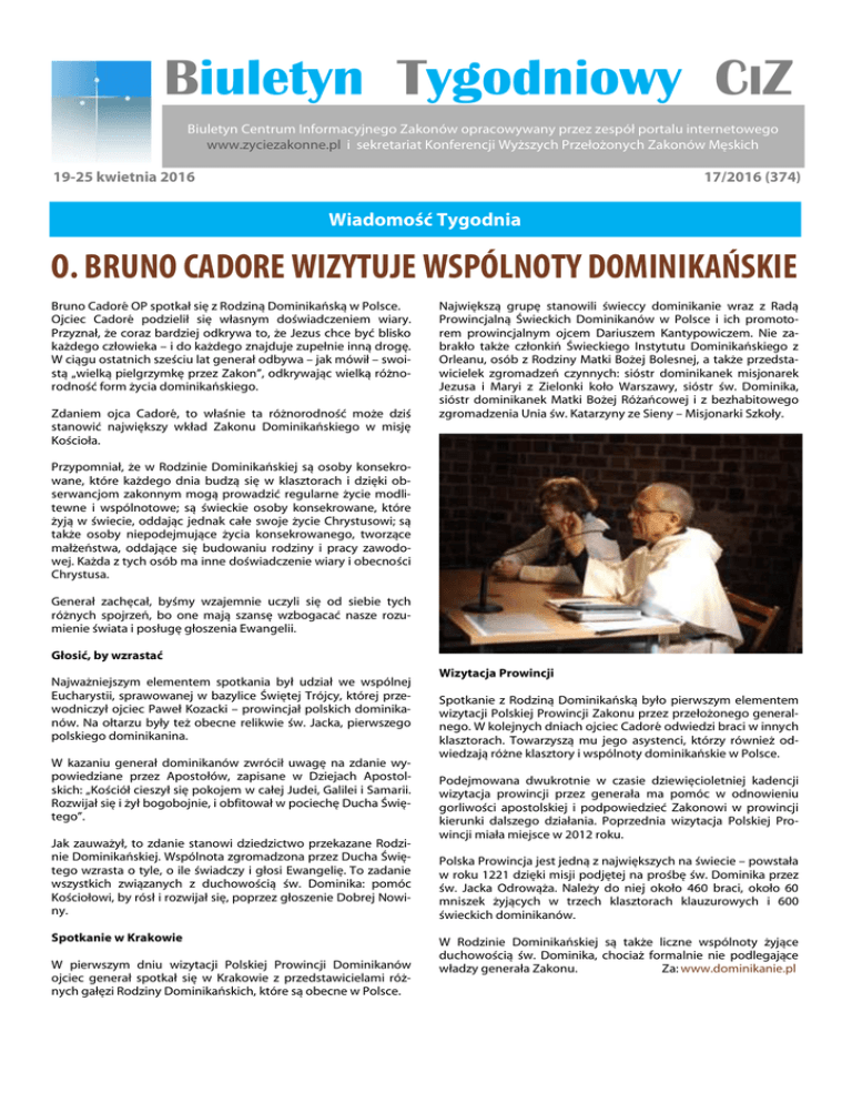 Biuletyn Tygodniowy CIZ Biuletyn Centrum Informacyjnego Zakonów opracowywany przez zespół portalu internetowego www.zyciezakonne.pl i sekretariat Konferencji Wyższych Przełożonych Zakonów Męskich 19-25 kwietnia 2016 17/2016 (374) Wiadomość Tygodnia O. BRUNO CADORE WIZYTUJE WSPÓLNOTY DOMINIKAŃSKIE Bruno Cadoré OP spotkał się z Rodziną Dominikańską w Polsce. Ojciec Cadoré podzielił się własnym doświadczeniem wiary. Przyznał, że coraz bardziej odkrywa to, że Jezus chce być blisko każdego człowieka – i do każdego znajduje zupełnie inną drogę. W ciągu ostatnich sześciu lat generał odbywa – jak mówił – swoistą „wielką pielgrzymkę przez Zakon”, odkrywając wielką różnorodność form życia dominikańskiego. Zdaniem ojca Cadoré, to właśnie ta różnorodność może dziś stanowić największy wkład Zakonu Dominikańskiego w misję Kościoła. Największą grupę stanowili świeccy dominikanie wraz z Radą Prowincjalną Świeckich Dominikanów w Polsce i ich promotorem prowincjalnym ojcem Dariuszem Kantypowiczem. Nie zabrakło także członkiń Świeckiego Instytutu Dominikańskiego z Orleanu, osób z Rodziny Matki Bożej Bolesnej, a także przedstawicielek zgromadzeń czynnych: sióstr dominikanek misjonarek Jezusa i Maryi z Zielonki koło Warszawy, sióstr św. Dominika, sióstr dominikanek Matki Bożej Różańcowej i z bezhabitowego zgromadzenia Unia św. Katarzyny ze Sieny – Misjonarki Szkoły. Przypomniał, że w Rodzinie Dominikańskiej są osoby konsekrowane, które każdego dnia budzą się w klasztorach i dzięki obserwancjom zakonnym mogą prowadzić regularne życie modlitewne i wspólnotowe; są świeckie osoby konsekrowane, które żyją w świecie, oddając jednak całe swoje życie Chrystusowi; są także osoby niepodejmujące życia konsekrowanego, tworzące małżeństwa, oddające się budowaniu rodziny i pracy zawodowej. Każda z tych osób ma inne doświadczenie wiary i obecności Chrystusa. Generał zachęcał, byśmy wzajemnie uczyli się od siebie tych różnych spojrzeń, bo one mają szansę wzbogacać nasze rozumienie świata i posługę głoszenia Ewangelii. Głosić, by wzrastać Najważniejszym elementem spotkania był udział we wspólnej Eucharystii, sprawowanej w bazylice Świętej Trójcy, której przewodniczył ojciec Paweł Kozacki – prowincjał polskich dominikanów. Na ołtarzu były też obecne relikwie św. Jacka, pierwszego polskiego dominikanina. W kazaniu generał dominikanów zwrócił uwagę na zdanie wypowiedziane przez Apostołów, zapisane w Dziejach Apostolskich: „Kościół cieszył się pokojem w całej Judei, Galilei i Samarii. Rozwijał się i żył bogobojnie, i obfitował w pociechę Ducha Świętego”. Jak zauważył, to zdanie stanowi dziedzictwo przekazane Rodzinie Dominikańskiej. Wspólnota zgromadzona przez Ducha Świętego wzrasta o tyle, o ile świadczy i głosi Ewangelię. To zadanie wszystkich związanych z duchowością św. Dominika: pomóc Kościołowi, by rósł i rozwijał się, poprzez głoszenie Dobrej Nowiny. Spotkanie w Krakowie W pierwszym dniu wizytacji Polskiej Prowincji Dominikanów ojciec generał spotkał się w Krakowie z przedstawicielami różnych gałęzi Rodziny Dominikańskich, które są obecne w Polsce. Wizytacja Prowincji Spotkanie z Rodziną Dominikańską było pierwszym elementem wizytacji Polskiej Prowincji Zakonu przez przełożonego generalnego. W kolejnych dniach ojciec Cadoré odwiedzi braci w innych klasztorach. Towarzyszą mu jego asystenci, którzy również odwiedzają różne klasztory i wspólnoty dominikańskie w Polsce. Podejmowana dwukrotnie w czasie dziewięcioletniej kadencji wizytacja prowincji przez generała ma pomóc w odnowieniu gorliwości apostolskiej i podpowiedzieć Zakonowi w prowincji kierunki dalszego działania. Poprzednia wizytacja Polskiej Prowincji miała miejsce w 2012 roku. Polska Prowincja jest jedną z największych na świecie – powstała w roku 1221 dzięki misji podjętej na prośbę św. Dominika przez św. Jacka Odrowąża. Należy do niej około 460 braci, około 60 mniszek żyjących w trzech klasztorach klauzurowych i 600 świeckich dominikanów. W Rodzinie Dominikańskiej są także liczne wspólnoty żyjące duchowością św. Dominika, chociaż formalnie nie podlegające władzy generała Zakonu. Za: www.dominikanie.pl 19-25 kwietnia 2016 Biuletyn Tygodniowy CiZ 17/2016 (374) ______________________________________________________________________________________________ Wiadomości Krajowe NOWY PRZEŁOŻONY GENERALNY MICHALITÓW Miejscu Piastowym. Po zdaniu matury wstąpił do nowicjatu Zgromadzenia św. Michała Archanioła. W roku 1988 rozpoczął studia filozoficzno-teologiczne w Instytucie Teologicznym Księży Misjonarzy w Krakowie. XXI Kapituła Generalna Michalitów, obradująca w domu generalnym w Markach k/Warszawy, w dniu 25 kwietnia br. dokonała wyboru nowego Przełożonego Generalnego. Został nim ks. Dariusz Wilk. W 1994 roku przyjął święcenia kapłańskie. Pracował jako wychowawca w Niższym Seminarium w Miejscu Piastowym, był duszpasterzem w Niemczech i wychowawcą w Domu Dziecka w Prałkowcach. Od 2001 roku pełnił obowiązki dyrektora Katolickiego Gimnazjum i Liceum w Krośnie. Był ekspertem z Listy Ministerstwa Edukacji Narodowej. Prowadził audycje w archidiecezjalnym radio „Fara”. Od kilku lat z jego inicjatywy w Krośnie organizowany jest Orszak Trzech Króli. Nowo wybrany Ojciec Generał urodził się 21 czerwca 1967 roku. Pochodzi z parafii Oprócz umiłowania pracy z młodzieżą, pasjonuje się fotografią, sportem i poezją. pw. Wszystkich Świętych we Wrocance k/Krosna. Po ukończeniu szkoły podstaZa: www.michalici.pl wowej w rodzinnej miejscowości, wstąpił do Niższego Seminarium Duchownego w ____________________________________________________________________________________________________________________ Po przedstawieniu stanu prowincji, czwarteg