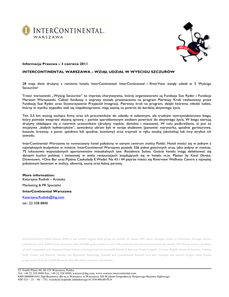 Informacja Prasowa – 3 czerwca 2011 INTERCONTINENTAL WARSZAWA – WZIĄŁ UDZIAŁ W WYŚCIGU SZCZURÓW 28 maja dwie druŜyny z ramienia hotelu InterContinental: InterContinental i RiverView wzięły udział w 3 Wyścigu Szczurów! Trzeci warszawski „Wyścig Szczurów” to impreza charytatywna, której organizatorami są Fundacja Sue Ryder i Fundacja Maraton Warszawski. Całość funduszy z imprezy została przeznaczona na program Pierwszy Krok realizowany przez Fundację Sue Ryder oraz Stowarzyszenie Przyjaciół Integracji. Pierwszy krok to program, dzięki któremu młodzi ludzie, którzy w wyniku wypadku stali się niepełnosprawni, mają szansę na powrót do bardziej aktywnego Ŝycia. Ten 3,5 km wyścig zachęca firmy oraz ich pracowników do udziału w zabawnym, ale trudnym wytrzymałościowo biegu, który pomoŜe wesprzeć słuszną sprawę – pomóc sparaliŜowanym osobom powrócić do aktywnego Ŝycia. W biegu startują druŜyny składające się z czterech uczestników (druŜyny męskie, damskie i mieszane). W celu podkreślenia, iŜ jest to inicjatywa „białych kołnierzyków”, zawodnicy ubrani byli w stroje słuŜbowe (panowie: marynarka, spodnie garniturowe, koszule, krawaty, a panie: spódnice lub spodnie, kostiumy) oraz trzymali w ręku teczkę (aktówkę) lub inny atrybut ich zawodu. InterContinental Warszawa to nowoczesny hotel połoŜony w samym centrum stolicy Polski. Hotel mieści się w jednym z największych budynków w mieście. InterContinental Warszawa posiada 326 pokoi gościnnych oraz, jako jedyny w mieście, 75 luksusowo wyposaŜonych apartamentów mieszkalnych tzw. Residence Suites. Goście hotelu mogą delektować się daniami kuchni polskiej i światowej w wielu restauracjach znajdujących się w hotelu m.in. Platter by Karol Okrasa, Downtown, +One Bar oraz Pijalnia Czekolady E.Wedel. Na 43 i 44 piętrze mieści się Riverview Wellness Centre z najwyŜej połoŜonym basenem w stolicy, siłownią, sauną oraz łaźnią parową. More information: Katarzyna Rudnik – Krzeska Marketing & PR Specialist InterContinental Warszawa [email protected] tel.: 22 328 8840 InterContinental Hotels Group (IHG) is the world’s largest hotel group by number of rooms. IHG owns, manages, leases or franchises, through various subsidiaries, over 4,400 hotels and more than 645,000 guest rooms in over 100 countries and territories around the world. The Group owns a portfolio of well recognised and respected hotel brands including InterContinental® Hotels & Resorts, Hotel Indigo®, Crowne Plaza® Hotels & Resorts, Holiday Inn® Hotels and Resorts, Holiday Inn Express®, Staybridge Suites® and Candlewood Suites®, and also manages the world’s largest hotel loyalty programme, Priority Club® Rewards with 48 million members worldwide. Ul. Emilii Plater 49, 00-125 Warszawa, Polska Tel: +48 22 328 8888 Fax: +48 22 328 8889, [email protected], www.warsaw.intercontiental.com KRS 0000001843, Sąd Rejonowy dla m.st Warszawy w Warszawie XII Wydział Gospodarczy Krajowego Rejestru Sądowego NIP 525 – 21 – 86 – 751, wysokość kapitału zakładowego 81.930.000,00 PLN IHG has nearly 1,400 hotels in its development pipeline, which will create 160,000 jobs worldwide over the next few years. InterContinental Hotels Group PLC is the Group’s holding company and is incorporated in Great Britain and registered in England and Wales. Ul. Emilii Plater 49, 00-125 Warszawa, Polska Tel: +48 22 328 8888 Fax: +48 22 328 8889, [email protected], www.warsaw.intercontiental.com KRS 0000001843, Sąd Rejonowy dla m.st Warszawy w Warszawie XII Wydział Gospodarczy Krajowego Rejestru Sądowego NIP 525 – 21 – 86 – 751, wysokość kapitału zakładowego 81.930.000,00 PLN