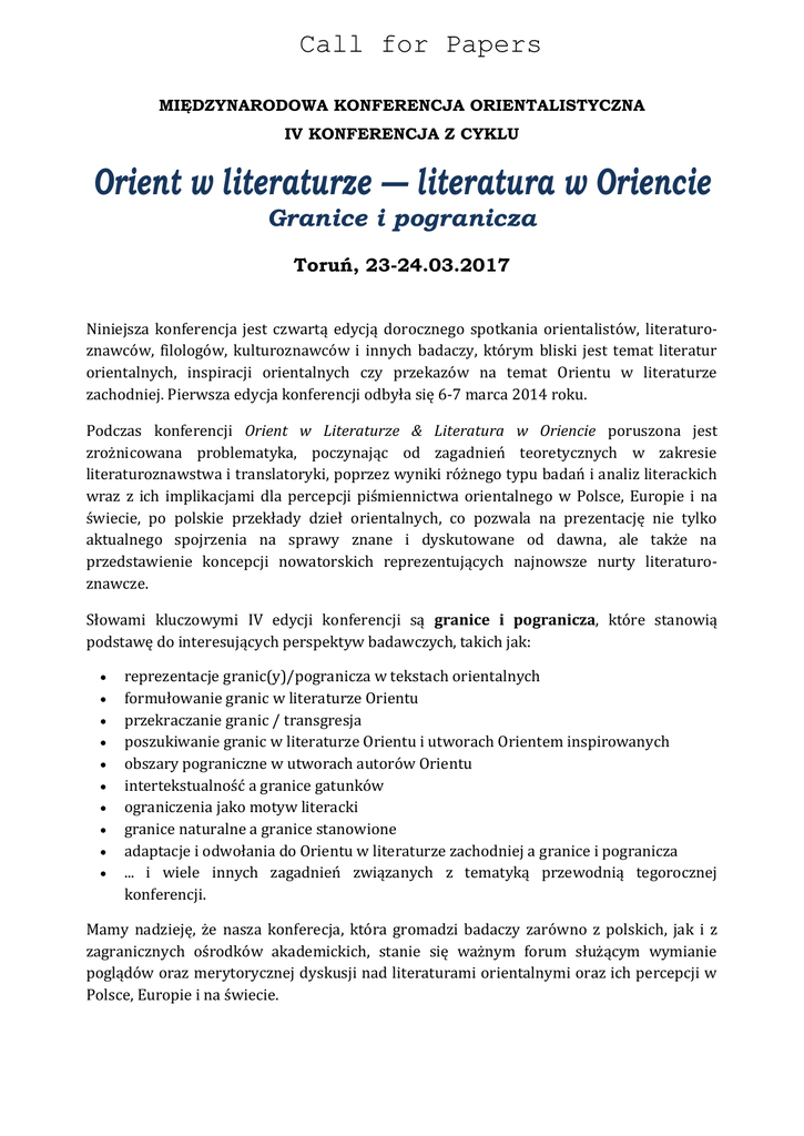 Call for Papers MIĘDZYNARODOWA KONFERENCJA ORIENTALISTYCZNA IV KONFERENCJA Z CYKLU Orient w literaturze — literatura w Oriencie Granice i pogranicza Toruń, 23-24.03.2017 Niniejsza konferencja jest czwartą edycją dorocznego spotkania orientalistów, literaturoznawców, filologów, kulturoznawców i innych badaczy, którym bliski jest temat literatur orientalnych, inspiracji orientalnych czy przekazów na temat Orientu w literaturze zachodniej. Pierwsza edycja konferencji odbyła się 6-7 marca 2014 roku. Podczas konferencji Orient w Literaturze & Literatura w Oriencie poruszona jest zrożnicowana problematyka, poczynając od zagadnień teoretycznych w zakresie literaturoznawstwa i translatoryki, poprzez wyniki różnego typu badań i analiz literackich wraz z ich implikacjami dla percepcji piśmiennictwa orientalnego w Polsce, Europie i na świecie, po polskie przekłady dzieł orientalnych, co pozwala na prezentację nie tylko aktualnego spojrzenia na sprawy znane i dyskutowane od dawna, ale także na przedstawienie koncepcji nowatorskich reprezentujących najnowsze nurty literaturoznawcze. Słowami kluczowymi IV edycji konferencji są granice i pogranicza, które stanowią podstawę do interesujących perspektyw badawczych, takich jak: reprezentacje granic(y)/pogranicza w tekstach orientalnych formułowanie granic w literaturze Orientu przekraczanie granic / transgresja poszukiwanie granic w literaturze Orientu i utworach Orientem inspirowanych obszary pograniczne w utworach autorów Orientu intertekstualność a granice gatunków ograniczenia jako motyw literacki granice naturalne a granice stanowione adaptacje i odwołania do Orientu w literaturze zachodniej a granice i pogranicza ... i wiele innych zagadnień związanych z tematyką przewodnią tegorocznej konferencji. Mamy nadzieję, że nasza konferecja, która gromadzi badaczy zarówno z polskich, jak i z zagranicznych ośrodków akademickich, stanie się ważnym forum służącym wymianie poglądów oraz merytorycznej dyskusji nad literaturami orientalnymi oraz ich percepcji w Polsce, Europie i na świecie. Call for Papers TERMIN I MIEJSCE KONFERENCJI 23-24 marca 2017 r. Collegium Maius, Uniwersytet Mikołaja Kopernika ul. Fosa Staromiejska 3, 87-100 Toruń ORGANIZATRORZY 1. Uniwersytet Mikołaja Kopernika, Wydział Filologiczny, Centrum Języka i Kultury Chińskiej, Pracownia Języka i Kultury Arabskiej, Zakład Japonistyki 2. Polskie Towarzystwo Orientalistyczne 3. Uniwersytet Anhui w Hefei KOMITET NAUKOWY dr Adam Bednarczyk dr Abdelhak Belabed dr Magdalena Kubarek mgr Maciej Szatkowski e-mail: [email protected] e-mail: [email protected] e-mail: [email protected] e-mail: [email protected] SEKRETARZ KONFERENCJI mgr Anna Grądzka e-mail: [email protected] TERMINY Zgłaszanie propozycji referatów i paneli: 1 listopada 2016 r. Informacja o przyjęciu referatu: 15 listopada 2016 r. Wnoszenie opłaty konferencyjnej: 30 listopada 2016 r. Wstępny program konferencji: 20 stycznia 2017 r. Przesłanie wersji ostatecznej programu: 31 stycznia 2017 r. Konferencja: 23-24 marca 2017 r. Nadsyłanie tekstu do publikacji: do 30 kwietnia 2017 r. ZGŁOSZENIA Zgłoszenia propozycji referatu i/lub panelu wraz z abstraktem, afiliacją i adresem należy obowiązkowo dokonywać za pomocą g otowego formularza, dostępnego na stronie konferencji pod adresem: https://ollo2017.wordpress.com/2016/07/13/zgloszenia/ Osoby planujące wystąpienie w języku polskim są zobligowane do podania tytułu oraz abstraktu również w języku angielskim. Zgłoszenia przesłane w innej formie nie będą brane pod uwagę! OPŁATA KONFERENCYJNA Koszt wpisowego i uczestnictwa w konferencji wynosi: Dla uczestników z Polski: 300 PLN Dla uczestników z zagranicy: 75 € Opłata konferencyjna obejmuje: udział w uroczystej kolacji (czwartek) obiad poczęstunek w trakcie przerw materiały konferencyjne pokrycie kosztów publikacji w recenzowanym tomie pokonferencyjnym wycieczka z przewodnikiem po Toruniu Call for Papers Organizatorzy nie zapewniają noclegu i nie zwracają kosztów dojazdu. Chętnie udzielą jednak dodatkowych informacji zainteresowanym osobom. JĘZYKI KONFERENCJI polski, angielski (organizatorzy zastrzegają sobie prawo zorganiowania panelu również w innym języku, niż podany wyżej) KONTAKT Zakład Japonistyki / Pracownia Języka i Kultury Arabskiej / Centrum Języka i Kutury Chińskiej Uniwersytet Mikołaja Kopernika ul. W. Bojarskiego 1 87-100 Toruń, Polska +48 (56) 611-36-93 DODATKOWE INFORMACJE https://ollo2017.wordpress.com/