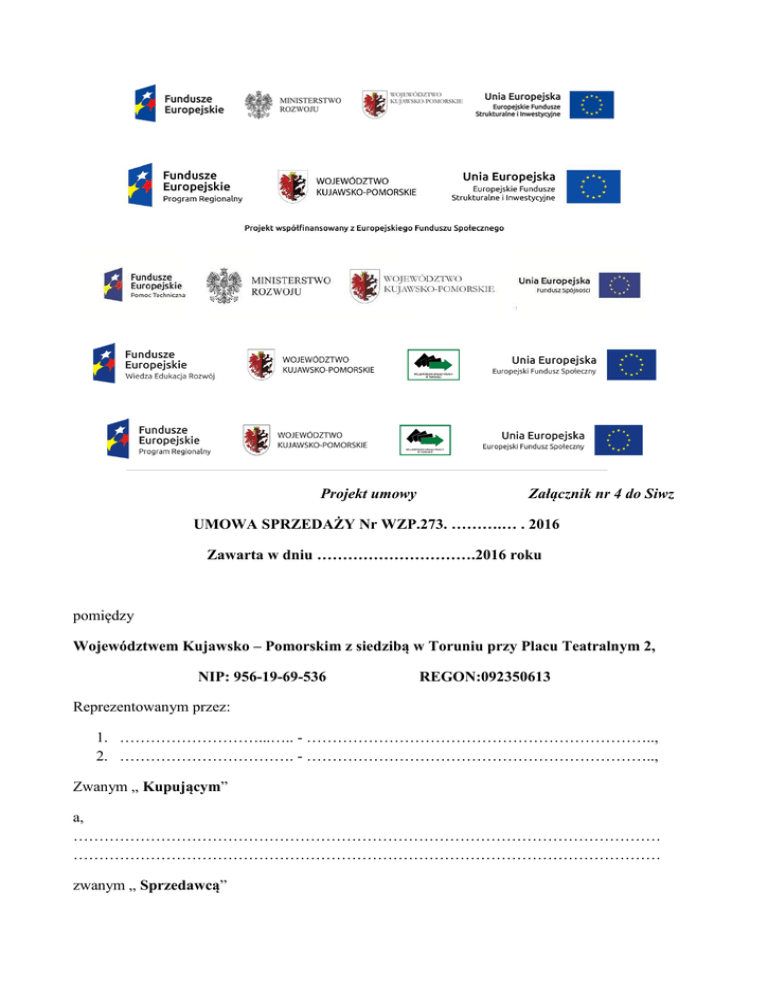 Projekt umowy Załącznik nr 4 do Siwz UMOWA SPRZEDAŻY Nr WZP.273. ……….… . 2016 Zawarta w dniu ………………………….2016 roku pomiędzy Województwem Kujawsko – Pomorskim z siedzibą w Toruniu przy Placu Teatralnym 2, NIP: 956-19-69-536 REGON:092350613 Reprezentowanym przez: 1. ………………………...….. - ………………………………………………………….., 2. ……………………………. - ………………………………………………………….., Zwanym „ Kupującym” a, …………………………………………………………………………………………………… …………………………………………………………………………………………………… zwanym „ Sprzedawcą” §1 1. Przedmiotem umowy jest zakup materiałów eksploatacyjnych do urządzeń drukujących na 2016 rok na potrzeby Urzędu Marszałkowskiego Województwa Kujawsko-Pomorskiego oraz jego wojewódzkich jednostek organizacyjnych wymienionych w załączniku nr 1 do niniejszej umowy zgodnie z zamówieniem publicznym przeprowadzonym przez Kupującego w trybie przetargu nieograniczonego, zwanych dalej przedmiotem umowy. 2. Sprzedawca, zgodnie z deklaracją wyrażoną w formularzu ofertowym, zobowiązuje się do odbioru zużytych w toku eksploatacji przez Kupującego bądź jego wojewódzkie jednostki organizacyjne wymienione w załączniku nr 1 do niniejszej umowy tonerów oraz pojemników po tuszu zgodnie z zasadami określonymi w ustawie z dnia 14 grudnia 2012 r. o odpadach (Dz. U. z 2013 r., poz. 21 z późn. zm.). 1 3. Sprzedawca przekaże Kupującemu bądź jego wojewódzkim jednostkom organizacyjnym wymienionym w załączniku nr 1 do niniejszej umowy protokół przyjęcia zużytych materiałów eksploatacyjnych oraz protokół przekazania odpadów do utylizacji. Wszelkie koszty związane z odbiorem i utylizacją zużytych materiałów eksploatacyjnych obciążają Sprzedawcę.2 4. Odbiór zużytych materiałów eksploatacyjnych odbywać się będzie u Kupującego bądź jego wojewódzkich jednostek organizacyjnych wymienionych w załączniku nr 1 do niniejszej umowy w dniu dostawy lub po wcześniejszym zgłoszeniu zlecenia odbioru zużytych materiałów eksploatacyjnych (nie później jednak niż 7 dni kalendarzowych od dnia zgłoszenia e-mailem bądź faksem). Odbiór zużytych materiałów eksploatacyjnych odbywać się będzie od dnia zawarcia umowy do 30.06.2017 r. 3 5. Kupujący bądź jego wojewódzkie jednostki organizacyjne wymienione z załączniku nr 1 niniejszej umowy zastrzegają sobie prawo do zmniejszenia lub zwiększenia ilości przedmiotu umowy w poszczególnych pozycjach formularza cenowego, stanowiącego załącznik nr 2 do niniejszej umowy, stosownie do swoich potrzeb. 6. Kupujący zastrzega sobie możliwość zmniejszenia ilości przedmiotu umowy, o którym mowa w ust. 1 w przypadku zmiany swoich potrzeb w wysokości nie wyższej niż 30% wartości przedmiotu umowy. 7. Zmiany, o których mowa w ust. 5 i 6 nie wymagają zmiany umowy. 8. Szczegółowe zestawienie przedmiotu umowy i obowiązujące ceny jednostkowe określone są w formularzu cenowym złożonym wraz z ofertą Sprzedawcy, stanowiący załącznik nr 2 do umowy. 9. Strony umowy pod pojęciem: 1) „materiał fabrycznie nowy” rozumieją materiały eksploatacyjne wykonane z nowych elementów, wcześniej nie używane, nie pochodzące z recyclingu, bez elementów regenerowanych lub pochodzących z demontażu, bez śladów uszkodzenia, w oryginalnych opakowaniach producenta z widocznym logo i nazwą, symbolem produktu i terminem przydatności do użytku nie krótszym niż 12 miesięcy od daty dostawy, nr katalogowy lub listę modeli urządzeń, do których dany materiał jest przeznaczony, posiadające wszelkie zabezpieczenia szczelności zbiorników z tonerem/tuszem lub refabrykowane, wyprodukowane częściowo 1,2,3 Dotyczy sytuacji, gdy Sprzedawca zadeklarował odbiór zużytych materiałów eksploatacyjnych w formularzu ofertowym 2 2) 3) 4) 5) z elementów fabrycznie nowych oraz elementów pochodzących z tonerów zużytych ( z odzysku) – tzw. rekondycyjne; „oryginalne materiały eksploatacyjne” uznają takie materiały eksploatacyjne, które są wyprodukowane pod marką i z logo producenta urządzenia, w którym są stosowane i za które producent przejmuje obowiązki gwarancyjne; „zalecane przez producenta danego urządzenia” rozumieją materiały eksploatacyjne, które producent wymieni na swojej stronie internetowej przy opisie urządzenia (drukarki itp.) bądź w instrukcji obsługi urządzenia; „materiał równoważny” należy rozumieć produkt: a) fabrycznie nowy, nie regenerowany, pochodzący z bieżącej produkcji, wytworzony seryjnie w cyklu produkcyjnym zgodnym z normą ISO 9001 oraz ISO 14001 lub normami, b) opakowany hermetycznie, nie noszący śladów uszkodzeń zewnętrznych oraz używania, c) którego wydajność jest zgodna z normą ISO/IEC 19752 dla kaset z tonerem do drukarek monochromatycznych, z normą ISO/IEC 19798 dla kaset z tonerem do kolorowych drukarek laserowych oraz z normą ISO/IEC 24711 dla wkładów drukujących, jest co najmniej taka jak materiału oryginalnego zalecanego przez producentów drukarek, d) który zapewnia jakość wydruku co najmniej taką, jak materiał oryginalny, zalecany przez producenta sprzętu, e) który nie ogranicza pełnej współpracy z programem sprzętu, monitorującym stan zasobników z tuszem i tonerem, f) który w żadnym stopniu nie narusza praw patentowych, g) w którym wszystkie części są nowe lub z elementów pochodzących z tonerów zużytych (z odzysku) – tzw. rekondycyjne - w szczególności bęben światłoczuły, listwa podająca, listwa zbierająca, wałek magnetyczny, h) w którym zastosowano toner/tusz dopasowany do pracy z danym urządzeniem; wadliwy materiał eksploatacyjny uznaje się w szczególności: a) wysypany lub wysypuj