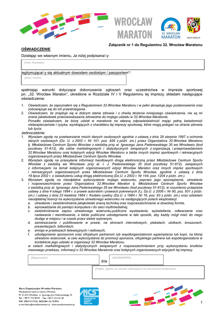 Załącznik nr 1 do Regulaminu 32. Wrocław Maratonu OŚWIADCZENIE Działając we własnym imieniu, Ja niżej podpisana/-y: (Imię i Nazwisko) legitymująca/-y się aktualnym dowodem osobistym / paszportem*: (seria i numer) spełniając warunki dotyczące dokonywania zgłoszeń oraz uczestnictwa w imprezie sportowej pn. „32. Wrocław Maraton”, określone w Rozdziale IV i V Regulaminu tej imprezy, składam następujące oświadczenia: 1. 2. Oświadczam, że zapoznałem się z Regulaminem 32.Wrocław Maratonu i w pełni akceptuje jego postanowienia oraz zobowiązuje się do ich przestrzegania. Oświadczam, że znajduje się w dobrym stanie zdrowia i z chwilą złożenia niniejszego oświadczenia, nie są mi znane jakiekolwiek przeciwwskazania zdrowotne do mojego udziału w 32.Wrocław Maratonie. Ponadto oświadczam, że biorę udział w maratonie na własną odpowiedzialność mając pełną świadomość niebezpieczeństw i ryzyka, wynikających z charakteru tej imprezy sportowej, które mogą polegać na utracie zdrowia lub życia. Jednocześnie: 1. 2. 3. Wyrażam zgodę na przetwarzanie moich danych osobowych zgodnie z ustawą z dnia 29 sierpnia 1997 o ochronie danych osobowych (Dz. U. z 2002 r. Nr 101, poz. 926 z późń. zm.) przez Organizatora 32.Wrocław Maratonu tj. Młodzieżowe Centrum Sportu Wroclaw z siedzibą przy al. Ignacego Jana Paderewskiego 35 we Wrocławiu (kod pocztowy 51-612), dla celów marketingowych i statystycznych związanych z organizacją i przeprowadzeniem 32.Wrocław Maratonu oraz kolejnych edycji Wrocław Maratonu a także innych imprez sportowych i rekreacyjnych organizowanych przez Młodzieżowe Centrum Sportu Wrocław. Wyrażam zgodę na przesyłanie informacji handlowych drogą elektroniczną przez Młodzieżowe Centrum Sportu Wrocław z siedzibą we Wrocławiu przy al. I. J. Paderewskiego 35 (kod pocztowy 51-612), związanych z informacjami na temat kolejnych organizowanych edycji Wrocław Maraton oraz innych imprez sportowych i rekreacyjnych organizowanych przez Młodzieżowe Centrum Sportu Wrocław, zgodnie z ustawą z dnia 18 lipca 2002 r. o świadczeniu usług drogą elektroniczną (Dz.U. z 2002 r. Nr 144, poz. 1204 z późn. zm.). Wyrażam zgodę na nieodpłatne wykorzystanie mojego wizerunku, poprzez jego sporządzenie, utrwalanie i rozpowszechnianie przez Organizatora 32.Wrocław Maraton tj. Młodzieżowe Centrum Sportu Wrocław z siedzibą przy al. Ignacego Jana Paderewskiego 35 we Wrocławiu (kod pocztowy 51-612), w rozumieniu przepisów ustawy z dnia 4 lutego 1994 r. o prawie autorskim i prawach pokrewnych (t.j. Dz.U. z 2006 r. Nr 90, poz. 931 z późn. zm.) i ustawy z dnia 23 kwietnia 1964 r. Kodeks cywilny (Dz.U. z 1964 r. Nr 16, poz. 93 z późn. zm.) oraz udzielam nieodpłatnej licencji na wykorzystanie utrwalonego wizerunku na następujących polach eksploatacji: a. utrwalanie i zwielokrotnianie jakąkolwiek znaną techniką oraz rozpowszechnianie w dowolnej formie, b. wprowadzanie do pamięci komputera i do sieci multimedialnej, c. zwielokrotnianie zapisu utrwalonego wizerunku,publiczne wystawianie, wyświetlanie, odtwarzanie oraz nadawanie i reemitowanie, a także publiczne udostępnianie w taki sposób, aby każdy mógł mieć do niego dostęp w miejscu i w czasie przez siebie wybranym, d. zamieszczanie i publikowanie w prasie, na stronach internetowych, plakatach, ulotkach, broszurach, prezentacjach, bilbordach, e. emisja w przekazach telewizyjnych i radiowych, f. udostępnianie sponsorom oraz oficjalnym partnerom lub współorganizatorom egzemplarza lub kopii, na której utrwalono wizerunek, w celu wykorzystania do promocji sponsora, oficjalnego partnera lub współorganizatora w kontekście jego udziału w organizacji 32.Wrocław Maratonu, w celach marketingowych i statystycznych związanych z rozpowszechnianiem przy wykorzystaniu środków masowego przekazu, informacji o 32.Wrocław Maratonie oraz kolejnych organizowanych edycjach tej imprezy. (Miejscowość) dnia (DD/MM/RRRR) (Podpis, zgodny ze wzorem widniejącym na dokumencie tożsamości) 1