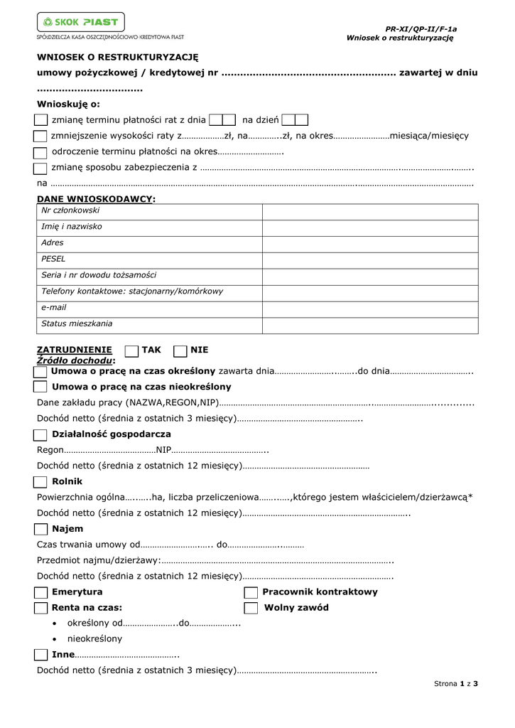 PR-XI/QP-II/F-1a Wniosek o restrukturyzację WNIOSEK O RESTRUKTURYZACJĘ umowy pożyczkowej / kredytowej nr ........................................................ zawartej w dniu .................................. Wnioskuję o: zmianę terminu płatności rat z dnia na dzień zmniejszenie wysokości raty z………………zł, na…………..zł, na okres……………………miesiąca/miesięcy odroczenie terminu płatności na okres………………………. zmianę sposobu zabezpieczenia z ………………………………………………………………………….………………….…….. na ………………………………………………………………………………………………………………….…………………………………………. DANE WNIOSKODAWCY: Nr członkowski Imię i nazwisko Adres PESEL Seria i nr dowodu tożsamości Telefony kontaktowe: stacjonarny/komórkowy e-mail Status mieszkania ZATRUDNIENIE TAK NIE Źródło dochodu: Umowa o pracę na czas określony zawarta dnia……………………..……..do dnia…………………………….. Umowa o pracę na czas nieokreślony Dane zakładu pracy (NAZWA,REGON,NIP)………………………………………………………..…………………….............. Dochód netto (średnia z ostatnich 3 miesięcy)…………………………………………….. Działalność gospodarcza Regon…………………………………NIP………………………………….. Dochód netto (średnia z ostatnich 12 miesięcy)……………………………………………… Rolnik Powierzchnia ogólna…..…..ha, liczba przeliczeniowa……..….,którego jestem właścicielem/dzierżawcą* Dochód netto (średnia z ostatnich 12 miesięcy)…………………………………………………………….. Najem Czas trwania umowy od…………………….….. do…………………..……… Przedmiot najmu/dzierżawy:…………………………………………………………………………………….. Dochód netto (średnia z ostatnich 12 miesięcy)………………………………………………………. Emerytura Pracownik kontraktowy Renta na czas: Wolny zawód określony od…………………..do………………... nieokreślony Inne…………………………………….. Dochód netto (średnia z ostatnich 3 miesięcy)………………………………………………….. Strona 1 z 3 PR-XI/QP-II/F-1a Wniosek o restrukturyzację ZOBOWIĄZANIA Nazwa instytucji Rodzaj (kredyt, pożyczka, linia, karta kredytowa, inny – jaki) Kwota zadłużenia Miesięczna rata Bieżąca sytuacja (Spłacane terminowo, nieterminowo, restrukturyzacja, ugoda, inna – jaka) Inne stałe miesięczne obciążenia Kwota obciążenia Tytuł obciążenia MAJĄTEK Rodzaj Opis (nieruchomość, samochód, (rodzaj nieruchomości – nr KW lokata, papiery wartościowe, bądź inny dokument polisa na życie, inne) potwierdzający własność/ rodzaj Obciążenia Wartość rynkowa (kwota, tytuł-zastaw, hipoteka, przewłaszczenie itp.) ruchomości np. samochód dowód rejestracyjny, itp.) Oświadczam, że pozostaje/nie pozostaje* w związku małżeńskim z…………………………………………………………………. PESEL……………………………oraz pozostaję/nie pozostaję* w ustroju małżeńskiej wspólności majątkowej. Oświadczam, że posiadam/nie posiadam* na utrzymaniu: własnych dzieci………………………………………, inne osoby……………………………… Oświadczam, że dochód jest/nie jest* obciążony z tytułu wyroków sądowych lub innych tytułów……………………… Deklarowane miesięczne koszty utrzymania w gospodarstwie…………………………………………… Oświadczam, iż zobowiązanie nie może/nie było* spłacane terminowo ze względu na: utratę pracy, zmniejszenie kwoty uzyskiwanych dochodów, inne zobowiązania finansowe, sytuację osobistą/rodzinną, zdarzenia losowe. Dodatkowy opis zaistniałych sytuacji/zdarzeń losowych: …………………………………………………………………………………………………………………………………………………………………………………. …………………………………………………………………………………………………………………………………………………………………………………. …………………………………………………………………………………………………………………………………………………………………………………. Strona 2 z 3 PR-XI/QP-II/F-1a Wniosek o restrukturyzację Jako dowód zaistnienia opisanych powyżej okoliczności załączam następujące dokumenty: …………………………………………………………………………………………………………………………………………………………………………………. …………………………………………………………………………………………………………………………………………………………………………………. W celu potwierdzenia wysokości osiąganego przeze mnie dochodu załączam następujące dokumenty:……………………………………………………………………………………………………………. Moją sytuację finansową w przyszłości poprawię przez: znalezienie zatrudnienia otwarcie/wznowienie działalności gospodarczej inne………………………………………………………………………………………………………………………………………………………. Wyrażam zgodę na przetwarzanie moich danych osobowych zawartych w niniejszym dokumencie wyłącznie dla potrzeb SKOK PIAST z siedzibą w Tychach, ul. Nowo