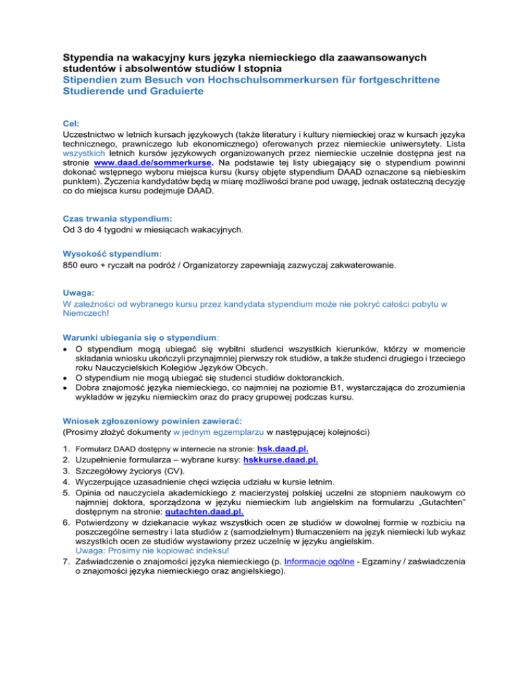 Stypendia na wakacyjny kurs języka niemieckiego dla zaawansowanych studentów i absolwentów studiów I stopnia Stipendien zum Besuch von Hochschulsommerkursen für fortgeschrittene Studierende und Graduierte Cel: Uczestnictwo w letnich kursach językowych (także literatury i kultury niemieckiej oraz w kursach języka technicznego, prawniczego lub ekonomicznego) oferowanych przez niemieckie uniwersytety. Lista wszystkich letnich kursów językowych organizowanych przez niemieckie uczelnie dostępna jest na stronie www.daad.de/sommerkurse. Na podstawie tej listy ubiegający się o stypendium powinni dokonać wstępnego wyboru miejsca kursu (kursy objęte stypendium DAAD oznaczone są niebieskim punktem). Życzenia kandydatów będą w miarę możliwości brane pod uwagę, jednak ostateczną decyzję co do miejsca kursu podejmuje DAAD. Czas trwania stypendium: Od 3 do 4 tygodni w miesiącach wakacyjnych. Wysokość stypendium: 850 euro + ryczałt na podróż / Organizatorzy zapewniają zazwyczaj zakwaterowanie. Uwaga: W zależności od wybranego kursu przez kandydata stypendium może nie pokryć całości pobytu w Niemczech! Warunki ubiegania się o stypendium: O stypendium mogą ubiegać się wybitni studenci wszystkich kierunków, którzy w momencie składania wniosku ukończyli przynajmniej pierwszy rok studiów, a także studenci drugiego i trzeciego roku Nauczycielskich Kolegiów Języków Obcych. O stypendium nie mogą ubiegać się studenci studiów doktoranckich. Dobra znajomość języka niemieckiego, co najmniej na poziomie B1, wystarczająca do zrozumienia wykładów w języku niemieckim oraz do pracy grupowej podczas kursu. Wniosek zgłoszeniowy powinien zawierać: (Prosimy złożyć dokumenty w jednym egzemplarzu w następującej kolejności) 1. 2. 3. 4. 5. Formularz DAAD dostępny w internecie na stronie: hsk.daad.pl. Uzupełnienie formularza – wybrane kursy: hskkurse.daad.pl. Szczegółowy życiorys (CV). Wyczerpujące uzasadnienie chęci wzięcia udziału w kursie letnim. Opinia od nauczyciela akademickiego z macierzystej polskiej uczelni ze stopniem naukowym co najmniej doktora, sporządzona w języku niemieckim lub angielskim na formularzu „Gutachten” dostępnym na stronie: gutachten.daad.pl. 6. Potwierdzony w dziekanacie wykaz wszystkich ocen ze studiów w dowolnej formie w rozbiciu na poszczególne semestry i lata studiów z (samodzielnym) tłumaczeniem na język niemiecki lub wykaz wszystkich ocen ze studiów wystawiony przez uczelnię w języku angielskim. Uwaga: Prosimy nie kopiować indeksu! 7. Zaświadczenie o znajomości języka niemieckiego (p. Informacje ogólne - Egzaminy / zaświadczenia o znajomości języka niemieckiego oraz angielskiego). Uwaga: Wniosek (formularz, życiorys, uzasadnienie) powinien być sporządzony w języku niemieckim. Stypendium można otrzymać raz na trzy lata. Prosimy koniecznie zapoznać się z informacjami ogólnymi! Termin złożenia dokumentów upływa z dniem: 17 grudnia 2013 (decyduje data wpłynięcia wniosku). Wnioski należy kierować pod adres: Niemiecka Centrala Wymiany Akademickiej (DAAD), ul. Czeska 24/2, 03-902 Warszawa. Ocena kandydatów zostanie dokonana tylko na podstawie złożonych wniosków. Po wstępnej kwalifikacji wszyscy kandydaci otrzymają list informujący o jej wynikach. Wszystkie wnioski pozytywnie ocenione przez komisję będą przesłane do Bonn. Tam zostanie podjęta ostateczna decyzja o przyznaniu stypendium. Pisemna informacja o ostatecznych wynikach rekrutacji dotrze do kandydatów z Bonn.