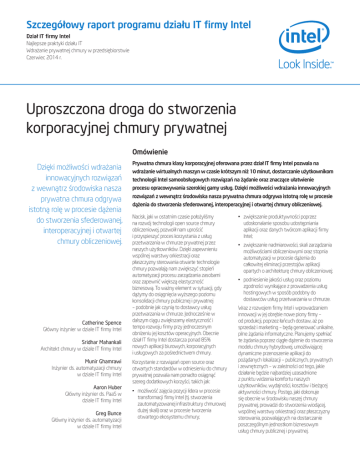 Szczegółowy raport programu działu IT firmy Intel Dział IT firmy Intel Najlepsze praktyki działu IT Wdrażanie prywatnej chmury w przedsiębiorstwie Czerwiec 2014 r. Uproszczona droga do stworzenia korporacyjnej chmury prywatnej Omówienie Dzięki możliwości wdrażania innowacyjnych rozwiązań z wewnątrz środowiska nasza prywatna chmura odgrywa istotną rolę w procesie dążenia do stworzenia sfederowanej, interoperacyjnej i otwartej chmury obliczeniowej. Catherine Spence Główny inżynier w dziale IT firmy Intel Sridhar Mahankali Architekt chmury w dziale IT firmy Intel Munir Ghamrawi Inżynier ds. automatyzacji chmury w dziale IT firmy Intel Aaron Huber Główny inżynier ds. PaaS w dziale IT firmy Intel Greg Bunce Główny inżynier ds. automatyzacji w dziale IT firmy Intel Prywatna chmura klasy korporacyjnej oferowana przez dział IT firmy Intel pozwala na wdrażanie wirtualnych maszyn w czasie krótszym niż 10 minut, dostarczanie użytkownikom technologii Intel samoobsługowych rozwiązań na żądanie oraz znaczące ułatwienie procesu opracowywania szerokiej gamy usług. Dzięki możliwości wdrażania innowacyjnych rozwiązań z wewnątrz środowiska nasza prywatna chmura odgrywa istotną rolę w procesie dążenia do stworzenia sfederowanej, interoperacyjnej i otwartej chmury obliczeniowej. Nacisk, jaki w ostatnim czasie położyliśmy na rozwój technologii open source chmury obliczeniowej, pozwolił nam uprościć i przyspieszyć proces korzystania z usług przetwarzania w chmurze prywatnej przez naszych użytkowników. Dzięki zapewnieniu wspólnej warstwy orkiestracji oraz płaszczyzny sterowania otwarte technologie chmury pozwalają nam zwiększyć stopień automatyzacji procesu zarządzania zasobami oraz zapewnić większą elastyczność biznesową. To ważny element w sytuacji, gdy dążymy do osiągnięcia wyższego poziomu konsolidacji chmury publicznej i prywatnej – podobnie jak czynią to dostawcy usług przetwarzania w chmurze. Jednocześnie w dalszym ciągu zwiększamy elastyczność i tempo rozwoju firmy przy jednoczesnym obniżeniu jej kosztów operacyjnych. Obecnie dział IT firmy Intel dostarcza ponad 85% nowych aplikacji biurowych, korporacyjnych i usługowych za pośrednictwem chmury. Korzystanie z rozwiązań open source oraz otwartych standardów w odniesieniu do chmury prywatnej pozwala nam ponadto osiągnąć szereg dodatkowych korzyści, takich jak: • możliwość zajęcia pozycji lidera w procesie transformacji firmy Intel (tj. stworzenia zautomatyzowanej infrastruktury chmurowej dużej skali) oraz w procesie tworzenia otwartego ekosystemu chmury; • zwiększanie produktywności poprzez udoskonalanie sposobu udostępniania aplikacji oraz danych twórcom aplikacji firmy Intel; • zwiększanie nadmiarowości, skali zarządzania możliwościami obliczeniowymi oraz stopnia automatyzacji w procesie dążenia do całkowitej eliminacji przestojów aplikacji opartych o architekturę chmury obliczeniowej; • podniesienie jakości usług oraz poziomu zgodności wynikające z prowadzenia usług hostingowych w sposób podobny do dostawców usług przetwarzania w chmurze. Wraz z rozwojem firmy Intel i wprowadzaniem innowacji w jej obrębie nowe piony firmy – od produkcji, poprzez łańcuch dostaw, aż po sprzedaż i marketing – będą generować unikalne, pilne żądania informatyczne. Planujemy spełniać te żądania poprzez ciągłe dążenie do stworzenia modelu chmury hybrydowej, umożliwiającej dynamiczne przenoszenie aplikacji do pożądanych lokalizacji – publicznych, prywatnych i zewnętrznych – w zależności od tego, jakie działanie będzie najbardziej uzasadnione z punktu widzenia komfortu naszych użytkowników, wydajności, kosztów i bieżącej aktywności chmury. Postęp, jaki dokonuje się obecnie w środowisku naszej chmury prywatnej, prowadzi do stworzenia wiodącej, wspólnej warstwy orkiestracji oraz płaszczyzny sterowania, pozwalających na dostarczanie poszczególnym jednostkom biznesowym usług chmury publicznej i prywatnej. Szczegółowy raport działu IT firmy Intel Uproszczona droga do stworzenia korporacyjnej chmury prywatnej Spis treści PODŁOŻE BIZNESOWE Omówienie..............................................................................1 Dział IT firmy Intel zarządza ogromnym, globalnym środowiskiem obliczeniowym obsługującym około 100 tysięcy pracowników firmy za pośrednictwem około 55 tysięcy serwerów i 64 centrów przetwarzania danych. Nasi pracownicy uzyskują dostęp do naszych usług za pomocą przeszło 147 tysięcy urządzeń. Mimo iż większość z nich stanowią przenośne komputery firmowe, ponad 43 tysiące to urządzenia podręczne. Podłoże biznesowe.........................................................2 Rozwój naszej chmury prywatnej................2 Ewolucja w kierunku chmury otwartej....4 Najlepsze praktyki ..........................................................5 Wdrażanie strategii hostingu na wzór dostawców usług przetwarzani w chmurze........................................................................5 Rozwój modeli dostarczania usług chmurowych.....................................................................9 Tworzenie aplikacji obsługujących chmurę..............................................................................11 Wyniki .....................................................................................12 Podsumowanie...............................................................12 Dodatkowe informacje............................................13 Akronimy................................................................................13 IT@INTEL Program IT@Intel łączy specjalistów ds. IT z całego świata ze specjalistami naszego przedsiębiorstwa, umożliwiając współdzielenie doświadczeń, metodyk i strategii. Nasz cel jest prosty: udostępniać najlepsze praktyki działu IT firmy Intel, pozwalające odnosić korzyśc
