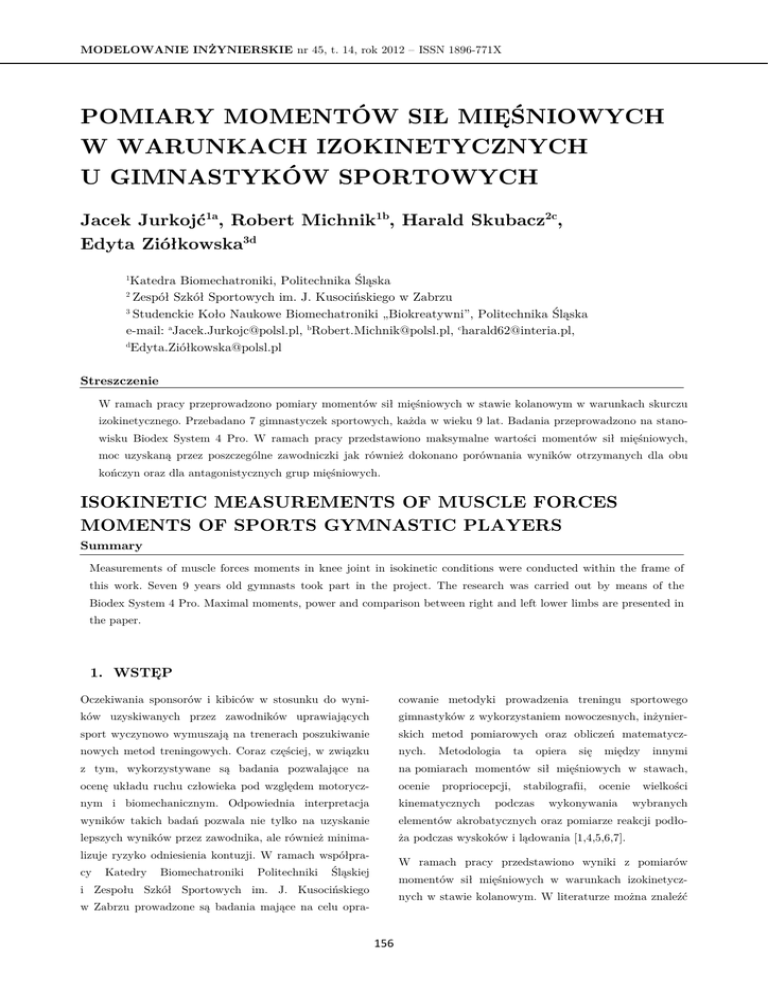 MODELOWANIE INŻYNIERSKIE nr 45, t. 14, rok 2012 – ISSN 1896-771X POMIARY MOMENTÓW SIŁ MIĘŚNIOWYCH W WARUNKACH IZOKINETYCZNYCH U GIMNASTYKÓW SPORTOWYCH Jacek Jurkojć1a, Robert Michnik1b, Harald Skubacz2c, Edyta Ziółkowska3d Katedra Biomechatroniki, Politechnika Śląska Zespół Szkół Sportowych im. J. Kusocińskiego w Zabrzu 3 Studenckie Koło Naukowe Biomechatroniki „Biokreatywni”, Politechnika Śląska e-mail: [email protected], [email protected], [email protected], d Edyta.Ziół[email protected] 1 2 Streszczenie W ramach pracy przeprowadzono pomiary momentów sił mięśniowych w stawie kolanowym w warunkach skurczu izokinetycznego. Przebadano 7 gimnastyczek sportowych, każda w wieku 9 lat. Badania przeprowadzono na stanowisku Biodex System 4 Pro. W ramach pracy przedstawiono maksymalne wartości momentów sił mięśniowych, moc uzyskaną przez poszczególne zawodniczki jak również dokonano porównania wyników otrzymanych dla obu kończyn oraz dla antagonistycznych grup mięśniowych. ISOKINETIC MEASUREMENTS OF MUSCLE FORCES MOMENTS OF SPORTS GYMNASTIC PLAYERS Summary Measurements of muscle forces moments in knee joint in isokinetic conditions were conducted within the frame of this work. Seven 9 years old gymnasts took part in the project. The research was carried out by means of the Biodex System 4 Pro. Maximal moments, power and comparison between right and left lower limbs are presented in the paper. 1. WSTĘP Oczekiwania sponsorów i kibiców w stosunku do wyni- cowanie metodyki prowadzenia treningu sportowego ków uzyskiwanych przez zawodników uprawiających gimnastyków z wykorzystaniem nowoczesnych, inżynier- sport wyczynowo wymuszają na trenerach poszukiwanie skich metod pomiarowych oraz obliczeń matematycz- nowych metod treningowych. Coraz częściej, w związku nych. z tym, wykorzystywane są badania pozwalające na na pomiarach momentów sił mięśniowych w stawach, ocenę układu ruchu człowieka pod względem motorycz- ocenie nym i biomechanicznym. Odpowiednia interpretacja kinematycznych wyników takich badań pozwala nie tylko na uzyskanie elementów akrobatycznych oraz pomiarze reakcji podło- lepszych wyników przez zawodnika, ale również minima- ża podczas wyskoków i lądowania [1,4,5,6,7]. lizuje ryzyko odniesienia kontuzji. W ramach współpracy Katedry Biomechatroniki Politechniki Metodologia propriocepcji, ta opiera się stabilografii, podczas między ocenie wykonywania innymi wielkości wybranych W ramach pracy przedstawiono wyniki z pomiarów Śląskiej momentów sił mięśniowych w warunkach izokinetycz- i Zespołu Szkół Sportowych im. J. Kusocińskiego nych w stawie kolanowym. W literaturze można znaleźć w Zabrzu prowadzone są badania mające na celu opra- 156 Jacek Jurkojć, Robert Michnik, Harald Skubacz, Edyta Ziółkowska wiele pozycji odwołujących się do badań izokinetycz- 3. WYNIKI BADAŃ nych. Jest to jedna z najpopularniejszych metod badań W ramach badań przeprowadzone zostały pomiary funkcji stawu kolanowego po zabiegach, w zapobieganiu siedmiu gimnastyczek w wieku 9 lat każda. Średnia urazów, a także dla oceny pracujących wokół stawu masa badanych osób wynosiła 29,3 ± 3,3 kg, natomiast kolanowego grup mięśniowych w różnych dyscyplinach wzrost 1,35 ± 0,06 m. sportu [2,3,8]. Badania izokinetyczne są często wykorzystywane przez trenerów do analizy wyników zawodni- Badania umożliwiały w sposób bezpośredni pomiar ków, polepszenia tych wyników, a także do formułowa- przebiegu wartości momentów sił mięśniowych w czasie nia ćwiczenia. Na tej podstawie wyznaczane i analizowane nowych, udoskonalonych metod treningowych. Wyniki tych badań dają dużo informacji o stanie fizycz- były następujące wielkości: nym zawodnika, a także o ryzyku wystąpienia kontuzji, spowodowanej nierównomiernej rozbudowie muskulatury. • maksymalny moment sił mięśniowych • stosunek maksymalnego momentu sił mięśniowych działających na staw kolanowy do masy ciała 2. METODYKA BADAŃ Do wykonania pomiarów momentów sił mięśniowych • moc średnia • stosunek wartości momentu siły mięśni kończyny prawej i lewej (SPL) liczony jako iloraz różnicy mak- w warunkach izokinetycznych wykorzystane zostało symalnego momentu kończyny lewej (ML) i prawej stanowisko Biodex System 4 Pro, składające się z fotela, (MP) przez wartość maksymalnego momentu koń- dynamometru oraz komputera z oprogramowaniem. czyny lewej Przed rozpoczęciem badań osoba była unieruchamiana w taki sposób aby wyizolować ruch w badanym stawie, M −M M L P (1) S = • stosunek wartości momentu siły prostowników PL uniemożliwiając wspomaganie go innymi częściami ciała. ⋅100[%] L Ustawiana była również oś obrotu głowicy pomiarowej i zginaczy (SPZ) liczony jako iloraz maksymalnego tak, aby pokrywała się z osią obrotu stawu. Badanie momentu siły zginaczy (MZ) przez maksymalny polegało na wykonywaniu przez badanego zawodnika moment prostowników (MP) ruchu zginania i prostowania w stawie kolanowym z maksymalną możliwą siłą i podzielone zostało na trzy S PZ serie. W pierwszych dwóch zawodnik wykonywał po = M M Z (2) ⋅ 100[%] P pięć powtórzeń z prędkościami: ω=60 deg/s i ω= 180 Wszystkie wielkości analizowano dla prostowników deg/s. Ostatnia, trzecia, seria składa się z dwudziestu i zginaczy kończyny prawej i lewej przy prędkościach powtórzeń i wykonywana była z prędkością ω=300 /̊ s. kątowych ω=60 °/s, ω=180 °/s, ω= 300 °/s. W artykule Ruch zginania/prostowania wykonywany był pomiędzy zaprezentowano wyniki dla prędkości ω=60 °/s. 70 kończyna wyprostowana w stawie kolanowym). Badanie 60 Maksymalne wartości momentów [Nm] 15° i 100° zgięcia kończyny w stawie kolanowym (0° prowadzone było dla obu kończyn. Każdy pomiar poprzedzony był rozgrzewką prowadzoną dwustopniowo. Przed badaniem zawodnik rozgrzewa się 50 40 30 20 indywidualnie, natom