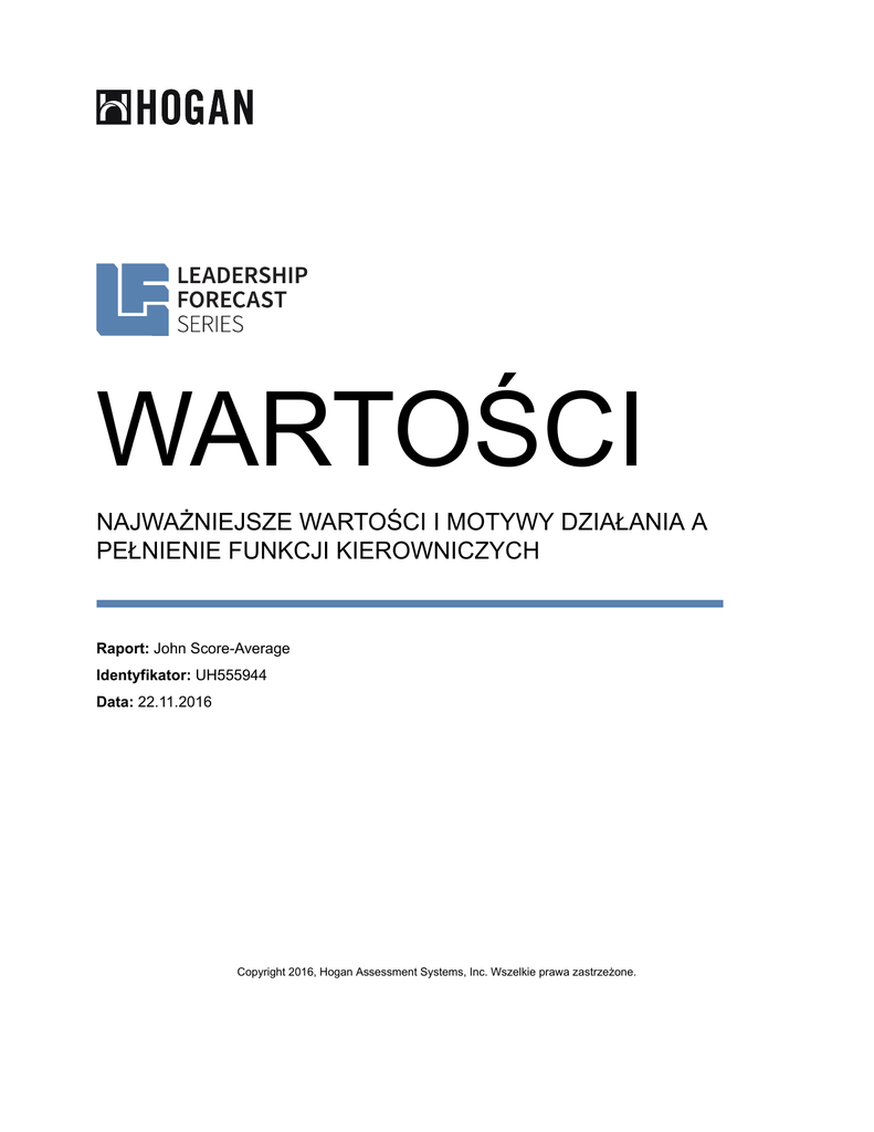 WARTOŚCI NAJWAŻNIEJSZE WARTOŚCI I MOTYWY DZIAŁANIA A PEŁNIENIE FUNKCJI KIEROWNICZYCH Raport: John Score-Average Identyfikator: UH555944 Data: 22.11.2016 Copyright 2016, Hogan Assessment Systems, Inc. Wszelkie prawa zastrzeżone. Leadership Forecast™ Values Report Wprowadzenie Należący do serii Przywództwo raport Wartości opisuje Twoje najważniejsze osobiste wartości i cele, a także ich potencjalny wpływ na przebieg kariery zawodowej. Wartości stanowią nieodłączną część tożsamości – mówią o tym, kim jesteśmy, co jest dla nas istotne oraz określają optymalne dla nas środowisko. Wartości wpływają na decyzje, jakie podejmujemy w odniesieniu do pracy, wolnego czasu i relacji z innymi, a także wpływają na przebieg naszej kariery zawodowej na cztery sposoby. 1. Motywy:: Wartości należą do kluczowych czynników kierujących naszymi działaniami – leżą u podstaw naszej motywacji. Wartości decydują o naszych aspiracjach i są odzwierciedleniem naszych dążeń i celów. Wartości określają nasze pragnienia związane z pracą i życiem. 2. Dopasowanie:: Wartości decydują o tym, jak dobrze pasujemy do kultury danej organizacji. Kultura organizacyjna zazwyczaj odzwierciedla wartości wyższej kadry kierowniczej. Pracownicy dobrze się czują i efektywnie wykonują swoje obowiązki, kiedy otaczająca ich kultura jest zgodna z ich wartościami. Niepokój i wątpliwości budzi zaś praca w ramach kultury, której wartości różnią się od ich własnych. 3. Styl Przywództwa i Kultura:: Wartości odzwierciedlają to, co jest dla nas cenne i zwracają uwagę na to, czego nie lubimy i czego wolelibyśmy unikać. Dlatego też wartości określają zachowania, które cenimy i lubimy, a także takie, których unikamy lub nie lubimy. W rezultacie, nasze wartości nadają kształt kulturze, którą jako liderzy tworzymy dla pracowników i podwładnych. 4. Nieuświadomiona Stronniczość:: Wartości mają wpływ na podejmowane decyzje – dotyczące pracowników, projektów, planów i strategii. Wartości to filtr procesu postrzegania doświadczeń, w szczególności zaś tego, co jest pożądane, a co nie; co jest dobre, a co złe. Wartości zwykle funkcjonują poza świadomością i mają wpływ zarówno na nasze myśli, jak i działania. Sposoby Wykorzystania tych Informacji W trakcie zapoznawania się z tym raportem może się okazać, że wyznawane przez nas wartości nie są zgodne z wykonywaną pracą lub wymaganiami wynikającym z funkcji pełnionej obecnie w firmie. Ponadto może się zdarzyć, że nasze codzienne zachowania wcale nie są pomocne, a wręcz uniemożliwiają osiąganie celów związanych z pracą zawodową. Nie należy próbować zmieniać swoich wartości, jeśli nie współgrają one z wykonywaną pracą lub firmą. Należy raczej, poprzez uświadomienie sobie swoich wartości i ich podświadomego wpływu, zacząć kształtować swoje zachowania w taki sposób, aby stworzyć bardziej produktywne warunki pracy dla nas i dla naszego zespołu. Poniższy raport został sporządzony w oparciu o wyniki uzyskane w Kwestionariuszu Motywów, Wartości i Preferencji (ang. Motives, Values, Preferences Inventory – MVPI). Na raport składa się zestawienie najważniejszych motywów, rodzaju kultury, jaką tworzymy jako liderzy, preferowanych (lub unikanych) kultur organizacyjnych, czynników, które w podświadomy sposób mogą wpływać na nasz proces decyzyjny, a także ewentualnych strategii służących minimalizacji uprzedzeń i skutecznemu pełnieniu funkcji kierowniczych. John Score-Average | UH555944 | 22.11.2016 2 Leadership Forecast™ Values Report Sposoby Wykorzystania tych Informacji Na kolejnej stronie znajduje się 10 skal MVPI, a następnie przedstawiony jest graf ilustrujący Twój profil wartości. W dalszej kolejności przedstawiony jest raport, w którym omówione jest znaczenie i implikacje osiągniętego wyniku na każdej skali względem wskaźników opisanych powyżej. I wreszcie, w końcowej części tego raportu zawarte są sugestie dotyczące możliwości rozwoju w oparciu o wartości, których celem jest pomoc w zwiększeniu swojej efektywności przywódczej. Należy zwrócić uwagę, iż wyniki w przedziale 65–100 percentyla uznawane są za wysokie i odzwierciedlają cele, do których dążymy na co dzień. Im wyższy wynik, tym dana wartość lub motyw jest ważniejszy w pracy i życiu osobistym. Wyniki na poziomie 36–64 percentyla określamy jako średnie. Odzwierciedlają one wartości, które mają ambiwalentne znaczenie. W przedziale tym mieszczą się wartości, które reprezentują przyjemności lub wartości, które nie mają dla nas większego znaczenia. Wyniki na poziomie 0–35 percentyla uważa się za niskie. Dotyczą one wartości, które nie są dla nas kluczowe. Im niższy wynik na danej skali niniejszego raportu, tym większe prawdopodobieństwo, że określona wartość jest nam obojętna. Wysokie i niskie wyniki na każdej skali mają istotne konsekwencje dla przebiegu kariery zawodowej. Informacje zawarte w tym raporcie pozwolą na lepsze zrozumienie siebie i swoich dążeń, u których podstaw leżą wartości. Informacje te są pomocne w optymalnym wykorzystywaniu mocnych stron oraz minimalizowaniu błędów taktycznych. Można sobie lepiej uświadomić tworzoną przez siebie kulturę i wykorzystać te informacje do lepszej współpracy z innymi osobami w organizacji. W konkurencyjnych warunkach biznesowych, znajomość siebie i skuteczne wpływanie na swoje zachowanie jest istotnym atutem, który pomaga w osiąganiu sukcesów na stanowisku kierowniczym. John Score-Average | UH555944 | 22.11.2016 3 Leadership Forecast™ Values Report Definicje Należący do serii Przywództwo Raport Wartości opiera się na wynikach uzyskanych na dziesięciu skalach MVPI. Poniżej znajdują się definicje tych skal. ROZPOZNAWALNOŚĆ Obojętność na bycie widocznym kontra chęć bycia dostrzeżonym Poszuki