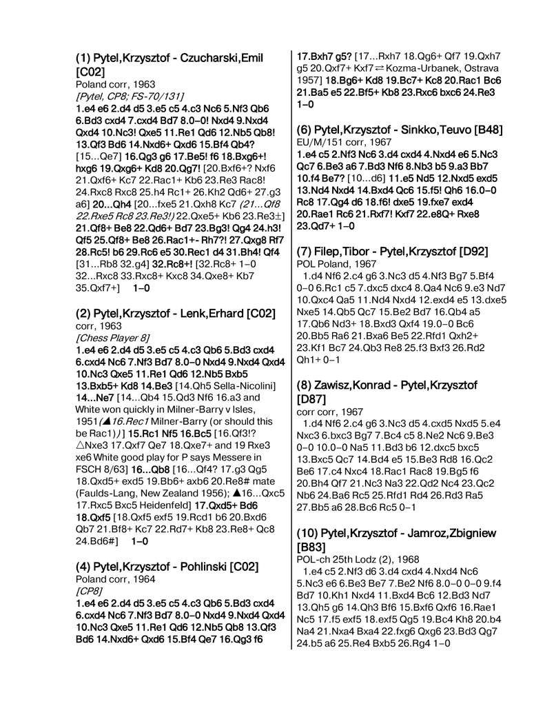 (1) Pytel,Krzysztof - Czucharski,Emil [C02] Poland corr, 1963 [Pytel, CP8; FS-70/131] 1.e4 e6 2.d4 d5 3.e5 c5 4.c3 Nc6 5.Nf3 Qb6 6.Bd3 cxd4 7.cxd4 Bd7 8.0–0! Nxd4 9.Nxd4 Qxd4 10.Nc3! Qxe5 11.Re1 Qd6 12.Nb5 Qb8! 13.Qf3 Bd6 14.Nxd6+ Qxd6 15.Bf4 Qb4? [15...Qe7] 16.Qg3 g6 17.Be5! f6 18.Bxg6+! hxg6 19.Qxg6+ Kd8 20.Qg7! [20.Bxf6+? Nxf6 21.Qxf6+ Kc7 22.Rac1+ Kb6 23.Re3 Rac8! 24.Rxc8 Rxc8 25.h4 Rc1+ 26.Kh2 Qd6+ 27.g3 a6] 20...Qh4 [20...fxe5 21.Qxh8 Kc7 (21...Qf8 22.Rxe5 Rc8 23.Re3!) 22.Qxe5+ Kb6 23.Re3±] 21.Qf8+ Be8 22.Qd6+ Bd7 23.Bg3! Qg4 24.h3! Qf5 25.Qf8+ Be8 26.Rac1+- Rh7?! 27.Qxg8 Rf7 28.Rc5! b6 29.Rc6 e5 30.Rec1 d4 31.Bh4! Qf4 [31...Rb8 32.g4] 32.Rc8+! [32.Rc8+ 1–0 32...Rxc8 33.Rxc8+ Kxc8 34.Qxe8+ Kb7 35.Qxf7+] 1–0 (2) Pytel,Krzysztof - Lenk,Erhard [C02] corr, 1963 [Chess Player 8] 1.e4 e6 2.d4 d5 3.e5 c5 4.c3 Qb6 5.Bd3 cxd4 6.cxd4 Nc6 7.Nf3 Bd7 8.0–0 Nxd4 9.Nxd4 Qxd4 10.Nc3 Qxe5 11.Re1 Qd6 12.Nb5 Bxb5 13.Bxb5+ Kd8 14.Be3 [14.Qh5 Sella-Nicolini] 14...Ne7 [14...Qb4 15.Qd3 Nf6 16.a3 and White won quickly in Milner-Barry v Isles, 1951(‹16.Rec1 Milner-Barry (or should this be Rac1)) ] 15.Rc1 Nf5 16.Bc5 [16.Qf3!? …Nxe3 17.Qxf7 Qe7 18.Qxe7+ and 19 Rxe3 xe6 White good play for P says Messere in FSCH 8/63] 16...Qb8 [16...Qf4? 17.g3 Qg5 18.Qxd5+ exd5 19.Bb6+ axb6 20.Re8# mate (Faulds-Lang, New Zealand 1956); ‹16...Qxc5 17.Rxc5 Bxc5 Heidenfeld] 17.Qxd5+ Bd6 18.Qxf5 [18.Qxf5 exf5 19.Rcd1 b6 20.Bxd6 Qb7 21.Bf8+ Kc7 22.Rd7+ Kb8 23.Re8+ Qc8 24.Bd6#] 1–0 (4) Pytel,Krzysztof - Pohlinski [C02] Poland corr, 1964 [CP8] 1.e4 e6 2.d4 d5 3.e5 c5 4.c3 Qb6 5.Bd3 cxd4 6.cxd4 Nc6 7.Nf3 Bd7 8.0–0 Nxd4 9.Nxd4 Qxd4 10.Nc3 Qxe5 11.Re1 Qd6 12.Nb5 Qb8 13.Qf3 Bd6 14.Nxd6+ Qxd6 15.Bf4 Qe7 16.Qg3 f6 17.Bxh7 g5? [17...Rxh7 18.Qg6+ Qf7 19.Qxh7 g5 20.Qxf7+ Kxf7„ Kozma-Urbanek, Ostrava 1957] 18.Bg6+ Kd8 19.Bc7+ Kc8 20.Rac1 Bc6 21.Ba5 e5 22.Bf5+ Kb8 23.Rxc6 bxc6 24.Re3 1–0 (6) Pytel,Krzysztof - Sinkko,Teuvo [B48] EU/M/151 corr, 1967 1.e4 c5 2.Nf3 Nc6 3.d4 cxd4 4.Nxd4 e6 5.Nc3 Qc7 6.Be3 a6 7.Bd3 Nf6 8.Nb3 b5 9.a3 Bb7 10.f4 Be7? [10...d6] 11.e5 Nd5 12.Nxd5 exd5 13.Nd4 Nxd4 14.Bxd4 Qc6 15.f5! Qh6 16.0–0 Rc8 17.Qg4 d6 18.f6! dxe5 19.fxe7 exd4 20.Rae1 Rc6 21.Rxf7! Kxf7 22.e8Q+ Rxe8 23.Qd7+ 1–0 (7) Filep,Tibor - Pytel,Krzysztof [D92] POL Poland, 1967 1.d4 Nf6 2.c4 g6 3.Nc3 d5 4.Nf3 Bg7 5.Bf4 0–0 6.Rc1 c5 7.dxc5 dxc4 8.Qa4 Nc6 9.e3 Nd7 10.Qxc4 Qa5 11.Nd4 Nxd4 12.exd4 e5 13.dxe5 Nxe5 14.Qb5 Qc7 15.Be2 Bd7 16.Qb4 a5 17.Qb6 Nd3+ 18.Bxd3 Qxf4 19.0–0 Bc6 20.Bb5 Ra6 21.Bxa6 Be5 22.Rfd1 Qxh2+ 23.Kf1 Bc7 24.Qb3 Re8 25.f3 Bxf3 26.Rd2 Qh1+ 0–1 (8) Zawisz,Konrad - Pytel,Krzysztof [D87] corr corr, 1967 1.d4 Nf6 2.c4 g6 3.Nc3 d5 4.cxd5 Nxd5 5.e4 Nxc3 6.bxc3 Bg7 7.Bc4 c5 8.Ne2 Nc6 9.Be3 0–0 10.0–0 Na5 11.Bd3 b6 12.dxc5 bxc5 13.Bxc5 Qc7 14.Bd4 e5 15.Be3 Rd8 16.Qc2 Be6 17.c4 Nxc4 18.Rac1 Rac8 19.Bg5 f6 20.Bh4 Qf7 21.Nc3 Na3 22.Qd2 Nc4 23.Qc2 Nb6 24.Ba6 Rc5 25.Rfd1 Rd4 26.Rd3 Ra5 27.Bb5 a6 28.Bc6 Rc5 0–1 (10) Pytel,Krzysztof - Jamroz,Zbigniew [B83] POL-ch 25th Lodz (2), 1968 1.e4 c5 2.Nf3 d6 3.d4 cxd4 4.Nxd4 Nc6 5.Nc3 e6 6.Be3 Be7 7.Be2 Nf6 8.0–0 0–0 9.f4 Bd7 10.Kh1 Nxd4 11.Bxd4 Bc6 12.Bd3 Nd7 13.Qh5 g6 14.Qh3 Bf6 15.Bxf6 Qxf6 16.Rae1 Nc5 17.f5 exf5 18.exf5 Qg5 19.Bc4 Kh8 20.b4 Na4 21.Nxa4 Bxa4 22.fxg6 Qxg6 23.Bd3 Qg7 24.b5 a6 25.Re4 Bxb5 26.Rg4 1–0 (16) Pytel,Krzysztof - Marszalek,Rafal [E60] POL-ch 25th Lodz (8), 1968 1.Nf3 Nf6 2.g3 g6 3.b3 c5 4.c4 Bg7 5.Bb2 Nc6 6.Bg2 0–0 7.0–0 d6 8.d4 Ng4 9.Qd2 cxd4 10.Nxd4 Qb6 11.e3 Bd7 12.h3 Nf6 13.Ne2 a6 14.Nbc3 Rab8 15.Nd5 Nxd5 16.cxd5 Qb4 17.Qc1 Bxb2 18.Qxb2 Na7 19.Rfd1 Rbc8 20.a4 a5 21.Rd4 Qb6 22.b4 Rc7 23.Qd2 axb4 24.Rxb4 Qa6 25.Qb2 Rb8 26.Nd4 b6 27.h4 h5 28.Kh2 Qa5 29.Nb5 Rc5 30.Nc3 Rbc8 31.Ne4 Rc2 32.Qd4 b5 33.axb5 Ra2 34.Rxa2 Qxa2 35.Ra4 Qb1 36.Rxa7 Qxb5 1–0 13.axb4 Rxa1 14.Bxa1 Nd3 15.exd3 Bxa1 16.Nc3 Bxc3 17.Qxc3 Re8 18.h4 h5 19.Ra1 Qe7 20.Ra7 c5 21.bxc5 dxc5 22.Be4 Qd6 23.Qb2 Qd4 24.Qxd4 cxd4 25.Bxb7 Bxb7 26.Rxb7 Re1+ 27.Kg2 Rd1 28.Rb3 Rd2 29.Kf1 Kg7 30.Ke1 Ra2 31.Rb5 Ra1+ 32.Ke2 Ra2+ 33.Kf3 Rd2 34.Ke4 Rxf2 35.Kxd4 Rg2 36.c5 1–0 (35) Ekblom,Per Erik - Pytel,Krzysztof [B35] POL-ch 25th Lodz (11), 1968 1.c4 g6 2.Nc3 Bg7 3.g3 c5 4.Bg2 Nc6 5.d3 e6 6.e4 Nge7 7.Nge2 d6 8.0–0 0–0 9.Rb1 Rb8 10.Be3 Nd4 11.Bxd4 cxd4 12.Nb5 Nc6 13.a4 a6 14.Na3 Nb4 15.Nc2 Qb6 16.a5 Qxa5 17.Qd2 Nc6 18.Qxa5 Nxa5 19.b4 Nxc4 20.dxc4 d3 21.Ncd4 dxe2 22.Nxe2 b5 23.Rfd1 bxc4 24.Rxd6 Re8 25.Rc6 a5 26.b5 Bd7 27.Ra6 Rxb5 28.Rxb5 Bxb5 29.Rxa5 Rb8 30.Bf1 c3 31.Ra2 Bc4 32.Rc2 Rb2 0–1 EU/M/190 corr, 1969 1.e4 c5 2.Nf3 Nc6 3.d4 cxd4 4.Nxd4 g6 5.Nc3 Bg7 6.Be3 Nf6 7.Bc4 Qa5 8.0–0 0–0 9.Bb3 [9.Nb3] 9...d6 10.h3 Bd7 11.f4 Nxd4 12.Bxd4 Bc6 13.Qd3 Rad8 14.f5?! Nd7 15.Bxg7 Kxg7 16.Qd4+ Qe5!? 17.Rad1 [17.Qxa7 Nc5 18.Rae1 e6!] 17...Qxd4+ 18.Rxd4 Nf6–+ 19.g4? g5! 20.Rfd1 Nd7 21.Nd5 Bxd5 22.Rxd5 Rc8 23.c3 Kf6 24.Kf2 Ne5 25.Kg3 h5 26.R1d2 Rh8? [26...hxg4! 27.hxg4 Rh8] 27.Bd1! Nc4 28.Rf2 Ne3 29.Rd3 hxg4 30.Bxg4 Nxg4 31.hxg4 Rh4 32.Rd5 Rch8 33.Rg2 Rh1 34.Rdd2 Ke5! 35.a4 R8h3+ 36.Kf2 Kf4 37.f6! Rf3+ 38.Ke2 Re3+ 39.Kf2 Ree1 40.Rh2! Rhf1+! [40...Ref1+? 41.Ke2 Rxh2+ 42.Kxf1 Rxd2 43.fxe7І] 41.Kg2 exf6 42.Rh7 Ke3 0–1 (25) Kovacs,Laszlo - Pytel,Krzysztof [B38] (43) Pytel,Krzysztof Kwasniewski,Janusz [A41] (19) Zoltek,Tadeusz - Pytel,Krzysztof [A36] Lublin PKWN 4th Lublin (2), 1968 1.e4 c5 2.Nf3 Nc6 3.d4 cxd4 4.Nxd4 g6 5.c4 Bg7 6.Be3 Nf6 7.Nc3 0–0 8.Be2 d6 9.h3 Nxd4 10.Bxd4 Bd7 11.0–0 Bc6 12.Bf3 a5 13.Rc1 Nd7 14.Nd5 Bxd4 15.Qxd4 e5 16.Qd2 Nc5 17.g3 Ne6 18.Bg2 Nd4 19.Kh2 Bxd5 20.exd5 Qb6 21.f4 f6 22.Rc3 Qc5 23.h4 Rae8 24.h5 gxh5 25.f5 Re7 26.Qd1 Rg7 27.Qxh5 Rg5 28.Qh3 b6 29.b3 b5 30.Be4 Qb4 31.g4 Rc8 32.Qd3 h5 33.Rfc1 bxc4 34.Rxc4 Rxc4 35.Rxc4 Qe1 36.Rc8+ Kg7 37.Rc7+ Kh6 38.Bg2 hxg4 39.Qc3 0–1 (28) Pytel,Krzysztof - Jamroz,Zbigniew [A05] Lublin PKWN 4th Lublin (5), 1968 1.Nf3 Nf6 2.g3 g6 3.b4 Bg7 4.Bb2 d6 5.c4 0–0 6.d4 Nbd7 7.Bg2 e5 8.dxe5 Ng4 9.0–0 Ngxe5 10.Nxe5 Nxe5 11.Qc1 a5 12.a3 axb4 POL-ch 26th Lublin (4), 1969 1.c4 e5 2.Nc3 Nc6 3.Nf3 d6 4.d4 Bg4 5.d5 Nce7 6.e4 Ng6 7.g3 Be7 8.Bg2 Nf6 9.