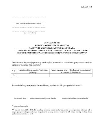 Załącznik Nr 8 ………………………………………………. ………………………………………………. (imię i nazwisko rodzica/opiekuna prawnego) …………………………………….………… ………………………………….…………… (adres zamieszkania) OŚWIADCZENIE RODZICA/OPIEKUNA PRAWNEGO SAMOTNIE WYCHOWUJĄCEGO KANDYDATA O ZATRUDNIENIU / PROWADZENIU ROLNICZEJ LUB POZAROLNICZEJ DZIAŁALNOŚCI GOSPODARCZEJ / STUDIOWANIU LUB UCZENIU SIĘ W SYSTEMIE STACJONARNYM * Oświadczam, że pracuję/prowadzę rolniczą lub pozarolniczą działalność gospodarczą/studiuję/ uczę się w systemie stacjonarnym*: L.p. Nazwisko i imię rodzica / opiekuna prawnego Nazwa zakładu pracy / działalność gospodarcza / nazwa szkoły lub uczelni 1. Jestem świadomy/a odpowiedzialności karnej za złożenie fałszywego oświadczenia**. …………………… ………………………………………. ..………...…………………………… (miejscowość, data) (podpis matki/opiekunki prawnej dziecka) (podpis ojca/opiekuna prawnego dziecka) * - niepotrzebne skreślić **- zgodnie z art. 233 § 1 kk. kto składając zeznanie mające służyć za dowód w postępowaniu sądowym lub w innym postępowaniu prowadzonym na podstawie ustawy, zeznaje nieprawdę lub zataja prawdę, podlega karze pozbawienia wolności do lat 3