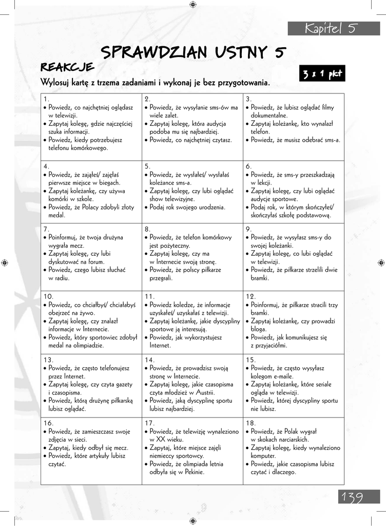 REAKCJE SPRAW DZIAN USTNY 5 Wylosuj kartę z trzema zadaniami i wykonaj je bez przygotowania. Kapitel 5 3 x 1 pkt 1. • Powiedz, co najchętniej oglądasz w telewizji. • Zapytaj kolegę, gdzie najczęściej szuka informacji. • Powiedz, kiedy potrzebujesz telefonu komórkowego. 2. • Powiedz, że wysyłanie sms-ów ma wiele zalet. • Zapytaj kolegę, która audycja podoba mu się najbardziej. • Powiedz, co najchętniej czytasz. 3. • Powiedz, że lubisz oglądać filmy dokumentalne. • Zapytaj koleżankę, kto wynalazł telefon. • Powiedz, że musisz odebrać sms-a. 4. • Powiedz, że zająłeś/ zajęłaś pierwsze miejsce w biegach. • Zapytaj koleżankę, czy używa komórki w szkole. • Powiedz, że Polacy zdobyli złoty medal. 5. • Powiedz, że wysłałeś/ wysłałaś koleżance sms-a. • Zapytaj kolegę, czy lubi oglądać show telewizyjne. • Podaj rok swojego urodzenia. 6. • Powiedz, że sms-y przeszkadzają w lekcji. • Zapytaj kolegę, czy lubi oglądać audycje sportowe. • Podaj rok, w którym skończyłeś/ skończyłaś szkołę podstawową. 7. • Poinformuj, że twoja drużyna wygrała mecz. • Zapytaj kolegę, czy lubi dyskutować na forum. • Powiedz, czego lubisz słuchać w radiu. 8. • Powiedz, że telefon komórkowy jest pożyteczny. • Zapytaj kolegę, czy ma w Internecie swoją stronę. • Powiedz, że polscy piłkarze przegrali. 9. • Powiedz, że wysyłasz sms-y do swojej koleżanki. • Zapytaj kolegę, co lubi oglądać w telewizji. • Powiedz, że piłkarze strzelili dwie bramki. 10. • Powiedz, co chciałbyś/ chciałabyś obejrzeć na żywo. • Zapytaj kolegę, czy znalazł informacje w Internecie. • Powiedz, który sportowiec zdobył medal na olimpiadzie. 11. • Powiedz koledze, że informacje uzyskałeś/ uzyskałaś z telewizji. • Zapytaj koleżankę, jakie dyscypliny sportowe ją interesują. • Powiedz, jak wykorzystujesz Internet. 12. • Poinformuj, że piłkarze stracili trzy bramki. • Zapytaj koleżankę, czy prowadzi bloga. • Powiedz, jak komunikujesz się z przyjaciółmi. 13. • Powiedz, że często telefonujesz przez Internet. • Zapytaj kolegę, czy czyta gazety i czasopisma. • Powiedz, którą drużynę piłkarską lubisz oglądać. 14. • Powiedz, że prowadzisz swoją stronę w Internecie. • Zapytaj kolegę, jakie czasopisma czyta młodzież w Austrii. • Powiedz, jaką dyscyplinę sportu lubisz najbardziej. 15. • Powiedz, że często wysyłasz kolegom e-maile. • Zapytaj koleżankę, które seriale ogląda w telewizji. • Powiedz, której dyscypliny sportu nie lubisz. 16. • Powiedz, że zamieszczasz swoje zdjęcia w sieci. • Zapytaj, kiedy odbył się mecz. • Powiedz, które artykuły lubisz czytać. 17. • Powiedz, że telewizję wynaleziono w XX wieku. • Zapytaj, które miejsce zajęli niemieccy sportowcy. • Powiedz, że olimpiada letnia odbyła się w Pekinie. 18. • Powiedz, że Polak wygrał w skokach narciarskich. • Zapytaj kolegę, kiedy wynaleziono komputer. • Powiedz, jakie czasopisma lubisz czytać i dlaczego. 139 Kapitel 5 140 Kapitel 5 DIALOGI 6 pkt Przygotujcie się z kolegą/ koleżanką do przeprowadzenia dialogu na podstawie otrzymanego opisu lub diagramu, a następnie przedstawcie go klasie. PIERWSZA PARA Uczeń A Korzystasz codziennie z komputera: piszesz i wysyłasz e-maile i prowadzisz swój blog. Odpowiedz na pytania kolegi/ koleżanki i dowiedz się, do czego i jak często używa komputera. DRUGA PARA Uczeń A Zapytaj, co kolega/ koleżanka najchętniej ogląda w TV. Uczeń B Odpowiedz na pytania kolegi/ koleżanki i dowiedz się, do czego i jak często używa komputera. Korzystasz z komputera tylko w weekendy: wstawiasz swoje zdjęcia do Internetu i rozmawiasz na czacie. Uczeń B Odpowiedz na pytanie (filmy) i dowiedz się, co kolega/ koleżanka oglądał/ oglądała wczoraj w TV. Odpowiedz (mecz) i zapytaj, czy kolega/ koleżanka oglądał/a go wczoraj. Wyraź zdziwienie i powiedz, że zawsze oglądasz mecze. TRZECIA PARA Uczeń A Odpowiedz, że nie lubisz sportu w TV. Powiedz, że wczoraj oglądałeś/ oglądałaś swój ulubiony serial. Uczeń B Du, was lesen? Jugendzeitschriften und Comics. Du? Tageszeitungen und Thriller. Deine Lieblingszeitschrift? „Computer“ und „Bravo“. Was, du, jetzt lesen? Roman von Dan Brown. Du, was? CZWARTA PARA Uczeń A Lubisz oglądać filmy dokumentalne, bo interesujesz się historią. Nie interesujesz się sportem, ale czasami oglądasz jazdę figurową na lodzie. Odpowiedz na pytania kolegi/ koleżanki i dowiedz się, co lubi oglądać w telewizji i dlaczego oraz czego nie ogląda i z jakiego powodu. Artikel über Computerprogramme Uczeń B Zapytaj kolegę/ koleżankę, co lubi oglądać w telewizji i dlaczego oraz czy interesuje się sportem i ogląda transmisje sportowe. Następnie odpowiedz na jego/ jej pytania. Oglądasz codziennie wiadomości, bo interesujesz się polityką. Nie oglądasz thrillerów, bo są za późno. 141 Kapitel 5 PIĄTA PARA Uczeń A Ich, mein Leben, ohne Handy, nicht vorstellen Und immer Kontakt, zu Freunden Uczeń B (+) Handy, nützlich. Ich, Termine, Infos im Handy (+), aber, Handys, manchmal stören (+), Unterricht. Ich, bekommen, SMS. Ich, sich, nicht konzentrieren können (+), die Eltern wissen, was, ich, machen SZÓSTA PARA Uczeń A Odpowiedz na pytania kolegi/ koleżanki zgodnie z rysunkiem. Uczeń B Zapytaj kolegę/ koleżankę, co wczoraj robił/ robiła. Dowiedz się gdzie i z kim oglądał/ oglądała mecz piłkarski oraz kto wygrał. 2:1 SIÓDMA PARA Uczeń A Zapytaj kolegę/ koleżankę, jak korzysta z Internetu. Powiedz, że zamieszczasz tam dane o sobie oraz zdjęcia. Zapytaj, czy lubi dyskutować na forum. ÓSMA PARA Uczeń A Zapytaj kolegę/ koleżankę, czy interesuje się sportem i jakie dyscypliny sportowe lubi oglądać. Ty interesujesz się siatkówką. Wczoraj oglądałeś/ oglądałaś mecz Polska – Niemcy. Niemcy przegrali mecz. 142 Uczeń B Powiedz, 