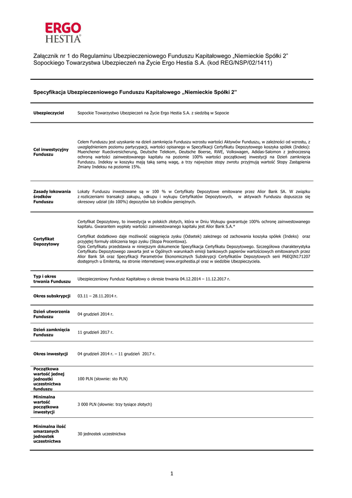 Załącznik nr 1 do Regulaminu Ubezpieczeniowego Funduszu Kapitałowego „Niemieckie Spółki 2” Sopockiego Towarzystwa Ubezpieczeń na Życie Ergo Hestia S.A. (kod REG/NSP/02/1411) Specyfikacja Ubezpieczeniowego Funduszu Kapitałowego „Niemieckie Spółki 2” Ubezpieczyciel Cel inwestycyjny Funduszu Zasady lokowania środków Funduszu Sopockie Towarzystwo Ubezpieczeń na Życie Ergo Hestia S.A. z siedzibą w Sopocie Celem Funduszu jest uzyskanie na dzień zamknięcia Funduszu wzrostu wartości Aktywów Funduszu, w zależności od wzrostu, z uwzględnieniem poziomu partycypacji, wartości opisanego w Specyfikacji Certyfikatu Depozytowego koszyka spółek (Indeks): Muenchener Rueckversicherung, Deutsche Telekom, Deutsche Boerse, RWE, Volkswagen, Adidas-Salomon z jednoczesną ochroną wartości zainwestowanego kapitału na poziomie 100% wartości początkowej inwestycji na Dzień zamknięcia Funduszu. Indeksy w koszyku mają taką samą wagę, a trzy najwyższe stopy zwrotu przyjmują wartość Stopy Zastąpienia Zmiany Indeksu na poziomie 15%. Lokaty Funduszu inwestowane są w 100 % w Certyfikaty Depozytowe emitowane przez Alior Bank SA. W związku z rozliczeniami transakcji zakupu, odkupu i wykupu Certyfikatów Depozytowych, w aktywach Funduszu dopuszcza się okresowy udział (do 100%) depozytów lub środków pieniężnych. Certyfikat Depozytowy, to inwestycja w polskich złotych, która w Dniu Wykupu gwarantuje 100% ochronę zainwestowanego kapitału. Gwarantem wypłaty wartości zainwestowanego kapitału jest Alior Bank S.A.* Certyfikat Depozytowy Certyfikat dodatkowo daje możliwość osiągnięcia zysku (Odsetek) zależnego od zachowania koszyka spółek (Indeks) oraz przyjętej formuły obliczenia tego zysku (Stopa Procentowa). Opis Certyfikatu przedstawia w niniejszym dokumencie Specyfikacja Certyfikatu Depozytowego. Szczegółowa charakterystyka Certyfikatu Depozytowego zawarta jest w Ogólnych warunkach emisji bankowych papierów wartościowych emitowanych przez Alior Bank SA oraz Specyfikacji Parametrów Ekonomicznych Subskrypcji Certyfikatów Depozytowych serii P6EQIN171207 dostępnych u Emitenta, na stronie internetowej www.ergohestia.pl oraz w siedzibie Ubezpieczyciela. Typ i okres trwania Funduszu Ubezpieczeniowy Fundusz Kapitałowy o okresie trwania 04.12.2014 – 11.12.2017 r. Okres subskrypcji 03.11 – 28.11.2014 r. Dzień utworzenia Funduszu 04 grudzień 2014 r. Dzień zamknięcia Funduszu 11 grudzień 2017 r. Okres inwestycji 04 grudzień 2014 r. – 11 grudzień 2017 r. Początkowa wartość jednej jednostki uczestnictwa funduszu 100 PLN (słownie: sto PLN) Minimalna wartość początkowa inwestycji 3 000 PLN (słownie: trzy tysiące złotych) Minimalna ilość umarzanych jednostek uczestnictwa 30 jednostek uczestnictwa 1 Zarządzający Funduszem Podmiot uprawniony na podstawie powszechnie obowiązujących przepisów prawa do zarządzania aktywami na zlecenie Ryzyka związane z inwestycją w Fundusz Inwestowanie w Fundusz wiąże się między innymi z następującymi ryzykami: • Ryzyko Inwestycyjne - poziom ryzyka inwestycyjnego Funduszu jest tożsamy z ryzykiem inwestycyjnym Certyfikatów Depozytowych, w które lokowane są Aktywa Funduszu. Ze względu na ryzyko płynności oraz ryzyko kredytowe Emitenta Certyfikatów Depozytowych, Ubezpieczyciel nie gwarantuje ochrony kapitału zarówno w Okresie inwestycji jak i na jej koniec, określonej na poziomie 100% wartości początkowej inwestycji. • Ryzyko zmiany cen - z uwagi na charakter kształtowania się cen Certyfikatów Depozytowych, cena jednostki uczestnictwa Funduszu może ulegać istotnym zmianom w Okresie inwestycji. • Ryzyko nie osiągnięcia zysku z inwestycji, gdyż końcowe oprocentowanie Certyfikatów Depozytowych, a co za tym idzie możliwy wynik inwestycyjny Funduszu, nie jest z góry ustalony. Należy wziąć pod uwagę fakt, że zysk z inwestycji może być niższy niż oczekiwany lub nie wystąpić wcale • Ryzyko osiągnięcia stopy zwrotu niższej niż ewentualny wzrost wartości Indeksu – z uwagi na przyjętą formułę (Stopa Procentowa), stopa zwrotu z Funduszu nie będzie odzwierciedlała zachowania Indeksu. Należy wziąć pod uwagę fakt, że wartość wypłaty (ostateczna stopa zwrotu z Funduszu) zależy od ceny odkupu/wartości wykupu Certyfikatu Depozytowego otrzymanej od Emitenta. • Ryzyko utraty części zainwestowanego kapitału Emitent Certyfikatów Depozytowych zapewnia 100% ochronę kapitału tylko w Dniu Wykupu Certyfikatu. Ochrona kapitału dotyczy tylko Wartości początkowej inwestycji (nie obejmuje zapłaconej opłaty początkowej). W przypadku wycofania środków przed końcem okresu inwestycji istnieje ryzyko utraty części zainwestowanych środków. • Ryzyko kredytowe Emitenta - całość zobowiązania płatniczego z tytułu Certyfikatów Depozytowych w okresie do Dnia Wykupu (włącznie) ciąży na Alior Bank Spółka Akcyjna, dlatego Klient powinien przed podjęciem decyzji o rozpoczęciu inwestycji ocenić wiarygodność kredytową Emitenta. • Ryzyko kredytowe Ubezpieczyciela – zobowiązania z tytułu umowy ubezpieczenia ciążą na STUnŻ Ergo Hestia SA, dlatego Klient powinien przed podjęciem decyzji o przystąpieniu do umowy ubezpieczenia ocenić wiarygodność kredytową Ubezpieczyciela. • Ryzyko wypłaty świadczenia ubezpieczeniowego/wartości wykupu w kwocie niższej niż wartość początkowa inwestycji • Ryzyko płynności – w zakresie obrotu wtórnego Certyfikatami Depozytowymi i ich wykupu, istnieje ryzyko opóźnienia lub braku realizacji transakcji odkupu/wykupu Certyfikatów Depozytowych przez Emitenta • Ryzyko ograniczonej płynności związane z cyklem umorzeń jednostek uczestnictwa Funduszu. • Ryzyko braku uzyskania Ceny odkupu Certyfikatu Depozytowego od Emitenta w uzgodnionym terminie, co może powodować opóźnienia w przyjętych do realizacji wnioskach uprawnionych o wypłatę świadczenia lub wnioskach Ubezpieczaj