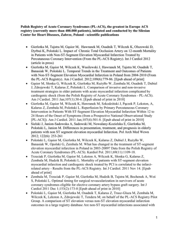 Polish Registry of Acute Coronary Syndromes (PL-ACS), the greatest in Europe ACS registry (currently more than 400.000 patients), initiated and conducted by the Silesian Center for Heart Diseases, Zabrze, Poland - scientific publications Gierlotka M, Tajstra M, Gąsior M, Hawranek M, Osadnik T, Wilczek K, Olszowski D, Dyrbuś K, Poloński L. Impact of Chronic Total Occlusion Artery on 12-month Mortality in Patients with Non-ST-Segment Elevation Myocardial Infarction Treated by Percutaneous Coronary Intervention (From the PL-ACS Registry). Int J Cardiol 2012 (article in press) Gierlotka M, Gąsior M, Wilczek K, Wasilewski J, Hawranek M, Tajstra M, Osadnik T, Banasiak W, Poloński L. Temporal Trends in the Treatment and Outcomes of Patients with Non-ST-Segment Elevation Myocardial Infarction in Poland from 2004-2010 (From the PL-ACS Registry). Am J Cardiol. 2012;109(6):779-86. [Epub ahead of print] Gąsior M, Słonka G, Wilczek K, Gierlotka M, Rużyłło W, Zembala M, Osadnik T, Dubiel J, Zdrojewski T, Kalarus Z, Poloński L. Comparison of invasive and non-invasive treatment strategies in older patients with acute myocardial infarction complicated by cardiogenic shock (from the Polish Registry of Acute Coronary Syndromes - PL-ACS). Am J Cardiol. 2011 Jan;107(1):30-6. [Epub ahead of print in 2010] Gierlotka M, Gąsior M, Wilczek K, Hawranek M, Szkodziński J, Pączek P, Lekston, A, Kalarus Z, Zembala M, Poloński L. Reperfusion by Primary Percutaneous Coronary Intervention in Patients With ST-Segment Elevation Myocardial Infarction Within 12 to 24 Hours of the Onset of Symptoms (from a Prospective National Observational Study [PL-ACS]). Am J Cardiol. 2011 Jan;107(4):501-8. [Epub ahead of print in 2010] Sielski J, Janion-Sadowska A, Sadowski M, Nowalany-Kozielska E, Gierlotka M, Poloński L, Janion M. Differences in presentation, treatment, and prognosis in elderly patients with non ST segment elevation myocardial Infarction. Pol Arch Med Wewn 2012; 122(6): 253-261 Poloński L, Gąsior M, Gierlotka M, Wilczek K, Kalarus Z, Dubiel J, Rużyłło W, Banasiak W, Opolski G, Zembala M. What has changed in the treatment of ST-segment elevation myocardial infarction in Poland in 2003-2009? Data from the Polish Registry of Acute Coronary Syndromes (PL-ACS). Kardiol Pol. 2011;69(11):1109-18. Trzeciak P, Gierlotka M, Gąsior M, Lekston A, Wilczek K, Słonka G, Kalarus Z, Zembala M, Hudzik B, Poloński L. Mortality of patients with ST-segment elevation myocardial infarction and cardiogenic shock treated by PCI is correlated to the infarctrelated artery - Results from the PL-ACS Registry. Int J Cardiol. 2011 Nov 14. [Epub ahead of print] Zembala M, Trzeciak P, Gąsior M, Gierlotka M, Hudzik B, Tajstra M, Bochenek A, Woś S, Poloński L. Optimal timing for surgical revascularization in survivors of acute coronary syndromes eligible for elective coronary artery bypass graft surgery. Int J Cardiol 2011 Dec 1;153(2):173-8 [Epub ahead of print in 2010] Poloński L, Gąsior M, Gierlotka M, Osadnik T, Kalarus Z, Trusz-Gluza M, Zembala M, Wilczek K, Lekston A, Zdrojewski T, Tendera M; on behalf of the PL-ACS Registry Pilot Group. A comparison of ST elevation versus non-ST elevation myocardial infarction outcomes in a large registry database Are non-ST myocardial infarctions associated with 1 worse long-term prognoses? Int J Cardiol. 2011 Oct 6;152(1):70-7 [Epub ahead of print in 2010] Janion-Sadowska A, Sielski J, Gierlotka M, Nowalany-Kozielska E, Janion M, Poloński L. Gender-related differences in clinical course, therapeutic approach and prognosis in patients with non-ST segment elevation myocardial infarction. Kardiol Pol. 2011;69(8):784-92 Frycz-Kurek AM, Gierlotka M, Gąsior M, Wilczek K, Lekston A, Kalarus Z, Poloński L. Patients with no significant lesions in coronary arteries and ST-segment elevation myocardial infarction have worse outcome than patients with non-ST-segment elevation myocardial infarction: analysis from PL-ACS Registry. Kardiol Pol. 2010 Nov;68(11):1211-7. Polewczyk A, Janion M, Gąsior M, Gierlotka M, Poloński L. Benefits from revascularisation therapy in the elderly with acute myocardial infarction. Comparative analysis of patients hospitalised in 1992-1996 and in 2005-2006. Kardiol Pol. 2010 Aug;68(8):873-81. Sadowski M, Gąsior M, Gierlotka M, Janion M, Poloński L. Clinical characteristics of Polish women with ST-segment elevation myocardial infarction. Kardiol Pol. 2010 Jun;68(6):627-34. Janion M, Polewczyk A, Gąsior M, Gierlotka M, Poloński L. Does reperfusion in the treatment of acute myocardial infarction improve the prognosis of acute myocardial infarction in diabetic patients? Clin Cardiol. 2009 Sep;32(9):E51-5. Janion M., Polewczyk A, Gąsior M., Poloński L. Progress in the management of STsegment elevation myocardial infarction during economic transition in Poland between 1992 and 2006. Int. J. Cardiol. 2009;135: 253-265. Publications from the most important multicenter studies for the last 3 years Zembala M., Michler R., Rynkiewicz A., Huynh T., She L., Lubiszewska B., Hill J., Jandova R., Dagenais F., Peterson E., Jones R.: Clinical characteristics of patients undergoing surgical ventricular re construction by choice and by randomization. J Am Coll Cardiol 2010; 56:499-507. (STICH) Tang Z, Diamond MA, Chen JM, Holly TA, Bonow RO, Dasgupta A, Hyslop T, Purzycki A, Wagner J, McNamara DM, Kukulski T, Wos S, Velazquez EJ, Ardlie K, Feldman AM. Polymorphisms in adenosine receptor genes are associated with infarct size in patients with ischemic cardiomyopathy. Clin Pharmacol Ther. 2007 Oct;82(4):435-40. Epub 2007 Aug 29. (STICH) Daniel B., Mark, J. David Knight, Eric J. Velazquez, Jonathan G. Howlett, John A., Spertus, MD, Ljubomir T. Djokovic, Tina M. Harding, Gena R. Rankin, Laura A.Drew RN, BSN, Bożena Szyguła-Jurkiewicz, Christopher Adlbrecht, Kevin J. Anstrom. Quality of life and economic outcomer with surgical ventricular reconstruction in ischemic heart failure: 