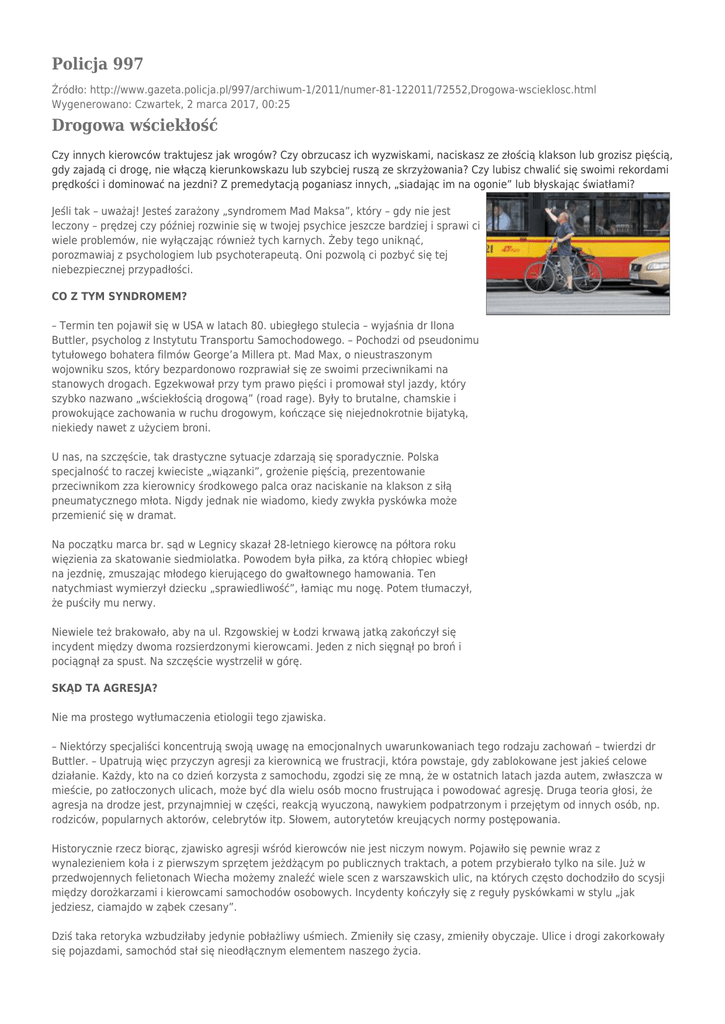 Policja 997 Źródło: http://www.gazeta.policja.pl/997/archiwum-1/2011/numer-81-122011/72552,Drogowa-wscieklosc.html Wygenerowano: Czwartek, 2 marca 2017, 00:25 Drogowa wściekłość Czy innych kierowców traktujesz jak wrogów? Czy obrzucasz ich wyzwiskami, naciskasz ze złością klakson lub grozisz pięścią, gdy zajadą ci drogę, nie włączą kierunkowskazu lub szybciej ruszą ze skrzyżowania? Czy lubisz chwalić się swoimi rekordami prędkości i dominować na jezdni? Z premedytacją poganiasz innych, „siadając im na ogonie” lub błyskając światłami? Jeśli tak – uważaj! Jesteś zarażony „syndromem Mad Maksa”, który – gdy nie jest leczony – prędzej czy później rozwinie się w twojej psychice jeszcze bardziej i sprawi ci wiele problemów, nie wyłączając również tych karnych. Żeby tego uniknąć, porozmawiaj z psychologiem lub psychoterapeutą. Oni pozwolą ci pozbyć się tej niebezpiecznej przypadłości. CO Z TYM SYNDROMEM? – Termin ten pojawił się w USA w latach 80. ubiegłego stulecia – wyjaśnia dr Ilona Buttler, psycholog z Instytutu Transportu Samochodowego. – Pochodzi od pseudonimu tytułowego bohatera filmów George’a Millera pt. Mad Max, o nieustraszonym wojowniku szos, który bezpardonowo rozprawiał się ze swoimi przeciwnikami na stanowych drogach. Egzekwował przy tym prawo pięści i promował styl jazdy, który szybko nazwano „wściekłością drogową” (road rage). Były to brutalne, chamskie i prowokujące zachowania w ruchu drogowym, kończące się niejednokrotnie bijatyką, niekiedy nawet z użyciem broni. U nas, na szczęście, tak drastyczne sytuacje zdarzają się sporadycznie. Polska specjalność to raczej kwieciste „wiązanki”, grożenie pięścią, prezentowanie przeciwnikom zza kierownicy środkowego palca oraz naciskanie na klakson z siłą pneumatycznego młota. Nigdy jednak nie wiadomo, kiedy zwykła pyskówka może przemienić się w dramat. Na początku marca br. sąd w Legnicy skazał 28-letniego kierowcę na półtora roku więzienia za skatowanie siedmiolatka. Powodem była piłka, za którą chłopiec wbiegł na jezdnię, zmuszając młodego kierującego do gwałtownego hamowania. Ten natychmiast wymierzył dziecku „sprawiedliwość”, łamiąc mu nogę. Potem tłumaczył, że puściły mu nerwy. Niewiele też brakowało, aby na ul. Rzgowskiej w Łodzi krwawą jatką zakończył się incydent między dwoma rozsierdzonymi kierowcami. Jeden z nich sięgnął po broń i pociągnął za spust. Na szczęście wystrzelił w górę. SKĄD TA AGRESJA? Nie ma prostego wytłumaczenia etiologii tego zjawiska. – Niektórzy specjaliści koncentrują swoją uwagę na emocjonalnych uwarunkowaniach tego rodzaju zachowań – twierdzi dr Buttler. – Upatrują więc przyczyn agresji za kierownicą we frustracji, która powstaje, gdy zablokowane jest jakieś celowe działanie. Każdy, kto na co dzień korzysta z samochodu, zgodzi się ze mną, że w ostatnich latach jazda autem, zwłaszcza w mieście, po zatłoczonych ulicach, może być dla wielu osób mocno frustrująca i powodować agresję. Druga teoria głosi, że agresja na drodze jest, przynajmniej w części, reakcją wyuczoną, nawykiem podpatrzonym i przejętym od innych osób, np. rodziców, popularnych aktorów, celebrytów itp. Słowem, autorytetów kreujących normy postępowania. Historycznie rzecz biorąc, zjawisko agresji wśród kierowców nie jest niczym nowym. Pojawiło się pewnie wraz z wynalezieniem koła i z pierwszym sprzętem jeżdżącym po publicznych traktach, a potem przybierało tylko na sile. Już w przedwojennych felietonach Wiecha możemy znaleźć wiele scen z warszawskich ulic, na których często dochodziło do scysji między dorożkarzami i kierowcami samochodów osobowych. Incydenty kończyły się z reguły pyskówkami w stylu „jak jedziesz, ciamajdo w ząbek czesany”. Dziś taka retoryka wzbudziłaby jedynie pobłażliwy uśmiech. Zmieniły się czasy, zmieniły obyczaje. Ulice i drogi zakorkowały się pojazdami, samochód stał się nieodłącznym elementem naszego życia. Z analiz przeprowadzonych przez Ośrodek Badań Opinii Publicznej na zlecenie Krajowej Rady Bezpieczeństwa Ruchu Drogowego, dotyczących agresji i kultury na drodze, wynika, że blisko 80 proc. kierowców przynajmniej raz w tygodniu spotyka się z agresją ze strony innych kierujących, w tym co trzeci każdego dnia. Najczęściej powodem scysji jest szybka i ryzykowna jazda. Ponad połowę badanych minimum raz w tygodniu wyprowadza z równowagi wymuszanie pierwszeństwa przejazdu (17 proc. kierowców każdego dnia znajduje się w takiej sytuacji). Co drugi kierowca skarży się, że przynajmniej raz w tygodniu spotyka się z agresywną jazdą innych (co dziesiąty każdego dnia), która zmusza go do gwałtownego hamowania, zmiany pasa ruchu bądź wykonywania innych niebezpiecznych manewrów, aby uniknąć kolizji. Takie zachowania wywołują w nich złość, a nawet wściekłość i powodują natychmiastową chęć ukarania. To zjawisko określane jest mianem „postawy strażnika”, wyraża się w pościgach, zmuszaniu do zatrzymania, a nawet użyciu siły fizycznej. – Nasi kierowcy nie jeżdżą, tylko walczą ze sobą na drodze – uważa dr Andrzej Markowski, psycholog, wiceprezes Stowarzyszenia Psychologów Transportu. – Trąbią, gdy tylko coś im się nie spodoba, ruszają z piskiem opon spod świateł, a gdy ktoś im zajedzie drogę, to najchętniej by go rozjechali. W ten sposób ujawniają się nasze atawistyczne korzenie. Bezmyślna agresja, która niczemu nie służy, to najprostsza, pierwotna wręcz forma wyrażania siebie. Udowodnienie, że jest się lepszym, ważniejszym od innych, pokazanie „kto rządzi na drodze” czy nawet popisywanie się przed samym sobą, to częsta postawa, której celem jest samodowartościowanie. ZAGROŻENI KONTROLERZY Zjawisko agresji na drodze dotyka nie tylko zmotoryzowanych Kowalskich 