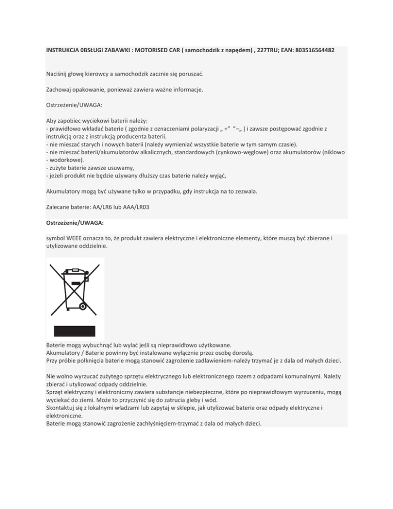 INSTRUKCJA 0BSŁUGI ZABAWKI : MOTORISED CAR ( samochodzik z napędem) , 227TRU; EAN: 803516564482 Naciśnij głowę kierowcy a samochodzik zacznie się poruszać. Zachowaj opakowanie, ponieważ zawiera ważne informacje. Ostrzeżenie/UWAGA: Aby zapobiec wyciekowi baterii należy: - prawidłowo wkładać baterie ( zgodnie z oznaczeniami polaryzacji „ +” ”–„ ) i zawsze postępować zgodnie z instrukcją oraz z instrukcją producenta baterii. - nie mieszać starych i nowych baterii (należy wymieniać wszystkie baterie w tym samym czasie). - nie mieszać baterii/akumulatorów alkalicznych, standardowych (cynkowo-węglowe) oraz akumulatorów (niklowo - wodorkowe). - zużyte baterie zawsze usuwamy, - jeżeli produkt nie będzie używany dłuższy czas baterie należy wyjąć, Akumulatory mogą być używane tylko w przypadku, gdy instrukcja na to zezwala. Zalecane baterie: AA/LR6 lub AAA/LR03 Ostrzeżenie/UWAGA: symbol WEEE oznacza to, że produkt zawiera elektryczne i elektroniczne elementy, które muszą być zbierane i utylizowane oddzielnie. Baterie mogą wybuchnąć lub wylać jeśli są nieprawidłowo użytkowane. Akumulatory / Baterie powinny być instalowane wyłącznie przez osobę dorosłą. Przy próbie połknięcia baterie mogą stanowić zagrożenie zadławieniem-należy trzymać je z dala od małych dzieci. Nie wolno wyrzucać zużytego sprzętu elektrycznego lub elektronicznego razem z odpadami komunalnymi. Należy zbierać i utylizować odpady oddzielnie. Sprzęt elektryczny i elektroniczny zawiera substancje niebezpieczne, które po nieprawidłowym wyrzuceniu, mogą wyciekać do ziemi. Może to przyczynić się do zatrucia gleby i wód. Skontaktuj się z lokalnymi władzami lub zapytaj w sklepie, jak utylizować baterie oraz odpady elektryczne i elektroniczne. Baterie mogą stanowić zagrożenie zachłyśnięciem-trzymać z dala od małych dzieci.