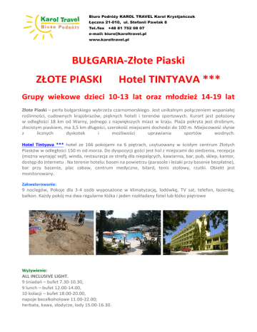 Biuro Podróży KAROL TRAVEL Karol Krystjańczuk Łęczna 21-010, ul. Stefanii Pawlak 8 Tel./fax +48 81 752 08 07 e-mail: [email protected] www.karoltravel.pl BUŁGARIA-Złote Piaski ZŁOTE PIASKI Hotel TINTYAVA *** Grupy wiekowe dzieci 10-13 lat oraz młodzież 14-19 lat Złote Piaski – perła bułgarskiego wybrzeża czarnomorskiego. Jest unikalnym połączeniem wspaniałej roślinności, cudownych krajobrazów, pięknych hoteli i terenów sportowych. Kurort jest położony w odległości 18 km od Warny, jednego z największych miast w kraju. Plaża pokryta jest drobnym, złocistym piaskiem, ma 3,5 km długości, szerokość miejscami dochodzi do 100 m. Miejscowość słynie z licznych dyskotek i możliwości uprawiania sportów wodnych. Hotel Tintyava *** hotel ze 166 pokojami na 6 piętrach, usytuowany w ścisłym centrum Złotych Piasków w odległości 150 m od morza. Do dyspozycji gości jest hol z miejscami do siedzenia, recepcja (można wynająć sejf), winda, restauracja ze strefą dla niepalących, kawiarnia, bar, pub, sklep, kantor, dostęp do internetu . Na terenie hotelu: basen na powietrzu (parasole i leżaki przy basenie bezpłatne), bar przy basenie, plac zabaw, centrum medyczne, bilard, tenis stołowy, rzutki. Obiekt jest monitorowany. Zakwaterowanie: 9 noclegów, Pokoje dla 3-4 osób wyposażone w klimatyzację, lodówkę, TV sat, telefon, łazienkę, balkon. Każdy pokój ma dwa regularne łóżka i jeden rozkładany fotel lub łóżko piętrowe Wyżywienie: ALL INCLUSIVE LIGHT. 9 śniadań – bufet 7.30-10.30, 9 lunch – bufet 12.00-14.00, 10 kolacji – bufet 18.00-20.00, napoje bezalkoholowe 11.00-22.00; herbata, kawa, słodycze, lody 15.00-16.30. Biuro Podróży KAROL TRAVEL Karol Krystjańczuk Łęczna 21-010, ul. Stefanii Pawlak 8 Tel./fax +48 81 752 08 07 e-mail: [email protected] www.karoltravel.pl Pierwszym posiłkiem jest kolacja w dniu przyjazdu, ostatnim posiłkiem jest kolacja w dniu wyjazdu + suchy prowiant na drogę powrotną. Ramowy Program: 1 dzień Wyjazd z Lublina o godz. 9.00 ( przy I turnusie wyjazd godz.13.00). Przejazd przez Polskę, Słowację, Węgry, Rumunię. 2 dzień Przyjazd do Bułgarii do Złotych Piasków w godz. południowych. Zakwaterowanie w hotelu. Spotkanie organizacyjne. Kolacja. Nocleg. 3-10 dzień - Plażowanie, kąpiele w morzu i basenie - Zajęcia sportowo-rekreacyjne - Dyskoteki - Możliwość wzięcia udziału w wycieczkach fakultatywnych organizowanych przez kontrahenta bułgarskiego. 11 dzień Po śniadaniu wykwaterowanie z pokoi. Lunch. Czas wolny. Kolacja. Wyjazd ze Złotych Piasków w godzinach wieczornych. Przejazd przez Bułgarię i Rumunię. 12 dzień Przejazd przez Węgry i Słowację do Polski. Przyjazd do Lublina w późnych godzinach nocnych. Podczas pobytu na obozie jest możliwość wzięcia udziału w dodatkowych programach – płatne na miejscu Bałczik – Przylądek Kaliakra z wieczorem folklorystycznym ok. 43 EUR/os. Delfinarium w Warnie - ok.25 EUR/os. Istambuł – 2 dni ok. 90 EUR/os. + wiza 16 EUR Istambuł – 1 dzień ok.60 EUR/os. + wiza 16 EUR Jeep safari – ok.19 EUR/os. Piracka przygoda – ok. 39 EUR/os. Golf-piknik ze wspinaczką po górach – ok.26 EUR/os. Biuro Podróży KAROL TRAVEL Karol Krystjańczuk Łęczna 21-010, ul. Stefanii Pawlak 8 Tel./fax +48 81 752 08 07 e-mail: [email protected] www.karoltravel.pl Terminy i ceny: 1 turnus 26-06 - 07-07-2015 cena 1590 zł. 2 turnus 05-07 - 16-07-2015 cena 1660 zł 3 turnus 14-07 - 25-07-2015 cena 1660 zł 4 turnus 23-07 - 03-08-2015 cena 1660 zł 5 turnus 01-08 - 12-08-2015 cena 1660 zł 6 turnus 01-08 - 12-08-2015 cena 1660 zł Uwagi: - kaucja zwrotna 10 €/os. oraz depozyt kieszonkowy będzie zbierany przez opiekunów w dniu przyjazdu do hotelu. - sugerowane kieszonkowe 80€ - należy zabrać ze sobą ważny paszport lub dowód osobisty Cena obejmuje: - Przejazd autokarem wyposażonym w barek, toaletę, video, klimatyzację - 9 noclegów w hotelu TINTYAVA*** Złotych Piaskach - Wyżywienie: All inclusive light - Ubezpieczenie KL (10.000 EUR), NNW (5000 zł), w ERV - Opieka wykwalifikowanej kadry pedagogicznej, medycznej, miejskiego ratownika na plaży i basenie - Taksa klimatyczna - Podatek VAT Rozkład jazdy autokarów: I turnus: Lublin Hala MOSiR al Zygmuntowskie - godz. 13.00 II-V turnus: Lublin Hala MOSiR al Zygmuntowskie - godz. 9.00 Organizator: GULIVER