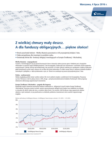 Warszawa, 4 lipca 2016 r. Z wielkiej chmury mały deszcz. A dla funduszy obligacyjnych… piękne słońce! • Brexit przechodzi bokiem - Wielka Brytania pozostanie w UE przynajmniej kolejne 2 lata. • Słabe perspektywy dla inwestycji na polskim rynku. • Doskonały klimat dla funduszy obligacji inwestujących w Europie Środkowej i Wschodniej. Wielka Brytania - rozpogodzenie Czasem z rozwiewających się już powoli burzowych chmur znienacka uderza jeszcze grom. Podobnie jest z brytyjskim referendum w sprawie wyjścia Wielkiej Brytanii z Unii Europejskiej. Zaskoczyło ono inwestorów i zachwiało cenami papierów wartościowych. Jednak wstrząs był krótkotrwały, huk przycichł i na wielu rynkach widzimy już uspokojenie. Indeksy większości giełd światowych są dziś wręcz wyższe niż na kilka dni przed referendum. To efekt naszej wiary w aktywne działanie banków centralnych i polityków, a także przekonania o tym, że Brexit nie zrealizuje się jeszcze przynajmniej przez 2 lata. Polska - zachmurzenie Słabiej wyglądają polskie akcje i polska waluta. Nie ma to jednak związku z problemami Unii Europejskiej. Przyczyny są inne. Pierwsza z nich to plany zmian w OFE, druga - pomysł przewalutowania kredytów frankowych. Takie prognozy skutecznie odstraszają zagranicznych inwestorów. Europa Środkowa i Wschodnia – pogoda dla bogaczy Doskonałe wyniki natomiast przyniosły fundusze ulokowane w obligacjach innych krajów Europy Środkowej i Wschodniej. Przyczyny znowu są dwie: wyższe oprocentowanie obligacji tych krajów oraz osłabienie się złotego w stosunku do takich walut jak euro, a ostatnio także forint i lira turecka. Jeśli fundusze mają zagraniczne aktywa właśnie w tych walutach, to po przeliczeniu na złotówki, polskiemu inwestorowi rośne wartość zagranicznego majątku. Wykres subfunduszy UniObligacje Aktywny i UniObligacje: Nowa Europa w okresie 1.01.2016 – 1.07.2016. 10% 8% 6% 4% 2% 0% -2% 03.02.2016 09.03.2016 UniObligacje Nowa Europa Źródło: opracowanie własne Union Investment TFI 20.04.2016 25.05.2016 UniObligacje Aktywny Warszawa, 4 lipca 2016 r. Najlepszy wynik, mimo niepogody Subfundusz UniObligacje Aktywny, którym zarządza Krzysztof Izdebski, mimo ciemnych chmur nad Europą, osiągnął 4,45% zysku od początku roku. To najlepszy wynik w Polsce wśród 30 funduszy tego typu. Są to głównie polskie, ale także inne, środkowoeuropejskie obligacje skarbowe. Nasz sukces jest efektem aktywnego zarządzania przy zachowaniu umiarkowanego ryzyka. (Warto zauważyć, że numer 2 ma wynik o ok. 1% słabszy*). Dobry klimat dla funduszy Subfundusz UniObligacje: Nowa Europa zarządzany przez Andrzeja Czarneckiego, przy nieco wyższym ryzyku, zarobił od początku roku aż 8,36%. Subfundusz inwestuje głównie w obligacje skarbowe z największymi udziałami obligacji polskich, węgierskich i tureckich. Z jednej strony duży wpływ na jego wynik miało osłabienie się polskiej waluty. Z drugiej strony, poprawia się tzw. sentyment inwestycyjny do Węgier i Turcji. To oznacza dobre perspektywy na następne miesiące. Na Wchodzie bez zmian Fundusz UniObligacje FIZ, którym również zarządza Andrzej Czarnecki, charakteryzuje się niską zmiennością i dużą powtarzalnością wyniku. I to mimo trudnych warunków. Fundusz zarobił w czerwcu 1,15%, a od początku roku 3,05%. Jest to inwestycja w dobrze oprocentowane obligacje krajów Europy Środkowej i Wschodniej, które są emitowane w euro i dolarze. Dodatkowo, zysk w wysokości ok. 1% w skali roku dają tzw. operacje FX SWAP. Kursy walut zabezpiecza kurs PLN. Dobre zarządzanie owocuje zyskiem przy każdej pogodzie Pomimo dużej zmienności na rynkach, nie jesteśmy skazani na wybór pomiędzy dwiema skrajnymi opcjami - bardzo bezpiecznymi lokatami bankowymi lub funduszami pieniężnymi a dużo bardziej ryzykownymi funduszami akcji. Zdarzają się, jak teraz, okresy dobrej koniunktury także dla funduszy obligacyjnych. A aktywne zarządzanie, innowacje i doświadczenie naszych specjalistów, pozwalają wypracować ponadprzeciętne wyniki w funduszach obligacyjnych. *Dane za Analizy.pl Z pozdrowieniami Krzysztof Orlik Zastępca Dyrektora ds. Sprzedaży Detalicznej Union Investment Towarzystwo Funduszy Inwestycyjnych S.A. tel. kom. (+48) 603 75 78 06 PS Ponownie zapraszam do obserwowania mojego profilu na Twitterze. Dzięki temu błyskawicznie dowiecie się o nowym komentarzu lub ciekawostkach ekonomicznych, które postaram się dla Was wyszukiwać. Wystarczy wejść na twitter.com, założyć konto i wpisać w wyszukiwarkę „Krzysztof Orlik”, a potem kliknąć „Obserwuj”. Warszawa, 4 lipca 2016 r. Masz pytania? 800 567 662 (+48) 22 449 03 33 (od poniedziałku do piątku, od 8.00 do 18.00). [email protected] Niniejszy materiał jest upowszechniany w celu reklamy lub promocji usług świadczonych przez Union Investment TFI S.A. Brak gwarancji osiągnięcia celów inwestycyjnych subfunduszy; możliwość zmniejszenia wartości, w tym utraty części zainwestowanych środków. Duża zmienność wartości aktywów netto: UniAkcje Małych i Średnich Spółek, UniAkcje Wzrostu, UniAkcje: Nowa Europa, UniKorona Akcje, UniKorona Zrównoważony, UniStabilny Wzrost, UniObligacje: Nowa Europa, UniAkcje: Turcja, UniAkcje Dywidendowy w UniFunduszeFIO oraz UniBessa, UniObligacje Aktywny, UniObligacje Zamienne, UniStrategie Dynamiczny, UniAkcje: Daleki Wschód, UniDynamiczna Alokacja Aktywów, UniAkcje Biopharma, UniAkcje Globalny Dywidendowy, SGB Zagraniczny w UniFunduszeSFIO. Możliwe lokaty ponad 35% wartości aktywów UniKorona Pieniężny, UniKorona Obligacje, UniStabilny Wzrost, UniKorona Zrównoważony, UniStrategie Dynamiczny, UniObligacje Zamienne, UniAkcje: Daleki Wschód, UniDynamiczna Alokacja Aktywów, UniAktywny Pieniężny, SGB Zagraniczny, SGB Dłużny w papiery wartościowe emitowane, poręczane lub gwarantowane przez Skarb Państwa albo Narodowy Bank Polski, a w przypadku UniDolar Pi