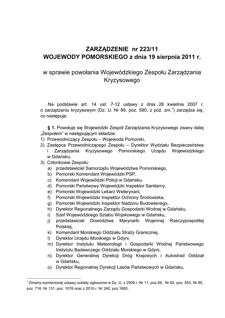 ZARZĄDZENIE nr 223/11 WOJEWODY POMORSKIEGO z dnia 19 sierpnia 2011 r. w sprawie powołania Wojewódzkiego Zespołu Zarządzania Kryzysowego Na podstawie art. 14 ust. 7-12 ustawy z dnia 26 kwietnia 2007 r. o zarządzaniu kryzysowym (Dz. U. Nr 89, poz. 590, z póź. zm.1) zarządza się, co następuje: § 1. Powołuje się Wojewódzki Zespół Zarządzania Kryzysowego zwany dalej „Zespołem” w następującym składzie: 1) Przewodniczący Zespołu – Wojewoda Pomorski, 2) Zastępca Przewodniczącego Zespołu – Dyrektor Wydziału Bezpieczeństwa i Zarządzania Kryzysowego Pomorskiego Urzędu Wojewódzkiego w Gdańsku, 3) Członkowie Zespołu: a) przedstawiciel Samorządu Województwa Pomorskiego, b) Pomorski Komendant Wojewódzki PSP, c) Komendant Wojewódzki Policji w Gdańsku, d) Pomorski Państwowy Wojewódzki Inspektor Sanitarny, e) Pomorski Wojewódzki Lekarz Weterynarii, f) Pomorski Wojewódzki Inspektor Ochrony Środowiska, g) Pomorski Wojewódzki Inspektor Nadzoru Budowlanego, h) Dyrektor Regionalnego Zarządu Gospodarki Wodnej w Gdańsku, i) Szef Wojewódzkiego Sztabu Wojskowego w Gdańsku, j) przedstawiciel Dowództwa Marynarki Wojennej Rzeczypospolitej Polskiej, k) Komendant Morskiego Oddziału StraŜy Granicznej, l) Dyrektor Urzędu Morskiego w Gdyni, m) Dyrektor Instytutu Meteorologii i Gospodarki Wodnej Państwowego Instytutu Badawczego Oddziału Morskiego w Gdyni, n) Dyrektor Generalnej Dyrekcji Dróg Krajowych i Autostrad Oddział w Gdańsku, o) Dyrektor Regionalnej Dyrekcji Lasów Państwowych w Gdańsku, 1 Zmiany wymienionej ustawy zostały ogłoszone w Dz. U. z 2009 r. Nr 11, poz.59, Nr 65, poz. 553, Nr 85, poz. 716, Nr 131, poz. 1076 oraz z 2010 r. Nr 240, poz.1600. p) Naczelnik Ekspozytury Zarządzania Ruchem Kolejowym PKP PLK S.A. w Gdańsku, q) Dyrektor Wydziału Polityki Społecznej Pomorskiego Urzędu Wojewódzkiego w Gdańsku, r) Dyrektor Wydziału Zdrowia - Pomorskie Centrum Zdrowia Publicznego Pomorskiego Urzędu Wojewódzkiego w Gdańsku, s) Dyrektor Wydziału Infrastruktury Pomorskiego Urzędu Wojewódzkiego w Gdańsku, t) Zastępca Dyrektora Wydziału Bezpieczeństwa i Zarządzania Kryzysowego Pomorskiego Urzędu Wojewódzkiego w Gdańsku. § 2. Regulamin pracy Zespołu określa załącznik do zarządzenia. § 3. Traci moc: zarządzenie nr 8/09 Wojewody Pomorskiego z dnia 20 stycznia 2009 r. w sprawie powołania Wojewódzkiego Zespołu Zarządzania Kryzysowego województwa pomorskiego. § 4. Zarządzenie wchodzi w Ŝycie z dniem podpisania. WOJEWODA POMORSKI /-/ Roman Zaborowski Załącznik do zarządzenia Nr 223/2011 Wojewody Pomorskiego z dnia 19 sierpnia 2011 r. REGULAMIN Wojewódzkiego Zespołu Zarządzania Kryzysowego Rozdział I Postanowienia ogólne § 1. 1. Regulamin Wojewódzkiego Zespołu Zarządzania Kryzysowego, zwany dalej „Regulaminem” określa zadania Zespołu i jego członków oraz zasady funkcjonowania i tryb pracy. 2. Wojewódzki Zespół Zarządzania Kryzysowego Województwa Pomorskiego, zwany dalej „Zespołem”, jest organem pomocniczym Wojewody Pomorskiego w zapewnieniu wykonywania zadań zarządzania kryzysowego. 1) 2) 3) 4) 3. Ilekroć w Regulaminie jest mowa o: Przewodniczącym Zespołu - naleŜy przez to rozumieć Wojewodę Pomorskiego; Zastępcy Przewodniczącego Zespołu - naleŜy przez to rozumieć Dyrektora Wydziału Bezpieczeństwa i Zarządzania Kryzysowego; WCZK – naleŜy przez to rozumieć Wojewódzkie Centrum Zarządzania Kryzysowego; PUW – naleŜy przez to rozumieć Pomorski Urząd Wojewódzki w Gdańsku. 4. Zespół wykonuje zadania z zakresu zarządzania kryzysowego określone w ustawach i innych przepisach. Rozdział II Zadania Zespołu i jego członków 1) 2) 3) 4) 5) 6) 7) § 2. Do zadań Zespołu naleŜy w szczególności: opracowywanie i doskonalenie strategii bezpieczeństwa województwa; dokonywanie oceny występujących i potencjalnych zagroŜeń mogących mieć wpływ na bezpieczeństwo publiczne i prognozowanie tych zagroŜeń; opracowywanie i doskonalenie zasad współpracy pomiędzy podmiotami uczestniczącymi w reagowaniu kryzysowym na szczeblu wojewódzkim; przygotowanie propozycji działań i przedstawianie Przewodniczącemu Zespołu wniosków dotyczących wykonywania, zmiany lub zaniechania działań ujętych w wojewódzkim planie zarządzania kryzysowego; przekazywanie do wiadomości publicznej informacji związanych z zagroŜeniami; opiniowanie wojewódzkiego planu zarządzania kryzysowego; opiniowanie wojewódzkiego planu ochrony infrastruktury krytycznej; 8) rozwijanie współpracy z sąsiednimi województwami w zakresie zarządzania kryzysowego; 9) nawiązywanie współpracy z organizacjami pozarządowymi przewidzianymi do udziału w usuwaniu skutków sytuacji kryzysowych. § 3. Do zadań Przewodniczącego Zespołu naleŜy: 1) inicjowanie i organizowanie prac Zespołu; 2) ustalanie przedmiotu i terminu posiedzeń; 3) zapraszanie i zawiadamianie o terminie posiedzeń; 4) przewodzenie posiedzeniom; 5) kierowanie działaniami związanymi z monitorowaniem, planowaniem, reagowaniem i usuwaniem skutków zagroŜeń na terenie województwa; 6) ogłaszanie i odwoływanie stanu pogotowia lub alarmu powodziowego na terenie województwa; 7) wnioskowanie o uŜycie pododdziałów lub oddziałów Sił Zbrojnych Rzeczypospolitej Polskiej do wykonywania zadań określonych w art. 25 ust. 3 ustawy o zarządzaniu kryzysowym; 8) wykonywanie przedsięwzięć wynikających z dokumentów planistycznych w ramach planowania operacyjnego realizowanego w województwie; 9) zapobieganie, przeciwdziałanie i usuwanie skutków zdarzeń o charakterze terrorystycznym; 10) wykonywanie zadań z wykazu przedsięwzięć Narodowego Systemu Pogotowia Kryzysowego. § 4. 1. Członkowie Zespołu realizują zadania i obowiązki według swojej właściwości. 2. Realizacja statutowych zadań przez członków Zespołu ma zapewnić efektywne współdziałanie wszystkich jednostek organizacyjnych w zakresie zapobiegania, przygotowa