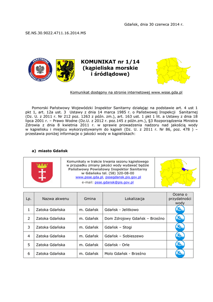Gdańsk, dnia 30 czerwca 2014 r. SE.NS.30.9022.4711.16.2014.MS KOMUNIKAT nr 1/14 (kąpieliska morskie i śródlądowe) Komunikat dostępny na stronie internetowej www.wsse.gda.pl Pomorski Państwowy Wojewódzki Inspektor Sanitarny działając na podstawie art. 4 ust 1 pkt 1, art. 12a ust. 3 Ustawy z dnia 14 marca 1985 r. o Państwowej Inspekcji Sanitarnej (Dz. U. z 2011 r. Nr 212 poz. 1263 z późn. zm.), art. 163 ust. 1 pkt 1 lit. a Ustawy z dnia 18 lipca 2001 r. – Prawo Wodne (Dz.U. z 2012 r. poz.145 z późn.zm.), §3 Rozporządzenia Ministra Zdrowia z dnia 8 kwietnia 2011 r. w sprawie prowadzenia nadzoru nad jakością wody w kąpielisku i miejscu wykorzystywanym do kąpieli (Dz. U. z 2011 r. Nr 86, poz. 478 ) – przestawia poniżej informacje o jakości wody w kąpieliskach: a) miasto Gdańsk Komunikaty w trakcie trwania sezonu kąpielowego w przypadku zmiany jakości wody wydawać będzie Państwowy Powiatowy Inspektor Sanitarny w Gdańsku tel. (58) 320-08-00 www.psse.gda.pl, pssegdansk.pis.gov.pl e-mail: [email protected] Lp. Nazwa akwenu Gmina Lokalizacja 1 Zatoka Gdańska m. Gdańsk Gdańsk - Jelitkowo 2 Zatoka Gdańska m. Gdańsk Dom Zdrojowy Gdańsk – Brzeźno 3 Zatoka Gdańska m. Gdańsk Gdańsk – Stogi 4 Zatoka Gdańska m. Gdańsk Gdańsk – Sobieszewo 5 Zatoka Gdańska m. Gdańsk Gdańsk - Orle 6 Zatoka Gdańska m. Gdańsk Molo Gdańsk - Brzeźno Ocena o przydatności wody b) miasto Sopot Komunikaty w trakcie trwania sezonu kąpielowego w przypadku zmiany jakości wody wydawać będzie Państwowy Powiatowy Inspektor Sanitarny w Sopocie tel. (58) 551-06-35 www.psse.sopot.pl e-mail: [email protected] Lp. Nazwa akwenu Gmina Lokalizacja 1 Zatoka Gdańska m. Sopot Sopot - Kamienny Potok– Koliba 2 Zatoka Gdańska m. Sopot Sopot - Łazienki Południowe Ocena o przydatności wody c) miasto Gdynia Komunikaty w trakcie trwania sezonu kąpielowego w przypadku zmiany jakości wody wydawać będzie Państwowy Powiatowy Inspektor Sanitarny w Gdyni, tel. (58) 620-17-98 e-mail: [email protected] www.psse.gdynia.pl Lp. Nazwa akwenu Gmina Lokalizacja 1 Zatoka Gdańska Gdynia Gdynia Śródmieście 2 Zatoka Gdańska Gdynia Gdynia Redłowo 3 Zatoka Gdańska Gdynia Gdynia Orłowo 4 Zatoka Gdańska Gdynia Gdynia Babie Doły Ocena o przydatności wody d) powiat słupski Komunikaty w trakcie trwania sezonu kąpielowego w przypadku zmiany jakości wody wydawać będzie Państwowy Powiatowy Inspektor Sanitarny w Słupsku, tel. (59) 843-12-91 e-mail: [email protected] www.psse.slupsk.pl Lp. Nazwa akwenu Gmina Lokalizacja 1 Morze Bałtyckie Ustka Ustka Zachód 2 Morze Bałtyckie Ustka Ustka Wschód Ocena o przydatności wody e) powiat chojnicki Komunikaty w trakcie trwania sezonu kąpielowego w przypadku zmiany jakości wody wydawać będzie Państwowy Powiatowy Inspektor Sanitarny w Chojnicach tel. (52) 397-63-95 e-mail: [email protected] www.chojniceinfo.net/sanepid Lp. Nazwa akwenu Gmina Lokalizacja 1 Jezioro Ostrowite Czersk Ostrowite Ocena o przydatności wody f) powiat człuchowski Komunikaty w trakcie trwania sezonu kąpielowego w przypadku zmiany jakości wody wydawać będzie Państwowy Powiatowy Inspektor Sanitarny w Człuchowie tel. (59) 834-11-42 e-mail: [email protected] http://www.wsse.gda.pl/bip_czluchow Lp. Nazwa akwenu Gmina 1 Jezioro Rychnowskie Człuchów 2 Jezioro Końskie Przechlewo 3 Jezioro Szczytno Rzeczenica 4 Jezioro Miejskie Debrznomiasto 5 Jezioro Dymno Koczała 6 Jezioro Żuczek Debrzno 7 Jezioro Rychnowskie Człuchów Lokalizacja Ocena o przydatnośc i wody Kąpielisko OSiR ul. Wojska Polskiego 62, 77-300 Człuchów Kąpielisko nad jeziorem Końskim w Przechlewie Kąpielisko nad jeziorem Szczytno przy Ośrodku RekreacyjnoWypoczynkowym "Rzewnica" Kąpielisko - Jezioro Staw Miejski w Debrznie Kąpielisko nad jeziorem Dymno w Koczale Kąpielisko – Jezioro Żuczek w Debrznie Kąpielisko przy Ośrodku Szkoleniowym WOPR Ględowo 3W g) powiat gdański Komunikaty w trakcie trwania sezonu kąpielowego w przypadku zmiany jakości wody wydawać będzie Państwowy Powiatowy Inspektor Sanitarny w Pruszczu Gdańskim tel. (58) 683-54-12 e-mail: [email protected] http://www.wsse.gda.pl/bip_pruszcz Lp. Nazwa akwenu Gmina Lokalizacja 1 Jezioro Przywidz Przywidz Przywidz - kąpielisko gminne przy ul. Jeziornej Ocena o przydatności wody h) powiat kościerski Komunikaty w trakcie trwania sezonu kąpielowego w przypadku zmiany jakości wody wydawać będzie Powiatowa Stacja Sanitarno-Epidemiologiczna w Kościerzynie tel. (58) 686-69-48 e-mail: [email protected] http://www.wrotapomorza.pl/pl/bip/psse/psse_koscierzyna Lp. 1 Nazwa akwenu Jezioro Garczyn 2 Jezioro Garczyn Gmina Kościerzyna Kościerzyna Lokalizacja Ocena o przydatności wody Garczyn, przy Centrum Szkoleniowo – Wypoczynkowym w Garczynie Garczyn przy Powiatowym Centrum Młodzieży w Garczynie (Komunikaty w trakcie trwania sezonu kąpielowego w przypadku zmiany jakości wody wydawać będzie Wojewódzka Stacja Sanitarno Epidemiologiczna w Gdańsku tel. (58)3447300 w 253, www.wsse.gda.pl) i) powiat lęborski Komunikaty w trakcie trwania sezonu kąpielowego w przypadku zmiany jakości wody wydawać będzie Państwowy Powiatowy Inspektor Sanitarny w Lęborku tel. (59) 862-19-28 e-mail: [email protected] http://www.wsse.gda.pl/bip_lebork Lp. Nazwa akwenu Gmina Lokalizacja 1 Morze Bałtyckie Łeba Kąpielisko przy plaży "B" 2 Morze Bałtyckie Łeba Kąpielisko przy plaży "C" Ocena o przydatności wody j) powiat malborski Komunikaty w trakcie trwania sezonu (dla powiatu malborskiego i sztumskiego) w przypadku zmiany jakości wody wydawać będzie Państwowy Powiatowy Inspektor Sanitarny w Malborku tel. (55) 647-25-55 e –mail: [email protected] http://www.wsse.gda.pl/bip_malbork Lp. Nazwa akwenu Gmina Lokalizacja 1 rzeka Nogat Malbork Kąpielisko nr 1 Malbork ul. Wileńska Ocena o przydatności wody k) powiat nowodworski Komunikaty w trakcie trwania sezonu kąpielowego w przypadku zmiany jakości wody wydawać będzie Pań