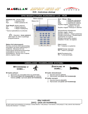 K35 - Instrukcja obsługi OPIS MANIPULATORA IKONOWEGO LCD Zasilanie AC (dioda żółta) Wł.* = Zasilanie OK Wył. = Brak zasilania AC Status partycji - K35 Arm / Sleep / Stay: Wł. = Partycja uzbrojona Wył. = Partycj rozbrojona Miga = Opóźnienie wyjścia Szybko miga†= Opóźnienie wyj. (ostatnie 10 sek.) Szybko miga†= Partycja w alarmie Status linii Tryb StayD (dioda zielona) Wł.* = StayD aktywny Wył. = StayD nieaktywny †Sygnalizacja dżwiękowa: Dźwięk ciągły= Alarm Dźwięk zmienny = Alarm pożarowy Dźwięk przerywany = Rozpoczęcie opóźnienia na wyjście Dźwięk przerywany szybki= Ostatnie 10 sek. na wyjście * Ikona wyświetlona na ekranie = Naciśnij + [KOD GŁÓWNY] aby wejść do menu szybkiego programowania. Status linii alarmowych: Numery od [1] do [32] odpowiadają wszystkim 32 liniom alarmowym w systemie. Otwarcie linii lub rozpoczęcie opóźnienia spowoduje wyświetlenie numeru linii na wyświetlaczu. Numer linii w stanie alarmu będzie migał. [TBL] Usterki Wł. = Usterka w systemie [MEM] Pamięć alarmów Wł. = Alarm w pamięci [BYP] Pomijanie linii Wł. = Linie pominięte UZBRAJANIE I ROZBRAJANIE SYSTEMU ZOSTAJĄC W DOMU... WYCHODZĄC Z DOMU... W trybie pełnym: 1. Sprawdź czy wszystkie linie są zamknięte. 2. Wprowadź [KOD UŻYTKOWNIKA]‡ lub naciśnij klawisz [ARM] i wprwadź [KOD UŻYTKOWNIKA]. W trybie obwodowym: 1. Naciśnij klawisz [STAY]. 2. Wprowadź swój [KOD UŻYTKOWNIKA]‡. W trybie nocnym: 1. Naciśnij klawisz [SLEEP]. 2. Wprowadź swój [KOD UŻYTKOWNIKA]‡. Aby rozbroić: [OFF] + [KOD UŻYTKOWNIKA]‡ ‡ Jeśli system jest podzielony na partycje, wciśnij klawisz 1 dla partycji 1 lub klawisz 2 dla partycji 2. Aby uzbroić oba klawisze wciśnij oba klawisze 1 i 2 kolejno. \ ALARMY PANIC WYŚWIETLANIE ALARMÓW Aby wysłać cichy lub głośny alarm Panic do stacji monitoringu należy przycisnąć i przytrzymać następującą kombinację klawiszy manipulatora przez 3 sekundy. Aby wyświetlić linie w alarmie które wystąpiły w czasie ostatniego uzbrojenia systemu: 1. Rozbrój system. 2. Naciśnij klawisz [MEM]. 3. Linie które były w alarmie w czasie ostatniego uzbrojenia zostaną wyświetlone. 4. Naciśnij [CLEAR] aby wyjść. Typ alarmu Panic Kombinacja klawiszy manipulatora Policyjny Medyczny Pożarowy [1] & [3] [4] & [6] [7] & [9] USTAWIENIA MANIPULATORA WYŚWIETLANIE AWARII 1. Naciśnij klawisz [TBL]. Informacja o awarii zostanie wyświetlona. (usterkom przypożądkowane są numery) 2. Zapoznaj się z informacją o awarii zawartą w instrukcji obsługi systemu. Jeśli nie jest możliwe własnoręczne usunięcie awari,iskontaktuj się z instalatorem systemu. 3. Naciśnij [CLEAR] aby wyjść. Aby wyciszyć manipulator: Naciśnij i przytrzymaj klawisz [CLEAR] przez 6 sekund aby włączyć / wyłączyć wyciszenie manipulatora. Aby zmienić stopień podświetlenia: 1. Naciśnij i przytrzymaj klawisz [S] przez 4 sekundy. 2. Ikony 1, 2, 3, 5 i 6 będą migać. 3. Naciśnij klawisz [2], następnie używaj klawiszy [S] i [T] aby dokonać zmian intensywności podświetlenia. 4. Naciśnij [CLEAR] lub [ENTER] aby wyjść. PROGRAMOWANIE POMIJANIA LINII PROGRAMOWANIE LINII GONGOWEJ Linie pominięte będą nieaktywne po uzbrojenu systemu. Linia gongowa (dźwiękowa) umożliwia sygnalizację dźwiękiem manipulatora otwarcia wybranej linii. 1. Nacisnij klawisz [BYP]. 2. Wprowadź [KOD UŻYTKOWNIKA]. 3. Wybierz dowolną linię którą chcesz pominąć wpisująć jej numer w formacie 2 cyfrowym (np: linia 3 = 03). 4. Naciśnij klawisz [ENTER] aby zapisać i wyjść. 1. Naciśnij i przytrmaj klawisz [ ]. 2. Wybierz linię, która ma zostać zdefiniowana jako gongowa wpisując jej numer w formacie 2 cyfrowym (np: 01). Programowana linia zostanie zapisana jako linia gongowa. 3. Naciśnij klawisz [ENTER] aby wyjść. OMC Industrial Sp. z o.o. Autoryzowany dystrybutor firmy Paradox ul. Rzymowskiego 30; 02-697 Warszawa tel. (22) 651-88-61; fax. (22) 642-11-21 e-mail: [email protected] www.omc.com.pl MK-8/2009 K35-IO