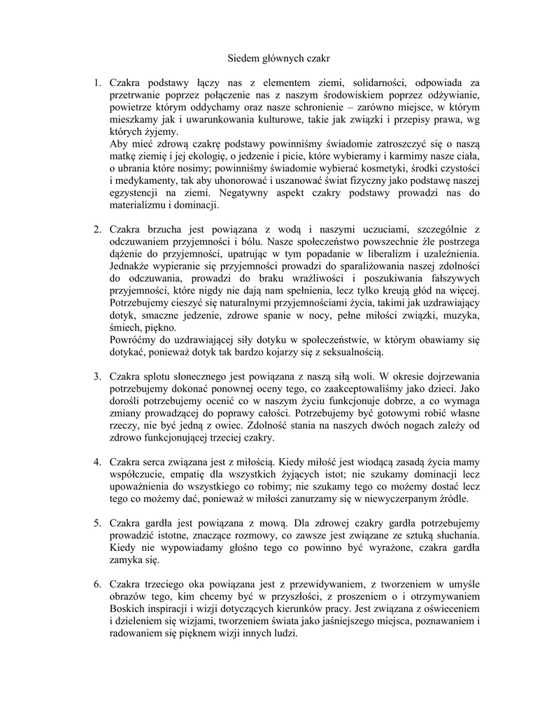 Siedem głównych czakr 1. Czakra podstawy łączy nas z elementem ziemi, solidarności, odpowiada za przetrwanie poprzez połączenie nas z naszym środowiskiem poprzez odżywianie, powietrze którym oddychamy oraz nasze schronienie – zarówno miejsce, w którym mieszkamy jak i uwarunkowania kulturowe, takie jak związki i przepisy prawa, wg których żyjemy. Aby mieć zdrową czakrę podstawy powinniśmy świadomie zatroszczyć się o naszą matkę ziemię i jej ekologię, o jedzenie i picie, które wybieramy i karmimy nasze ciała, o ubrania które nosimy; powinniśmy świadomie wybierać kosmetyki, środki czystości i medykamenty, tak aby uhonorować i uszanować świat fizyczny jako podstawę naszej egzystencji na ziemi. Negatywny aspekt czakry podstawy prowadzi nas do materializmu i dominacji. 2. Czakra brzucha jest powiązana z wodą i naszymi uczuciami, szczególnie z odczuwaniem przyjemności i bólu. Nasze społeczeństwo powszechnie źle postrzega dążenie do przyjemności, upatrując w tym popadanie w liberalizm i uzależnienia. Jednakże wypieranie się przyjemności prowadzi do sparaliżowania naszej zdolności do odczuwania, prowadzi do braku wrażliwości i poszukiwania fałszywych przyjemności, które nigdy nie dają nam spełnienia, lecz tylko kreują głód na więcej. Potrzebujemy cieszyć się naturalnymi przyjemnościami życia, takimi jak uzdrawiający dotyk, smaczne jedzenie, zdrowe spanie w nocy, pełne miłości związki, muzyka, śmiech, piękno. Powróćmy do uzdrawiającej siły dotyku w społeczeństwie, w którym obawiamy się dotykać, ponieważ dotyk tak bardzo kojarzy się z seksualnością. 3. Czakra splotu słonecznego jest powiązana z naszą siłą woli. W okresie dojrzewania potrzebujemy dokonać ponownej oceny tego, co zaakceptowaliśmy jako dzieci. Jako dorośli potrzebujemy ocenić co w naszym życiu funkcjonuje dobrze, a co wymaga zmiany prowadzącej do poprawy całości. Potrzebujemy być gotowymi robić własne rzeczy, nie być jedną z owiec. Zdolność stania na naszych dwóch nogach zależy od zdrowo funkcjonującej trzeciej czakry. 4. Czakra serca związana jest z miłością. Kiedy miłość jest wiodącą zasadą życia mamy współczucie, empatię dla wszystkich żyjących istot; nie szukamy dominacji lecz upoważnienia do wszystkiego co robimy; nie szukamy tego co możemy dostać lecz tego co możemy dać, ponieważ w miłości zanurzamy się w niewyczerpanym źródle. 5. Czakra gardła jest powiązana z mową. Dla zdrowej czakry gardła potrzebujemy prowadzić istotne, znaczące rozmowy, co zawsze jest związane ze sztuką słuchania. Kiedy nie wypowiadamy głośno tego co powinno być wyrażone, czakra gardła zamyka się. 6. Czakra trzeciego oka powiązana jest z przewidywaniem, z tworzeniem w umyśle obrazów tego, kim chcemy być w przyszłości, z proszeniem o i otrzymywaniem Boskich inspiracji i wizji dotyczących kierunków pracy. Jest związana z oświeceniem i dzieleniem się wizjami, tworzeniem świata jako jaśniejszego miejsca, poznawaniem i radowaniem się pięknem wizji innych ludzi. 7. Czakra korony związana jest ze świadomością, to punkt łączący naszą indywidualną świadomość, ponad-personalną świadomość ze świadomością Boską. Poprzez modlitwę i medytację w ich różnych formach każdy z nas w swój własny sposób jest zdolny korzystać z mądrości, która doprowadziła ewolucję do jej obecnego stanu, do stanu gdzie już dłużej nie jesteśmy istotami prowadzonymi przez Boga jak dzieci lecz stajemy się współtwórcami z Bogiem, gdzie każda nasza myśl, słowo czy czyn ma wpływ, nasze każde popadnięcie w apatię lub skupienie się na negatywach ma również silny wpływ i zdajemy sobie sprawę, że nic nie dzieje się przypadkiem, indywidualnie i wspólnie jesteśmy odpowiedzialni za to, co wydarzy się w przyszłości dla przyszłych pokoleń. Więc znajdźmy czas, by otworzyć kanały energii, którymi są czakry poprzez zadbanie o nasze ciała i nasze otoczenie, poprzez sprawienie, by nasze życie i życie innych było przyjemne, poprzez wzmocnienie naszej woli, tak by kiedy musimy odważnie głosić swoje przekonania zrobimy to z łatwością, poprzez motywowanie każdego naszego działania miłością, poprzez wysyłanie miłości, poprzez praktykowanie wizualizacji, by świadomie kreować naszą rzeczywistość, poprzez spędzenie przynajmniej jednej godziny podczas doby na medytacji/modlitwie poszukując Boskiego przewodnictwa, pokoju, miłości i harmonii w naszym życiu i w życiu tych, z którymi dzielimy nasz świat.