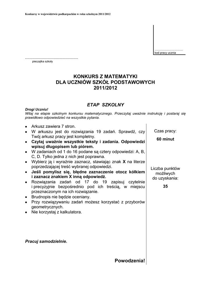 Konkursy w województwie podkarpackim w roku szkolnym 2011/2012 .................................... kod pracy ucznia ............................................. pieczątka szkoły KONKURS Z MATEMATYKI DLA UCZNIÓW SZKÓŁ PODSTAWOWYCH 2011/2012 ETAP SZKOLNY Drogi Uczniu! Witaj na etapie szkolnym konkursu matematycznego. Przeczytaj uważnie instrukcję i postaraj się prawidłowo odpowiedzieć na wszystkie pytania. Arkusz zawiera 7 stron. W arkuszu jest do rozwiązania 19 zadań. Sprawdź, czy Twój arkusz pracy jest kompletny. Czytaj uważnie wszystkie teksty i zadania. Odpowiedzi wpisuj długopisem lub piórem. W zadaniach od 1 do 16 podane są cztery odpowiedzi: A, B, C, D. Tylko jedna z nich jest poprawna. Wybierz ją i wyraźnie zaznacz, stawiając znak X na literze poprzedzającej treść wybranej odpowiedzi. Jeśli pomylisz się, błędne zaznaczenie otocz kółkiem i zaznacz znakiem X inną odpowiedź. Rozwiązania zadań od 17 do 19 zapisuj czytelnie i precyzyjnie bezpośrednio pod ich treścią, w miejscu przeznaczonym na ich rozwiązanie. Brudnopis nie będzie oceniany. Przy rozwiązywaniu zadań możesz korzystać z przyborów geometrycznych. Nie korzystaj z kalkulatora. Pracuj samodzielnie. Powodzenia! Czas pracy: 60 minut Liczba punktów możliwych do uzyskania: 35 Konkursy w województwie podkarpackim w roku szkolnym 2011/2012 Zadanie 1 (0 - 1) Które z poniższych zdań jest prawdziwe? A: Każda liczba całkowita jest liczbą naturalną. B: Każda liczba naturalna jest liczbą całkowitą. C: Każda liczba całkowita jest ujemna. D: Każda liczba przeciwna do liczby całkowitej jest liczbą naturalną. Zadanie 2 (0 - 1) Domy Ani, Bartka, Celiny i Dominiki są położone wzdłuż jednej ulicy. Odległość między domami Ani i Celiny wynosi 850 m, a między domami Bartka i Dominiki 960 m. Jaką odległość musi pokonać Bartek odwiedzając Celinę w domu, skoro Ania idąc do Dominiki pokonuje drogę 1,2 km? A: 110 m B: 0,24 km C: 0,61 km D: 350 m Zadanie 3 (0 - 1) Podczas wakacji u babci Kinga chodziła spać o półtorej godziny później niż zwykle, a wstawała trzy kwadranse później niż zwykle. Spała więc: 3 godziny krócej niż zwykle 4 3 B: o godziny dłużej niż zwykle 4 1 C: o 2 godziny krócej niż zwykle 4 1 D: o 2 godziny dłużej niż zwykle 4 A: o Zadanie 4 (0 - 1) Liczba doskonała to taka liczba naturalna, która jest równa sumie wszystkich swoich dzielników mniejszych od niej samej. Na tablicy Olek wypisał liczby: 12 16 28 Która z nich jest liczbą doskonałą? A: żadna z nich B: 12 C: 28 D: 16 Zadanie 5 (0 - 1) Pani Agatka zaprosiła cztery koleżanki na popołudniową herbatkę. Podczas spotkania zdradziła im pewną tajemnicę. Każda z tych czterech koleżanek spotkała cztery inne koleżanki i też zdradziła im tę tajemnicę. Ile osób poznało już tajemnicę Pani Agatki? A: 24 osoby B: 8 osób C: 16 osób D: 20 osób Strona 2 z 7 Konkursy w województwie podkarpackim w roku szkolnym 2011/2012 Zadanie 6 (0 - 1) Uczniowie klasy VI wycinali różnokolorowe trójkąty, które mieli przypiąć na gazetkę matematyczną. Wśród trójkątów wyciętych przez Dominikę znalazł się trójkąt równoramienny taki, że miara kąta między ramionami była o 20° mniejsza od sumy miar kątów przy podstawie. Jakie były miary kątów tego trójkąta? A: 60°, 40°, 80° B: 50°, 70°, 70° C: 40°, 100°, 40° D: 50°, 80°, 50° Zadanie 7 (0 - 1) Wzdłuż prostej ścieżki rośnie 10 drzew w odstępach co 4 metry. Jaka jest odległość pomiędzy pierwszym a ostatnim drzewem? A: 34 m B: 36 m C: 40 m D: 44 m Zadanie 8 (0 - 1) Pan Kowalski w 2010 roku obchodził swoje 23 urodziny. Ile lat będzie miał w MMXLVI roku? A: 59 B: 36 C: 47 D: 90 Zadanie 9 (0 - 2) Na targu mama kupiła kwadratową narzutę, uszytą z kawałków materiału w kształcie kwadratów i prostokątów, taką jak na rysunku obok. Policz, ile jest wszystkich kwadratów widocznych na tym rysunku. A: 14 B: 23 C: 13 D: 19 Zadanie 10 (0 - 2) Zmieszano dwa gatunki cukierków: krówki po 40 zł za kilogram i irysy po 20 zł za kilogram. Irysów było trzy razy więcej niż krówek. W sumie otrzymano 8 kg mieszanki. Jaka była cena jednego kilograma tej mieszanki? A: 25 zł B: 20 zł C: 30 zł D: 40 zł Zadanie 11 (0 - 2) Paweł podczas zawodów wykonał trzy skoki w dal. Średnia I skok arytmetyczna długości wszystkich trzech skoków wynosi 4,05 m. II skok Którą z poniższych liczb należy wpisać w puste miejsce tabeli? III skok A: 396 cm B: 4,05 m C: 414 cm 3,97 m 4 m 4 cm D: 4 m Strona 3 z 7 Konkursy w województwie podkarpackim w roku szkolnym 2011/2012 Zadanie 12 (0 - 2) Liczby w kwadratach zostały wpisane według pewnej zasady. Jaką liczbę należy wpisać w puste miejsce? A: 25 B: 14 C: 28 D: 18 Zadanie 13 (0 - 2) Basen pływacki na planie wykonanym w skali 1: 500 ma długość 4 cm. Ania wybierając się na basen postanowiła w ramach rozgrzewki przepłynąć pół kilometra. Ile razy Ania powinna przepłynąć dystans równy jednej długości basenu, aby zrealizować to postanowienie? A: 20 B: 25 C: 40 D: 50 Zadanie 14 (0 - 2) Prostokątną kartkę papieru o bokach długości 6 cm i 12 cm, Rafał najpierw złożył na trzy równe części wzdłuż przerywanych linii, a następnie wyciął dwa trójkąty (jak na rysunku). Pole zacieniowanej figury wynosi: A: 36 cm2 B: 60 cm2 C: 48 cm2 D: nie da się obliczyć Zadanie 15 (0 - 2) Kubuś Puchatek miał pełen słoik miodu. Bardzo lubił swoich przyjaciół Tygryska i Prosiaczka, dlatego podzielił się z nimi miodem. Najpierw Tygryskowi dał 1 3 zawartości słoika, a następnie Prosiaczkowi tego, co zostało w słoiku. Jaka część 3 4 początkowej ilości miodu pozostała w słoiku? A: 1 6 B: 2 3 C: 11 12 D: 1 4 Zadanie 16 (0 - 2) Na ścianie w swoim pokoju Karol namalował romb jako element dekoracji. Pole tego rombu jest równe 3,6 dm2, a jego obwód wynosi 3,6 m. Jaka jest wysokość rombu namalowanego przez Karola? 