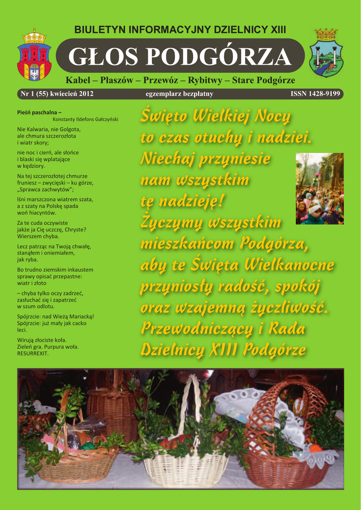 BIULETYN INFORMACYJNY DZIELNICY XIII Kabel – Płaszów – Przewóz – Rybitwy – Stare Podgórze Nr 1 (55) kwiecień 2012 Pieśń paschalna – Konstanty Ildefons Gałczyński Nie Kalwaria, nie Golgota, ale chmura szczerozłota i wiatr skory; nie noc i cierń, ale słońce i blaski się wplatające w kędziory. Na tej szczerozłotej chmurze fruniesz – zwycięski – ku górze, „Sprawca zachwytów”; lśni marszczona wiatrem szata, a z szaty na Polskę spada woń hiacyntów. Za te cuda oczywiste jakże ja Cię uczczę, Chryste? Wierszem chyba. Lecz patrząc na Twoją chwałę, stanąłem i oniemiałem, jak ryba. Bo trudno ziemskim inkaustem sprawy opisać przepastne: wiatr i złoto – chyba tylko oczy zadrzeć, zasłuchać się i zapatrzeć w szum odlotu. Spójrzcie: nad Wieżą Mariacką! Spójrzcie: już mały jak cacko leci. Wirują złociste koła. Zieleń gra. Purpura woła. RESURREXIT. egzemplarz bezpłatny ISSN 1428-9199 Święto Wielkiej Nocy to czas otuchy i nadziei. Niechaj przyniesie nam wszystkim tę nadzieję! Życzymy wszystkim mieszkańcom Podgórza, aby te Święta Wielkanocne przyniosły radość, spokój oraz wzajemną życzliwość. Przewodniczący i Rada Dzielnicy XIII Podgórze 2 GŁOS PODGÓRZA NR 1 (55) BIULETYN INFORMACYJNY DZIELNICY XIII Zaproszenie na wystawę i wykłady do Domu Kultury Podgórze. Muzeum Archeologiczne w Krakowie jest najstarszym polskim muzeum archeologicznym. Powołało je do życia Krakowskie Towarzystwo Naukowe w roku 1850. Od tego czasu nieprzerwanie działa jako instytucja naukowo-badawcza i oświatowa. Aktywnie działa na rzecz zabezpieczenia dziedzictwa archeologicznego i upowszechniania wiedzy o nim. Muzeum ma zaszczyt być jednym ze współorganizatorów „Rękawki 2012”. Jest to jeden z ważnych punktów naszego programu współpracy z Domem Kultury „Podgórze”. W tygodniu poprzedzającym Święta Wielkanocne, w siedzibie Domu Kultury Podgórze zostanie udostępniona nasza wystawa planszowa „Początki Państwa Polskiego. Życie codzienne w Małopolsce wczesnośredniowiecznej”. 10 kwietnia można ją będzie oglądać na stoisku Muzeum Archeologicznego w Krakowie pod Kopcem Kraka. Barwne ilustracje opatrzone komentarzami ukazują elementy życia codziennego naszych wczesnośredniowiecznych przodków i ich kultury. Bogata, legendarna i wczesnohistoryczna tradycja Kopca Kraka, oraz prowadzone przed II wojną światową prace wykopaliskowe zostaną zaprezentowane mieszkańcom Podgórza, którzy zechcą wysłuchać wykładu Anny Tyniec (kus- tosz Muzeum Archeologicznego w Krakowie), pt. „Kopiec Krakusa w świetle badań archeologicznych XX wieku”, w dniu 13 kwietnia 2012 r. Badania archeologiczne przeprowadzone na kopcu w latach 1934-37 uznano za nieudane, gdyż nie odkryto pozostałości pochówku. Nie brano wówczas pod uwagę możliwości istnienia pochówku popielnicowego na kurhanie (forma pochówku praktykowana przez Słowian pomiędzy wiekiem VII a czasem przyjmowania przez nich chrześcijaństwa). W dolnej części nasypu odkryto awarskie okucie końca pasa datowane na VIII w. Pojawiały się różne hipotezy o datowaniu kurhanu. Prelekcji towarzyszy prezentacja ukazująca przygotowania i przebieg prac archeologicznych. Tydzień później, 19 kwietnia 2012 r., Anna Tyniec opowie o historii i tradycji wszystkich „Wielkich kopcach Krakowa”. Kurhany (głównie będące mogiłami) wznoszono na rozległych obszarach Europy – zwłaszcza w epoce neolitu i żelaza (kultura unietycka, trzciniecka, przedłużycka, także w niektórych lokalnych grupach kultury łużyckiej), ale także w Azji i Ameryce. Rzadziej spotykane były także przez społeczności z tzw. okresu rzymskiego i we wczesnym średniowieczu. Prelegentka postara się więc odpowiedzieć na pytania: kto, kiedy i dlaczego usypał krakowskie kurhany? Wykłady odbywają się w Domu Kultury Podgórze przy ul. Sokolskiej 13. Termin wykładów: 13.04 – godz. 17.00 Wykład „Kopiec Kraka w świetle badań archeologicznych XX wieku” Prowadzenie Anna Tyniec 19.04 – godz. 17.00 Wykład „Wielkie Kopce Krakowa” Prowadzenie Anna Tyniec Kopiec Krakusa – rozpoczęcie badań wykopaliskowych w roku 1934. Fotografia archiwalna ze zbiorów Muzeum Archeologicznego w Krakowie Szczegółowe godziny i miejsce wykładów podane w są programie Domu Kultury Podgórze. Anna Tyniec Płać podatki w Krakowie Kraków jest czymś więcej niż miastem. To miejsce magiczne. Jego piękno, urok i czar znane są na całym świecie. Kraków to urocze zakątki, liczne zabytki i unikatowe w skali światowej centrum. To także europejskie centrum kultury, słynące z koncertów, przedstawień teatralnych, muzycznych festiwali. To miasto wprost wymarzone do życia! Wiedzą o tym nie tylko rodowici krakowianie, ale również Ci, którzy przyjechali tu mieszkać, studiować i pracować. Dlatego, jeśli Kraków stał się częścią Twojego życia, a wciąż nie jesteś w nim zameldowany, płać w nim podatki! Jeśli to zrobisz, zyskasz podwójnie. Podatek wróci do Ciebie w postaci lepszych dróg, bardziej nowoczesnej i usprawnionej komunikacji miejskiej, czystych osiedli i parków oraz bogatszej oferty kulturalnej. Jeśli boisz się papierkowej roboty lub wydaje Ci się to zbyt trudne i czasochłonne, wiedz, że nie ma nic prostszego! Wystarczy jedynie wypełnić aktualizację NIP-3. Dlatego, drogi mieszkańcu naszego pięknego miasta, nie pytaj co Kraków może zrobić dla Ciebie, zapytaj co Ty możesz zrobić dla Krakowa! I zapłać tu swój podatek! Przewodniczący Rady Miasta Krakowa Bogusław Kośmider BIULETYN INFORMACYJNY DZIELNICY XIII GŁOS PODGÓRZA NR 1 (55) 3 Kopiec „Krakusa” Zwyczaj sypania kopców występuje już w epoce kamienia. W epoce brązu i żelaza pojawiły się groby kurhanowe. Europejskie kopce zachowały się dość licznie i często przypominają ten nasz podgórski. Kopiec Krakusa jest jednym z większych w Europie. Natomiast jeśli chodzi o P