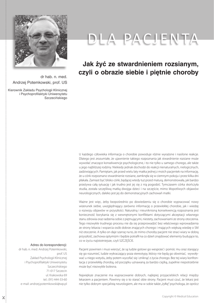 dr hab. n. med. Andrzej Potemkowski, prof. US Jak żyć ze stwardnieniem rozsianym, czyli o obrazie siebie i piętnie choroby Kierownik Zakładu Psychologii Klinicznej i Psychoprofilaktyki Uniwersytetu Szczecińskiego U każdego człowieka informacja o chorobie powoduje różnie wyrażone i nasilone reakcje. Dlatego jest zrozumiałe, że ujawnienie takiego rozpoznania jak stwardnienie rozsiane może wywołać znaczące konsekwencje psychologiczne, i to nie tylko u samego chorego, ale także u jego najbliższej rodziny. Niekiedy jednak dochodzi do reakcji nienaturalnych, nielogicznych, zadziwiających. Pamiętam, jak przed wielu laty matka jednej z moich pacjentek na informację, że u córki rozpoznano stwardnienie rozsiane, zamknęła się w ciemnym pokoju i przez kilka dni płakała. Zamiast być blisko córki, będącej wtedy tuż przed maturą, demonstrowała, jak bardzo przeżywa całą sytuację i jak trudno jest jej się z nią pogodzić. Tymczasem córka skończyła studia, została szczęśliwą matką dwojga dzieci i na szczęście, mimo kłopotliwych objawów neurologicznych, daleko jest jej do demonstracyjnych zachowań matki. Ważne jest więc, żeby bezpośrednio po dowiedzeniu się o chorobie wypracować nowy wizerunek siebie, uwzględniający zarówno informację o przewlekłej chorobie, jak i wiedzę o rozwoju objawów w przyszłości. Naturalną i nieuniknioną konsekwencją rozpoznania jest konieczność borykania się z wewnętrznymi konfliktami dotyczącymi akceptacji własnego stanu zdrowia oraz radzenia sobie z piętnującymi, niestety, zachowaniami ze strony otoczenia. Tego niezwykle trudnego procesu nie da się przeprowadzić bez właściwego wprowadzenia ze strony lekarza i wsparcia osób dobrze znających chorego i mających większą wiedzę o SM niż otoczenie. A tylko on daje szansę na to, że mimo choroby pacjent nie straci wiary w dobrą przyszłość, zachowa optymizm i będzie potrafił na co dzień znajdować elementy budujące to, co w życiu najistotniejsze, czyli SZCZĘŚCIE. Adres do korespondencji: dr hab. n. med. Andrzej Potemkowski, prof. US Zakład Psychologii Klinicznej i Psychoprofilaktyki Uniwersytetu Szczecińskiego 71-017 Szczecin ul. Krakowska 69 tel.: (91) 444-33-60 e-mail: [email protected] Pacjent powinien i musi wierzyć, że są ludzie gotowi go wesprzeć i pomóc mu oraz starający się go rozumieć, ludzie wykraczający poza stereotypy, którzy nie będą go obwiniać, wywoływać u niego wstydu, żeby potem wycofać się i zniknąć z życia chorego. Bez tej wiary konfrontacja z przewlekłą chorobą, od początku uznawaną za bardzo ciężką, zupełnie niepotrzebnie może być niezwykle bolesna. Największe znaczenie ma wypracowanie dobrych, najlepiej przyjacielskich relacji między lekarzem a pacjentem. Powinny się o to starać obie strony. Pacjent musi czuć, że lekarz jest nie tylko dobrym specjalistą neurologiem, ale ma w sobie także „żyłkę” psychologa, że oprócz Copyright © Medical Education Jak żyć ze stwardnieniem rozsianym, czyli o obrazie siebie i piętnie choroby A. Potemkowski objawów neurologicznych (to, jak pacjent chodzi, czy ma zaburzenia równowagi, jak oddaje mocz i czy coś go boli) interesuje go, czy jego podopieczny jest w dobrym nastroju, „co go gryzie”; słowem – czy żyje szczęśliwie. Z drugiej strony, wśród objawów ocenianych przez pacjenta zawsze powinny znaleźć się: poziom smutku, stopień zadowolenia z życia, obecność lęków, niepokojów. I nawet jeśli nie jest o to pytany, powinien poinformować swojego neurologa, w jakim jest stanie psychicznym. Mówiąc bardziej fachowo – pacjent nie powinien ulec stygmatyzacji, czyli, jak to określają psychologowie, poddać się labelingowi (ang. label, łatka, naklejka). Przekładając zaś na prostszy język: nie dać w swojej świadomości „przylepić sobie łatki”, że jest się ciężko, poważnie, nieuleczalnie chorym. Teorię piętna, zwłaszcza piętna choroby, wprowadzoną do psychologii w 1963 r. przez Ervinga Goffmana, autora książki zatytułowanej Piętno. Rozważania o zranionej tożsamości, należy uznać za najlepiej wyjaśniającą zachowania i odczucia osób naznaczonych „innością”, dotkniętych chorobami, a zwłaszcza tymi, których objawy są łatwo dostrzegane przez otoczenie. Zgodnie z tą teorią termin piętno występuje w świadomości społecznej, czyli u wszystkich obserwujących chorych na stwardnienie rozsiane, w dwóch znaczeniach. Pierwsze oznacza stan dyskredytujący daną osobę z powodu objawów, zwłaszcza tych „wstydliwych” (np. zaburzeń równowagi, niezręczności związanej z tzw. zaburzeniami móżdżkowymi czy zaburzeniami w oddawaniu moczu). Drugie zaś to szczególny rodzaj relacji między piętnującym a społecznie uznanym, trwałym stereotypem. I tu nie wolno choremu na SM się poddawać. Przykład: doświadczona i bardzo lubiana przez uczniów chora na SM nauczycielka języka angielskiego została zwolniona z pracy, ponieważ gdy chodziła po szkole, zataczała się z powodu objawów móżdżkowych. Rodzice obserwujący nauczycielkę zgłaszali swoje zastrzeżenia. Dyrekcja uznała, że „pewnie spożywa alkohol” i taka „łatka” została jej przypięta. Tymczasem chora nie informowała otoczenia o chorobie. Wstydziła się też korzystać z laski, bo „jak takiej młodej osobie chodzić z laską”, czyli pozwoliła na potraktowanie siebie jak pijanej. Gdyby skorzystała z pomocy ortopedycznej, nikt nie pomyślałby w jej przypadku o „nadużywaniu alkoholu”. Chora zrozumiała swój błąd – korzysta z laski, a po moich negocjacjach z dyrekcją została przywrócona do pracy ku radości uczniów. Zdarza się też, że chorzy odbierają chorobę jako rodzaj kary. Często stawiają pytanie: dlaczego zostałem pokarany? O rozumieniu choroby jako karzącego piętna decyduje przede wszystkim poziom wiedzy o chorobie oraz społeczny odbiór związanych z ni