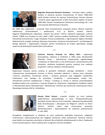 Nagroda Honorowa: Bernard Kouchner – francuski lekarz, polityk, działacz w obszarze pomocy humanitarnej. W latach 1988-2010 pełnił funkcje ministra ds. pomocy humanitarnej, ministra zdrowia i ministra spraw zagranicznych w kilku francuskich rządach. W latach 1999-2001 Wysoki Przedstawiciel Sekretarza Generalnego NZ i szef Tymczasowej Administracji w Kosowie. Od 1968 roku organizator i uczestnik misji humanitarnych niosących pomoc ofiarom katastrof nuklearnych, przemysłowych i politycznych, m.in. w Biafrze, Jordanii, Libanie, Sajgonie. Współzałożyciel organizacji „Lekarze bez granic” (1971), założyciel organizacji „Lekarze świata” (1980) oraz fundacji na rzecz walki z AIDS i pomocy osobom bezdomnym (1993). Rzecznik interwencji humanitarnej. Z jego inicjatywy Francja przedstawiła, a Zgromadzenie Ogólne Narodów Zjednoczonych przyjęło rezolucję dotyczącą stworzenia „korytarzy humanitarnych” umożliwiających dostęp lekarzom i organizacjom niosącym pomoc humanitarną do krajów ogarniętych pożogą wojenną lub dotkniętych katastrofami naturalnymi. *** Centrum Pomocy Prawnej im. Haliny Nieć – organizacja pozarządowa, założona w Krakowie w 2002 przez absolwentów Wydziału Prawa i Administracji Uniwersytetu Jagiellońskiego z inicjatywy dr Haliny Nieć w celu promowania i poszanowania praw człowieka, udzielania bezpłatnej pomocy prawnej oraz realizacji projektów z zakresu edukacji i demokratyzacji. Organizacja świadczy pomoc prawną w sprawach cywilnych, pomaga uchodźcom i innym cudzoziemcom poszukujących ochrony w Polsce, prowadzi szkolenia z zakresu praw człowieka i ochrony uchodźców, monitoruje areszty i przejścia graniczne pod względem standardów traktowania oraz dostępu do procedury uchodźczej i przestrzegania zasady nonrefoulement. Centrum współpracuje z Policją i Fundacją La Strada w zakresie przeciwdziałania handlowi ludźmi oraz uczestniczy z pracach Zespołu ds. Zwalczania i Zapobiegania Handlowi Ludźmi w Ministerstwie Spraw Wewnętrznych i Administracji. Centrum jest partnerem wykonawczym Biura Wysokiego Komisarza NZ ds. Uchodźców. *** Hassan Omar Hassan – prawnik, działacz na rzecz budowy społeczeństwa obywatelskiego w Kenii. Wiceprzewodniczący Kenijskiej Komisji Obrony Praw Człowieka. Założyciel Muzułmańskiej Rady Konsultacyjnej i „Muungano wa Mageuzi” („Ruchu na Rzecz Zmian”), których celem było wzmacnianie procesów demokratycznych i doprowadzenie do wyborów powszechnych w roku 2002. Szczególnie zaangażowany w działania na rzecz zwalczania podziałów etnicznych, religijnych i kulturowych, wykorzystywanych dla osiągania doraźnych celów politycznych. Rzecznik ochrony praw kobiet oraz poprawy warunków w obozach dla uchodźców zlokalizowanych w Kenii. Orędownik zmian konstytucyjnych, reform politycznych i programu ochrony świadków.