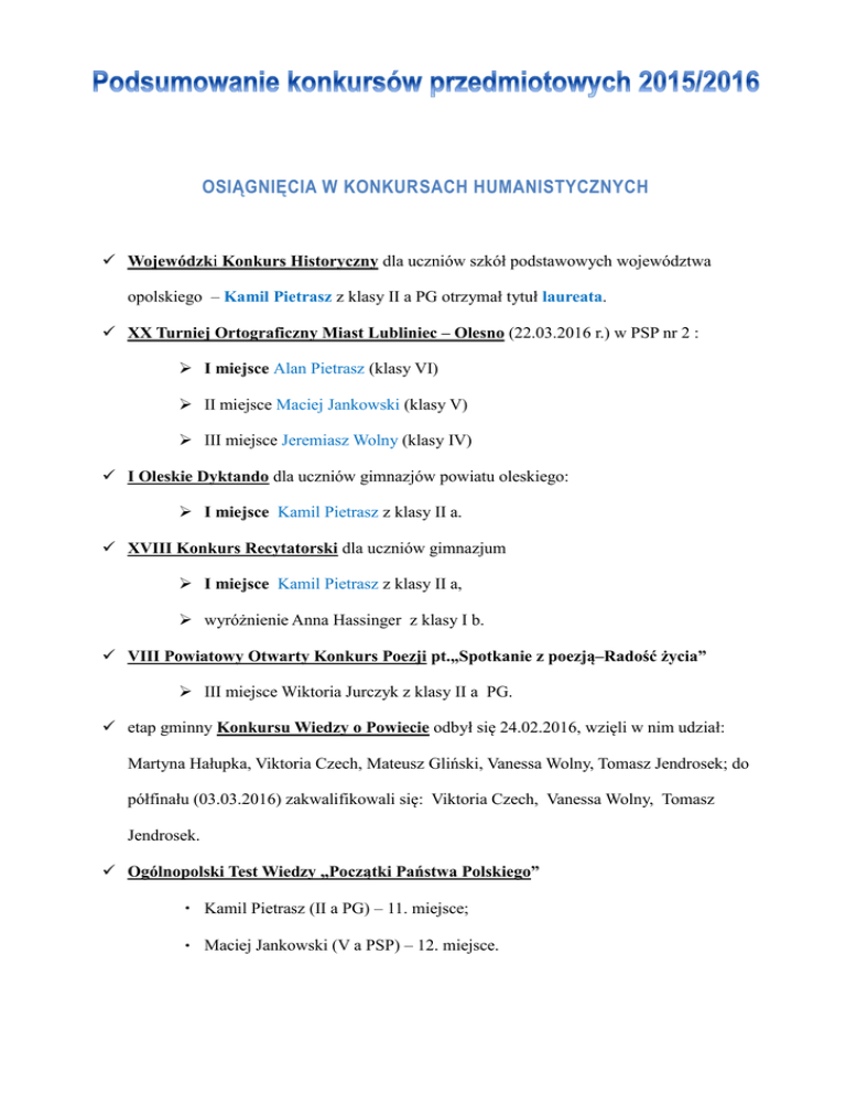 OSIĄGNIĘCIA W KONKURSACH HUMANISTYCZNYCH Wojewódzki Konkurs Historyczny dla uczniów szkół podstawowych województwa opolskiego – Kamil Pietrasz z klasy II a PG otrzymał tytuł laureata. XX Turniej Ortograficzny Miast Lubliniec – Olesno (22.03.2016 r.) w PSP nr 2 : I miejsce Alan Pietrasz (klasy VI) II miejsce Maciej Jankowski (klasy V) III miejsce Jeremiasz Wolny (klasy IV) I Oleskie Dyktando dla uczniów gimnazjów powiatu oleskiego: I miejsce Kamil Pietrasz z klasy II a. XVIII Konkurs Recytatorski dla uczniów gimnazjum I miejsce Kamil Pietrasz z klasy II a, wyróżnienie Anna Hassinger z klasy I b. VIII Powiatowy Otwarty Konkurs Poezji pt.„Spotkanie z poezją–Radość życia” III miejsce Wiktoria Jurczyk z klasy II a PG. etap gminny Konkursu Wiedzy o Powiecie odbył się 24.02.2016, wzięli w nim udział: Martyna Hałupka, Viktoria Czech, Mateusz Gliński, Vanessa Wolny, Tomasz Jendrosek; do półfinału (03.03.2016) zakwalifikowali się: Viktoria Czech, Vanessa Wolny, Tomasz Jendrosek. Ogólnopolski Test Wiedzy „Początki Państwa Polskiego” Kamil Pietrasz (II a PG) – 11. miejsce; Maciej Jankowski (V a PSP) – 12. miejsce. KONKURSY RELIGIJNE Diecezjalny Konkurs Wiedzy Religijnej ŻAK 2016 - Alicja Stróżyk (VIb) uzyskała tytuł finalistki JĘZYK NIEMIECKI I JĘZYK MNIEJSZOŚCI NARODOWEJ NIEMIECKI PSP Konkurs kolęd i pastorałek w ramach „VI Święta Piernika” (etap powiatowy): Kategoria I- III PSP Soliści: 1. miejsce - Paweł Landsman (opiekun Aneta Moj) Zespoły: 1. miejsce - Zespół Klas IIIa,b (opiekun Aneta Moj) 2. miejsce - Zespół Klasy Ia (opiekun Edyta Polak) Kategoria IV- VI PSP Soliści: 2. Miejsce-Julia Kustra ( opiekun Aneta Moj) 3. miejsce-Samuel Kassner (opiekun Elżbieta Neukirch) Zespoły: 2. Miejsce-Zespół z klasy Va (opiekun Aneta Moj) Kategoria I-III PG Zespoły: 1. miejsce-Weronika Kik & Bettina Holik (opiekun Jolanta Lebiedzińska- Dziób) 2. miejsce-Miriam Janicka & Martyna Lissy (opiekun Karina Rataj) „Opolski Konkurs Piosenki Bożonarodzeniowej” finaliści tego konkursu to: Amelie Reu, Julia Kustra, Aneta Grabińska, Natalia Oblonk, Paweł Landsman(opiekun Aneta Moj) Konkurs Piosenki Niemieckojęzycznej „Młodzież śpiewa niemieckojęzyczne piosenki” (etap powiatowy) Klasy I-III Soliści Zespoły I miejsce – Julia Zielonka–opiekun B. Żakowska I miejsce – Klasa IIIb – opiekun Aneta Moj II miejsce – Klasa Ia –opiekun Edyta Polak Klasy IV-VI Soliści II miejsce – Julia Skibińska–VIa-opiekun Elżbieta Neukirch Zespoły III miejsce – Zespół IVa „Familienfoto” – opiekun Beata Chrzęstek Gimnazjum Soliści I miejsce – Weronika Kik – opiekun Jolanta Lebiedzińska – Dziób II miejsce – Miriam Janicka – opiekun Karina Rataj III miejsce – Zuzanna Skibińska – opiekun Jolanta Lebiedzińska – Dziób Konkurs recytatorski w języku niemieckim „Młodzież recytuje poezję” (etap wojewódzki) PSP Julia Skibińska- zakwalifikowała się do finału konkursu PG Zuzanna Skibińska- 3. miejsce w finale Wielkie Wojewódzkie Dyktando Języka Niemieckiego dla uczniów PSP i PG finalistą konkursu został uczeń szkoły podstawowej Samuel Kassner) XVII Ogólnopolski Konkurs Języka Niemieckiego Sprachdoktor PSP Klasy czwarte Marek Janicki–1. miejsce w województwie, 4 w kraju Emilia Karkos- 3. miejsce w województwie, 13. w kraju Fabian Hober – 10. miejsce w województwie Klasy piąte Jakub Paliwoda- 3. miejsce w województwie, 9. w kraju Maksimilian Czech- 4. miejsce w województwie Maksymilian Rataj- 5. miejsce w województwie Patryk Ceglarek – 6. miejsce w województwie Klasy szóste Samuel Kassner- 4. miejscew województwie Michał Konieczny- 6. miejsce w województwie PG Klasy pierwsze Maximilian Häusler-1. miejsce w województwie, 5. w kraju Iga Wawrzyniak- 2. miejsce w województwie, 11. w kraju Miriam Janicka- 3. miejsce w województwie, 12. w kraju KathrinPosor- 5. miejsce w województwie Piotr Gajek- 6. miejsce w województwie Marta Respondek- 10. miejsce w województwie Jan Flak-10. miejsce w województwie Klasy drugie Viktoria Czech- 4. miejsce w województwie, 5. w kraju Florian Marzec- 7. miejsce w województwie, 11. w kraju Klasy trzecie Marcin Lisoń -4. miejsce w województwie, 7. w kraju Anna Wachowska- 7. miejsce w województwie Marta Woźny- 9. miejsce w województwie Bruno Kniejski- 9. miejsce w województwie Konkurs Angielsko-Niemiecki dla gimnazjalistów Województwa Opolskiego „O puchar Dyrektora ZSO Nr II w Opolu” Iga Wawrzyniak- finalistka konkursu CHEMIA Magdalena Pieknik-Janiszewska kl. IIIb: laureatka XVI Wojewódzkiego Konkursu Chemicznego; II miejsce w województwie i VII w kraju w Ogólnopolskim Konkursie Chemicznym „Alchemik”. Sonia Jendrak kl. IIIb: Wyróżnienie w Ogólnopolskim Konkursie Chemicznym „Alchemik”; II miejsce w etapie gminnym XVI Wojewódzkiego Konkursu Chemicznego; MATEMATYKA Wojewódzki Konkurs Matematyczny dla uczniów szkół podstawowych Etap szkolny Uczestników: 9 Uczniowie zakwalifikowani do etapu gminnego: Tobiasz Flak– klasa VIa Samuel Kassner – klasa VIa Alan Pietrasz – klasa VIa Uczniowie nie zakwalifikowali się do etapu wojewódzkiego Wojewódzki Konkurs Matematyczny dla uczniów gimnazjum Etap szkolny Uczestników: 18 Uczniowie zakwalifikowani do etapu gminnego: Natalia Kierat – klasa IIIa Alicja Hassinger – klasa IIIb Magdalena Pieknik - Janiszewska – klasa IIIb Uczennice nie zakwalifikowały się do etapu wojewódzkiego Mistrzostwa w Rozwiązywaniu Łamigłówek Szkoła Podstawowa – etap szkolny Uczestników: 30 Uczniowie zakwalifikowani do następnego etapu: 1. Jan Widera – IVb 2. Alan Pietrasz – VIa Gimnazjum – etap szkolny Uczestników: 42 Uczniowie zakwalifikowani do następnego etapu: 1. Natalia Kierat –IIIa 2. Mateusz Rataj – IIb Finał rejonowy (54 uczniów z 23 szkól podstawowych i gimnazjów) Natalia Kierat – III miejsce wśród uczniów gimnazjum Międzynarodowy Konkurs matem