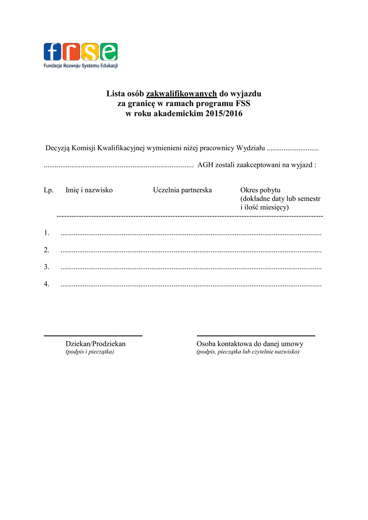 Lista osób zakwalifikowanych do wyjazdu za granicę w ramach programu FSS w roku akademickim 2015/2016 Decyzją Komisji Kwalifikacyjnej wymienieni niżej pracownicy Wydziału ............................ ................................................................................. AGH zostali zaakceptowani na wyjazd : Lp. Imię i nazwisko Okres pobytu (dokładne daty lub semestr i ilość miesięcy) ------------------------------------------------------------------------------------------------------------ 1. ............................................................................................................................................. 2. ............................................................................................................................................. 3. ............................................................................................................................................. 4. ............................................................................................................................................. ---------------------------------------Dziekan/Prodziekan (podpis i pieczątka) Uczelnia partnerska -----------------------------------------------Osoba kontaktowa do danej umowy (podpis, pieczątka lub czytelnie nazwisko)