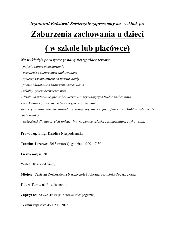 Szanowni Państwo! Serdecznie zapraszamy na wykład pt: Zaburzenia zachowania u dzieci ( w szkole lub placówce) Na wykładzie poruszone zostaną następujące tematy: - pojęcie zaburzeń zachowania - uczniowie z zaburzonym zachowaniem - systemy wychowawcze na terenie szkoły - prawo oświatowe a zaburzenia zachowania - szkolny system bezpieczeństwa - działania interwencyjne wobec uczniów przejawiających trudne zachowania - przykładowe procedury interwencyjne w gimnazjum -przyczyny zaburzeń zachowania ( urazy psychiczne jako jeden ze skutków zaburzenia zachowania) - wskazówki dla nauczycieli (między innymi pomoc dziecku z zaburzeniami zachowania) Prowadzący: mgr Karolina Niespodziańska Termin: 4 czerwca 2013 (wtorek), godzina 15.00 -17.30 Liczba miejsc: 30 Wstęp: 10 zł ( od osoby) Miejsce: Centrum Doskonalenia Nauczycieli Publiczna Biblioteka Pedagogiczna Filia w Turku, ul. Piłsudskiego 1 Zapisy: tel. 63 278 49 40 (Biblioteka Pedagogiczna) Termin zapisów: do 02.06.2013